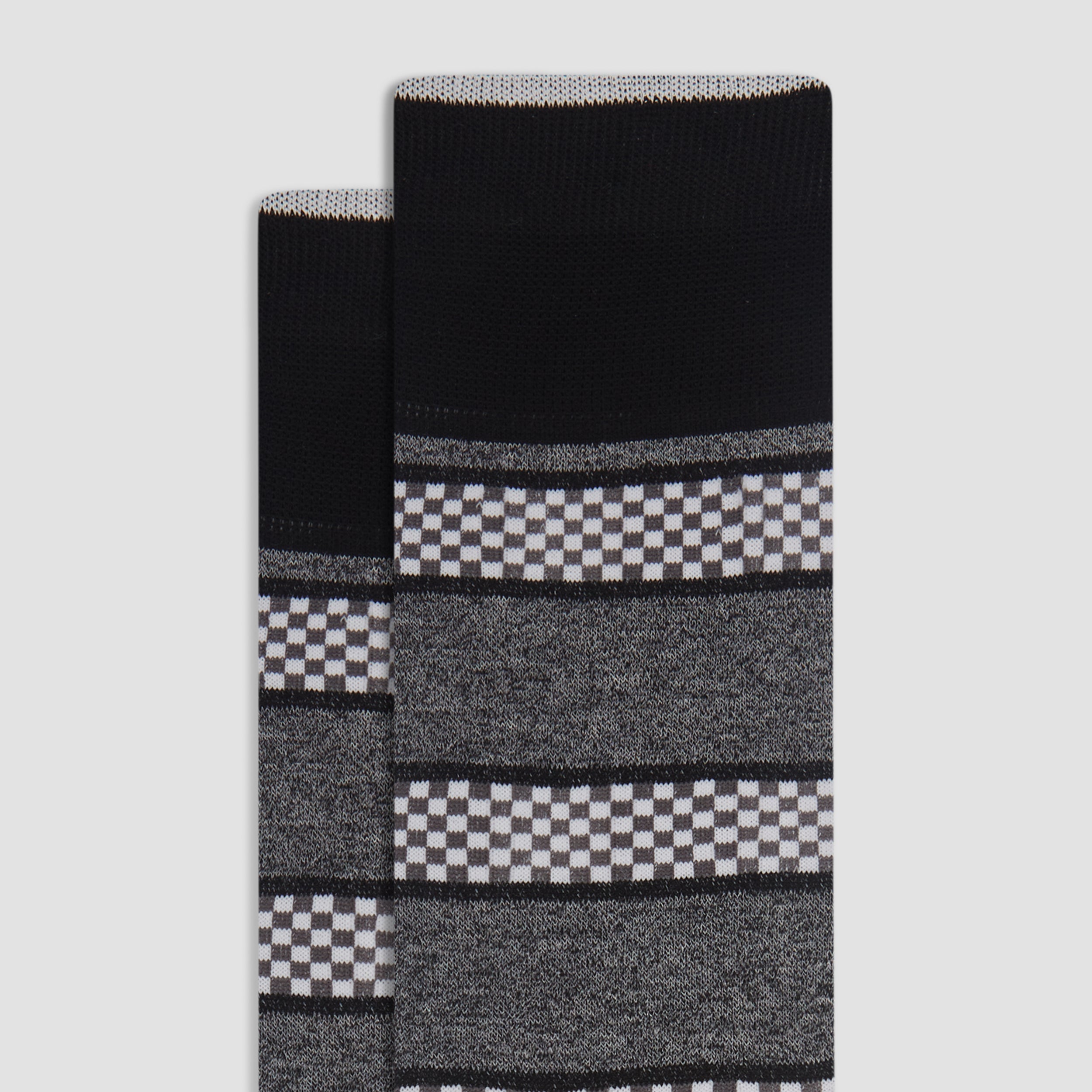Checkerboard stripe mid-calf socks in fine gauge mercerized cotton blend with rib knit cuff band, hand linked toe and reinforced heel seams. Made in Italy.