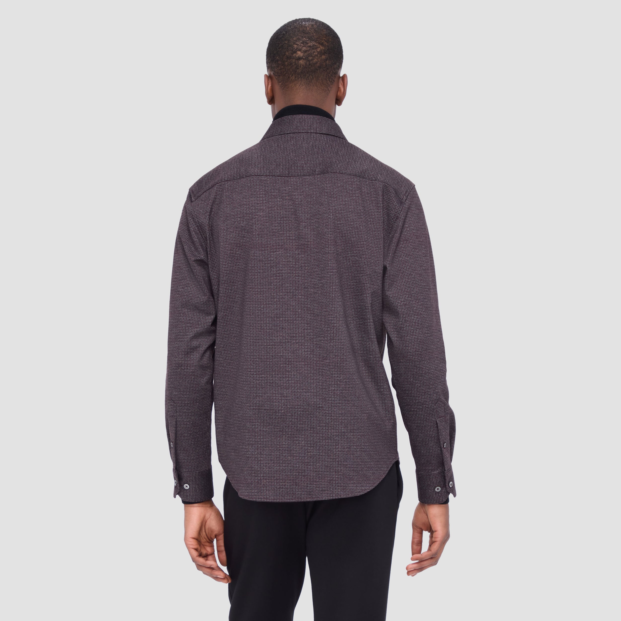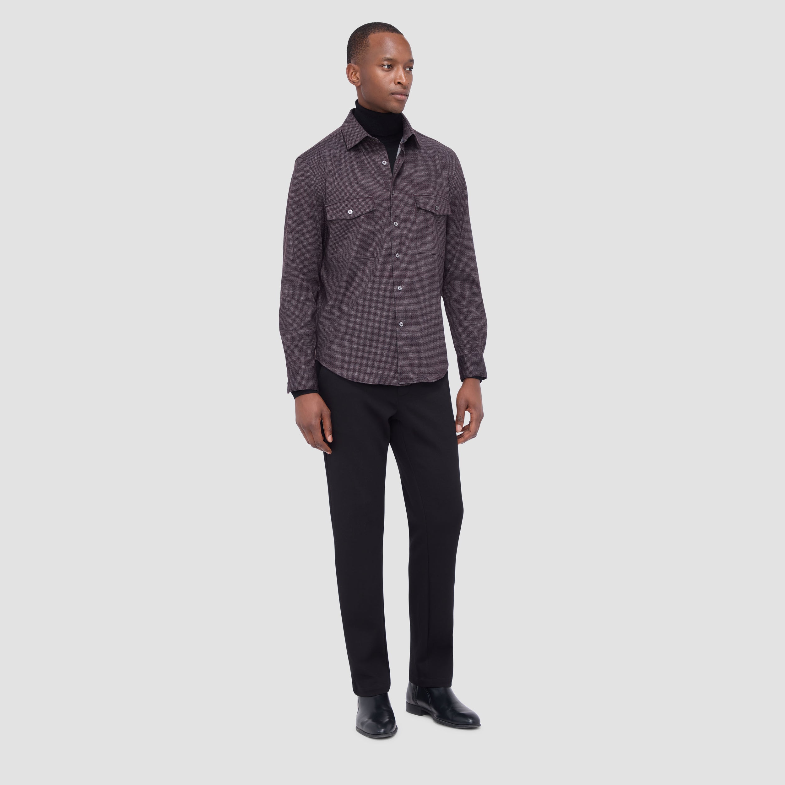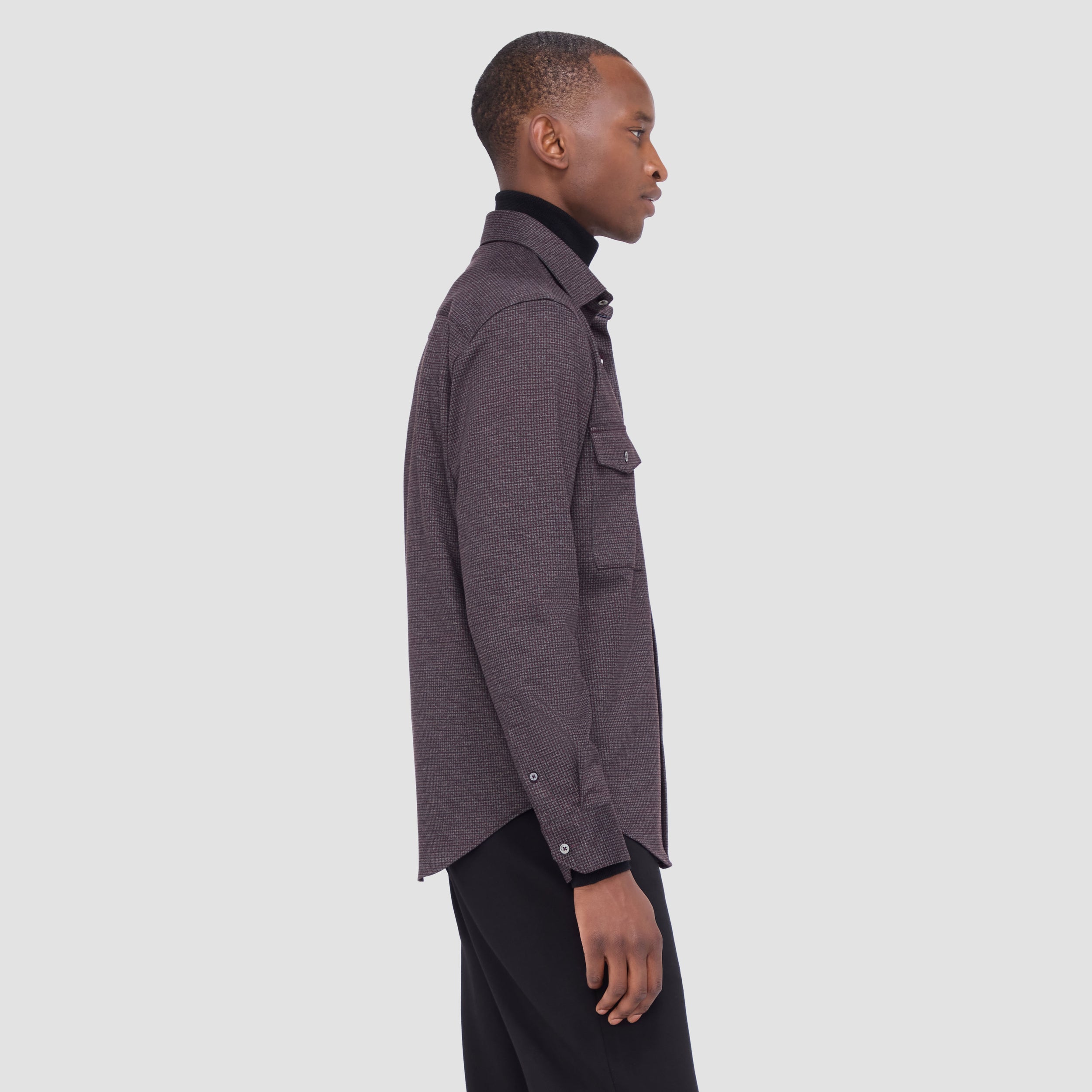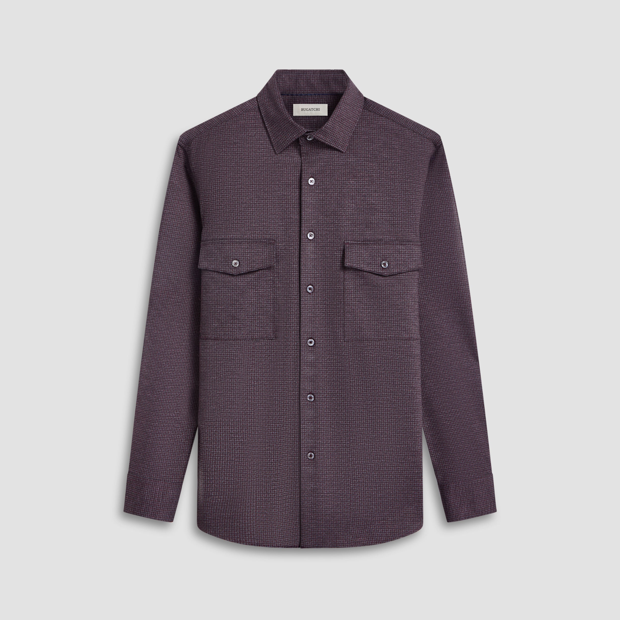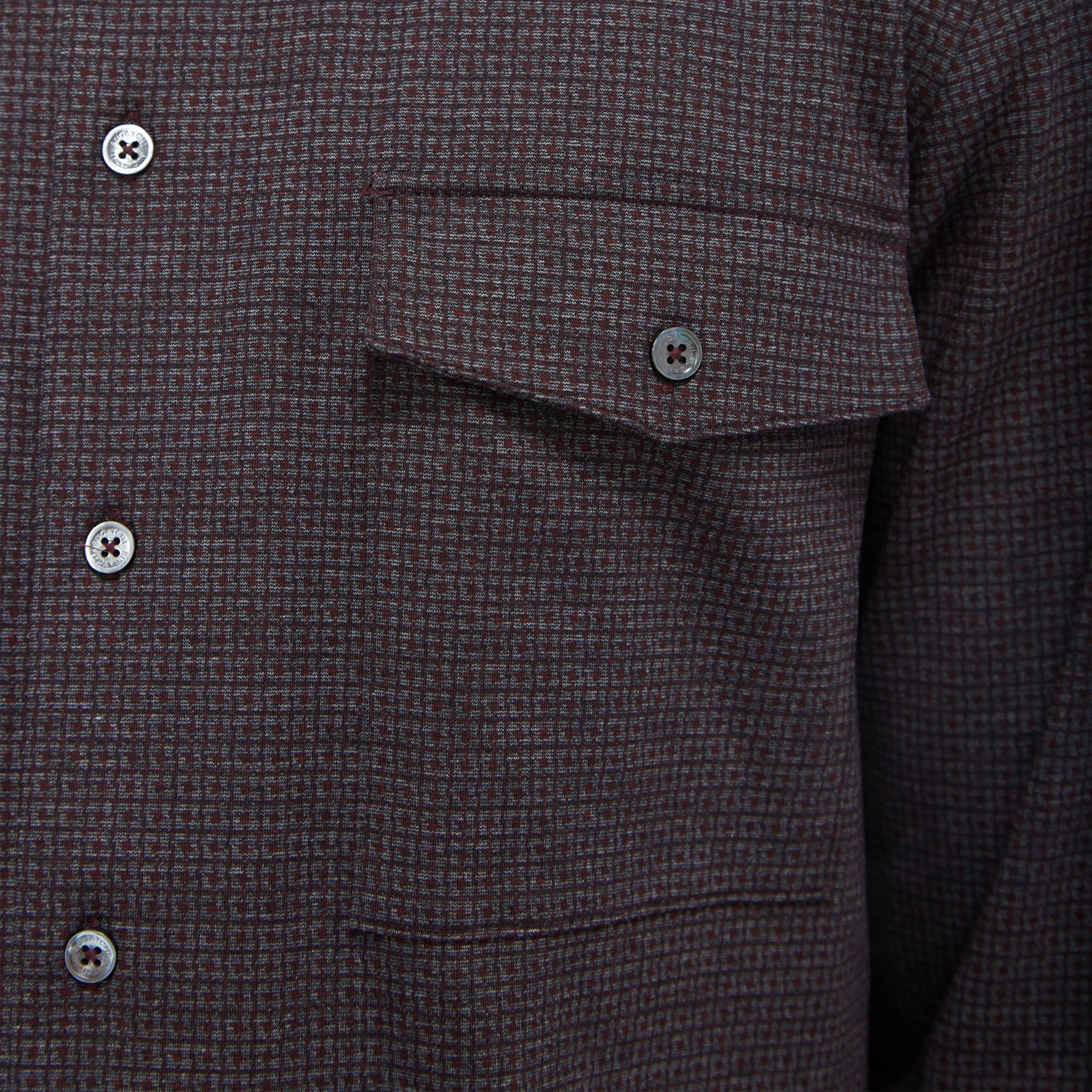 This classic shirt jacket, featuring a refined small check pattern is crafted from premium stretch knit fabric and features a point collar, full button closure with mother-of-pearl buttons, and two chest pockets with buttoned flaps. Ideal for everyday casual wear and semi-formal occasions alike.