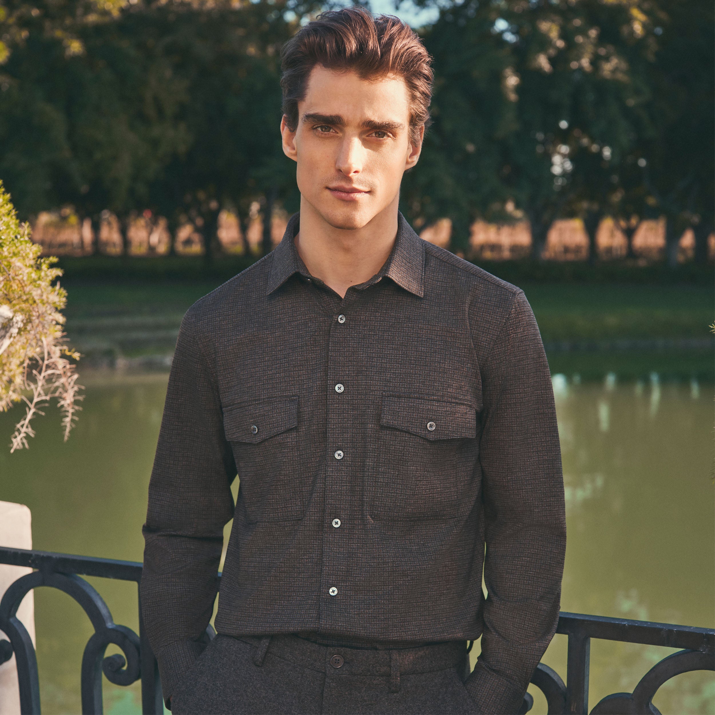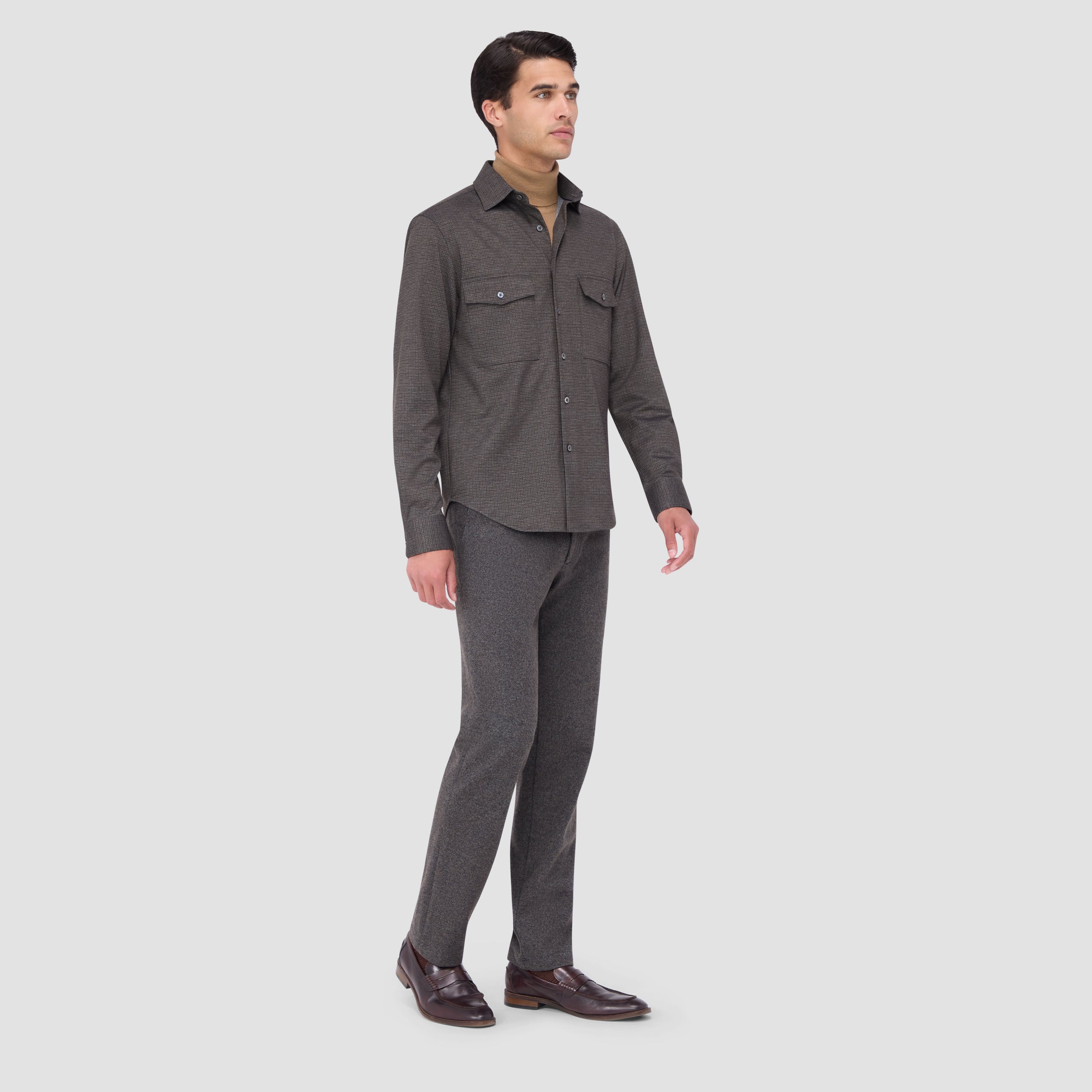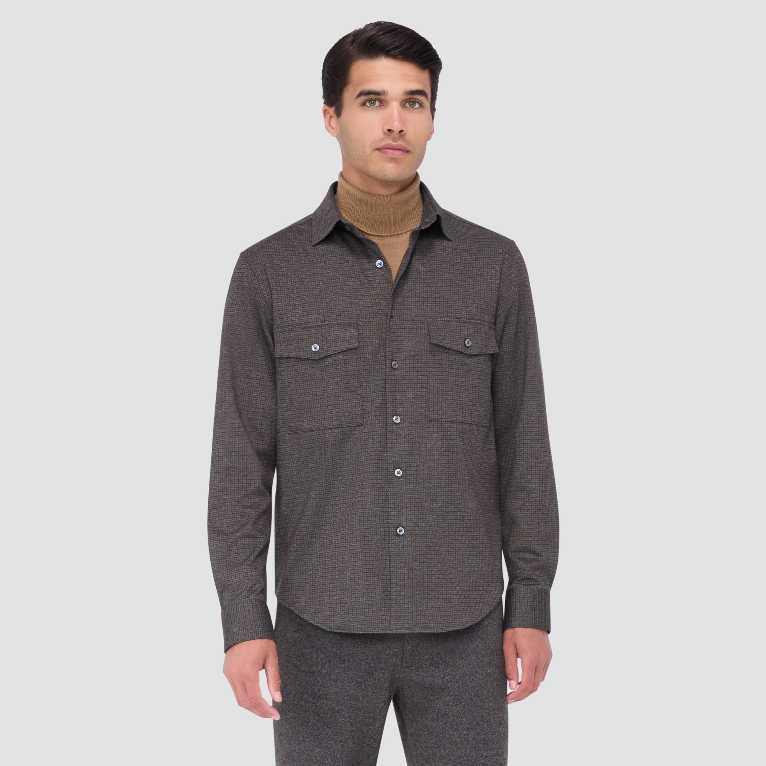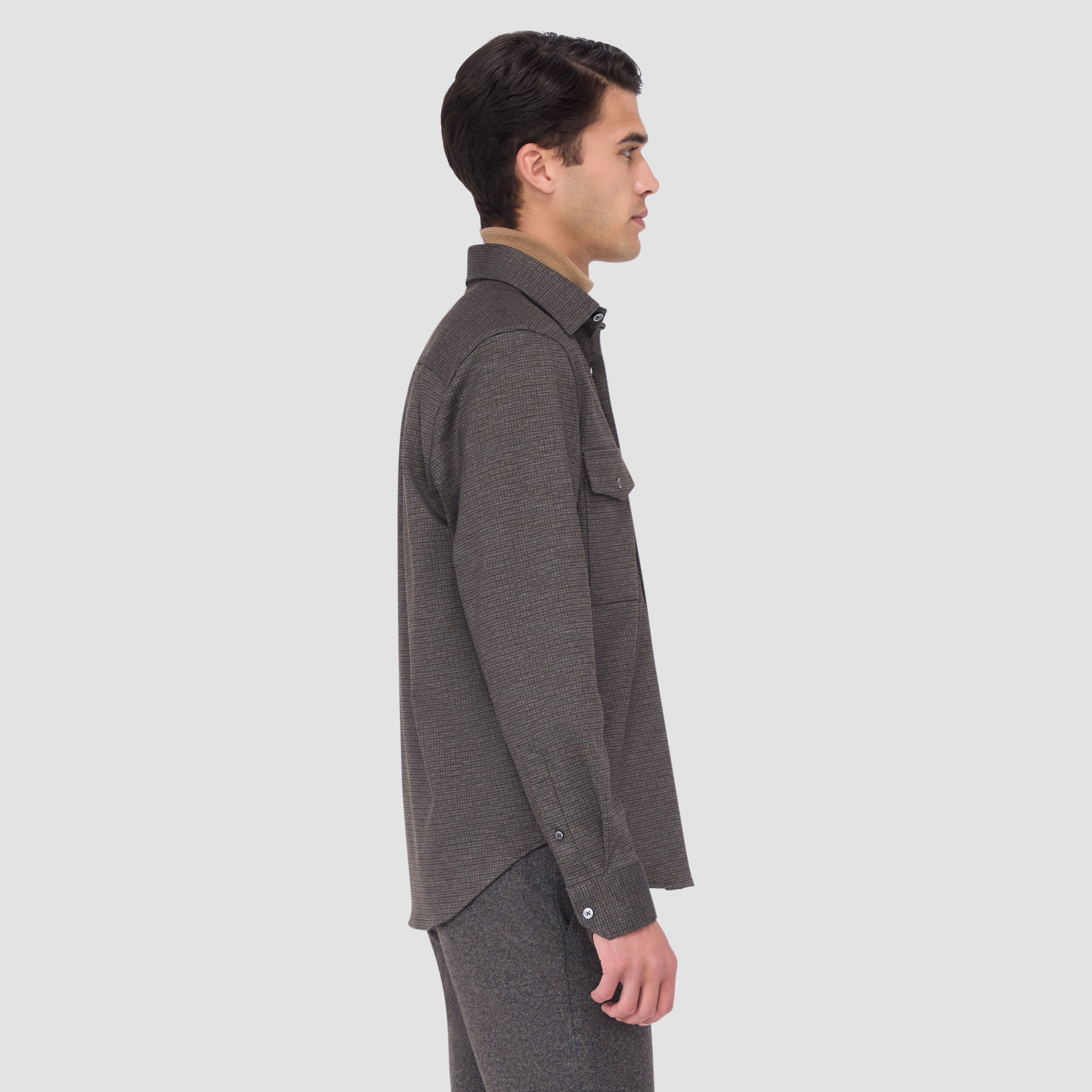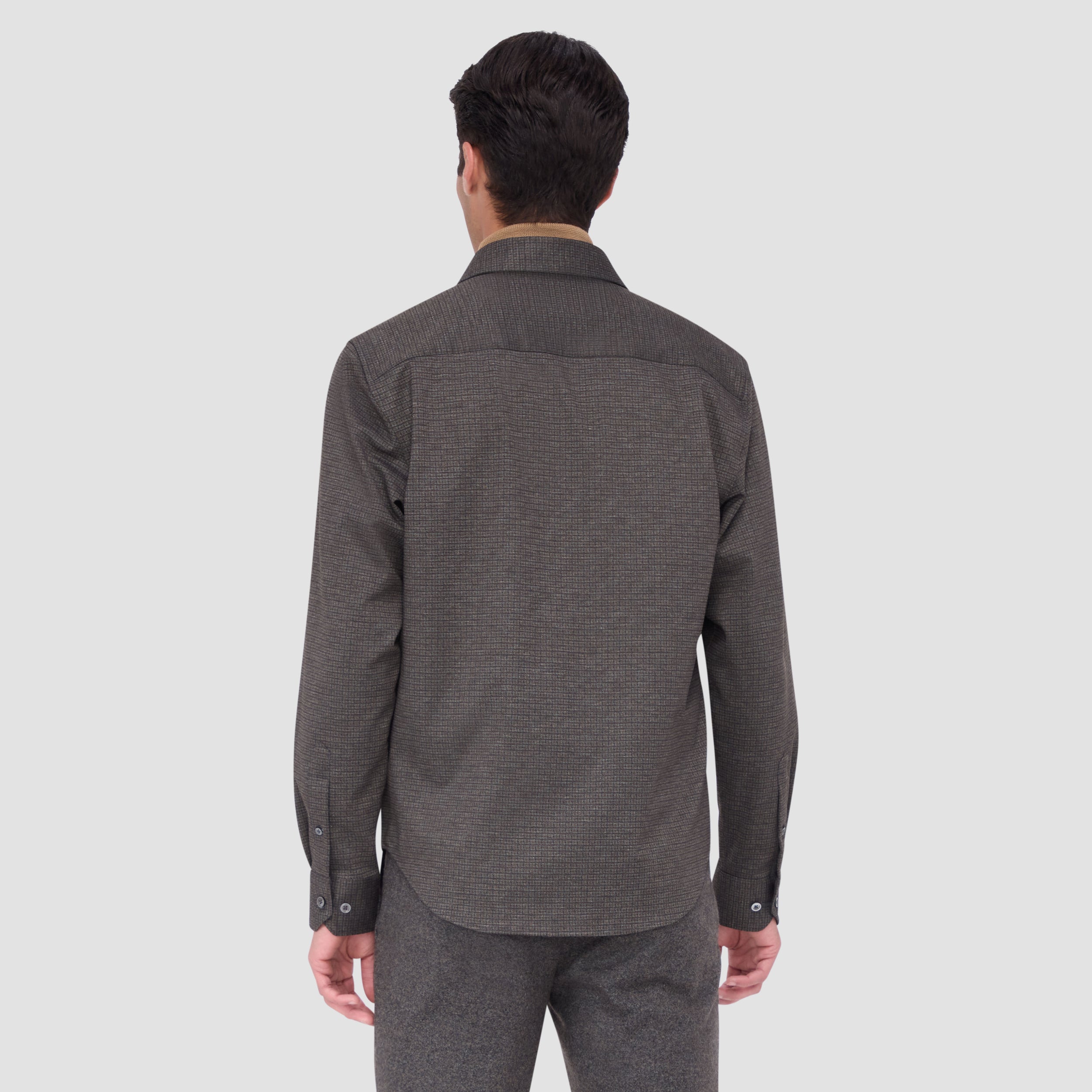 This classic shirt jacket, featuring a refined small check pattern is crafted from premium stretch knit fabric and features a point collar, full button closure with mother-of-pearl buttons, and two chest pockets with buttoned flaps. Ideal for everyday casual wear and semi-formal occasions alike.