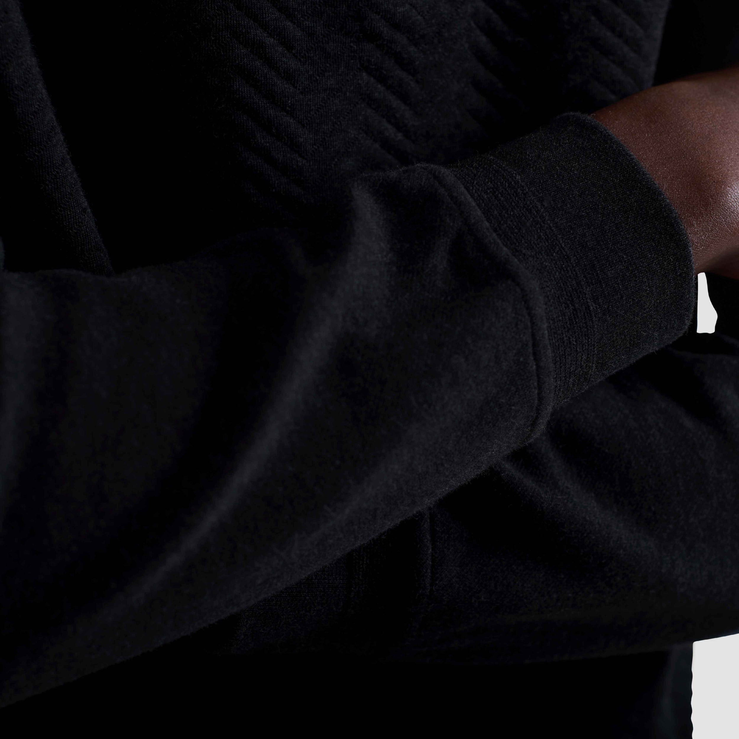 Crafted in a soft cotton blend, this quarter-zip pullover features a subtle melange chevron pattern across the front, contrasted by solid melange sleeves, back, and collar. The zipper placket includes a protective zipper guard for added comfort. Finished with elasticized rib cuffs and waist with a distinctive patterned detail, it offers a refined casual look.