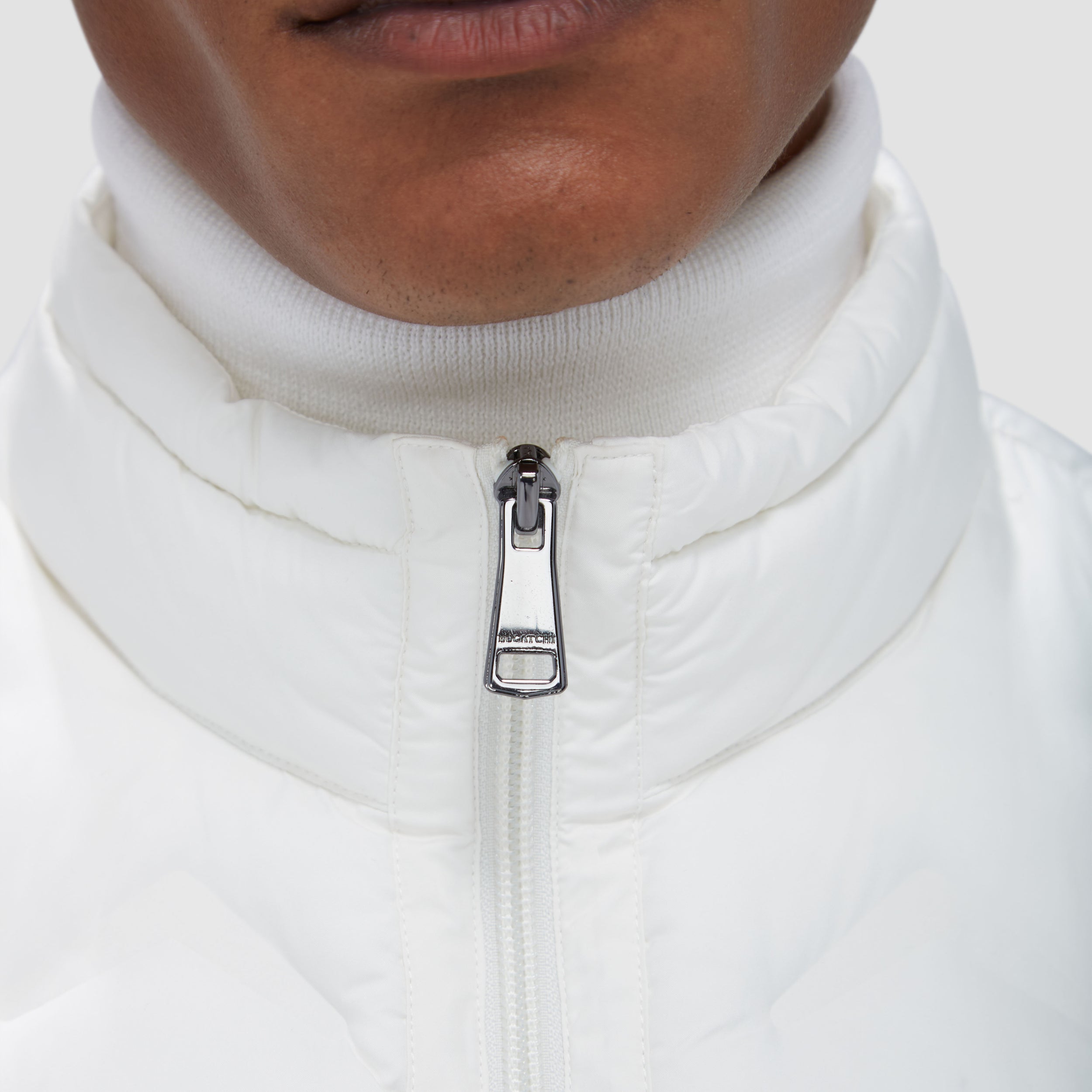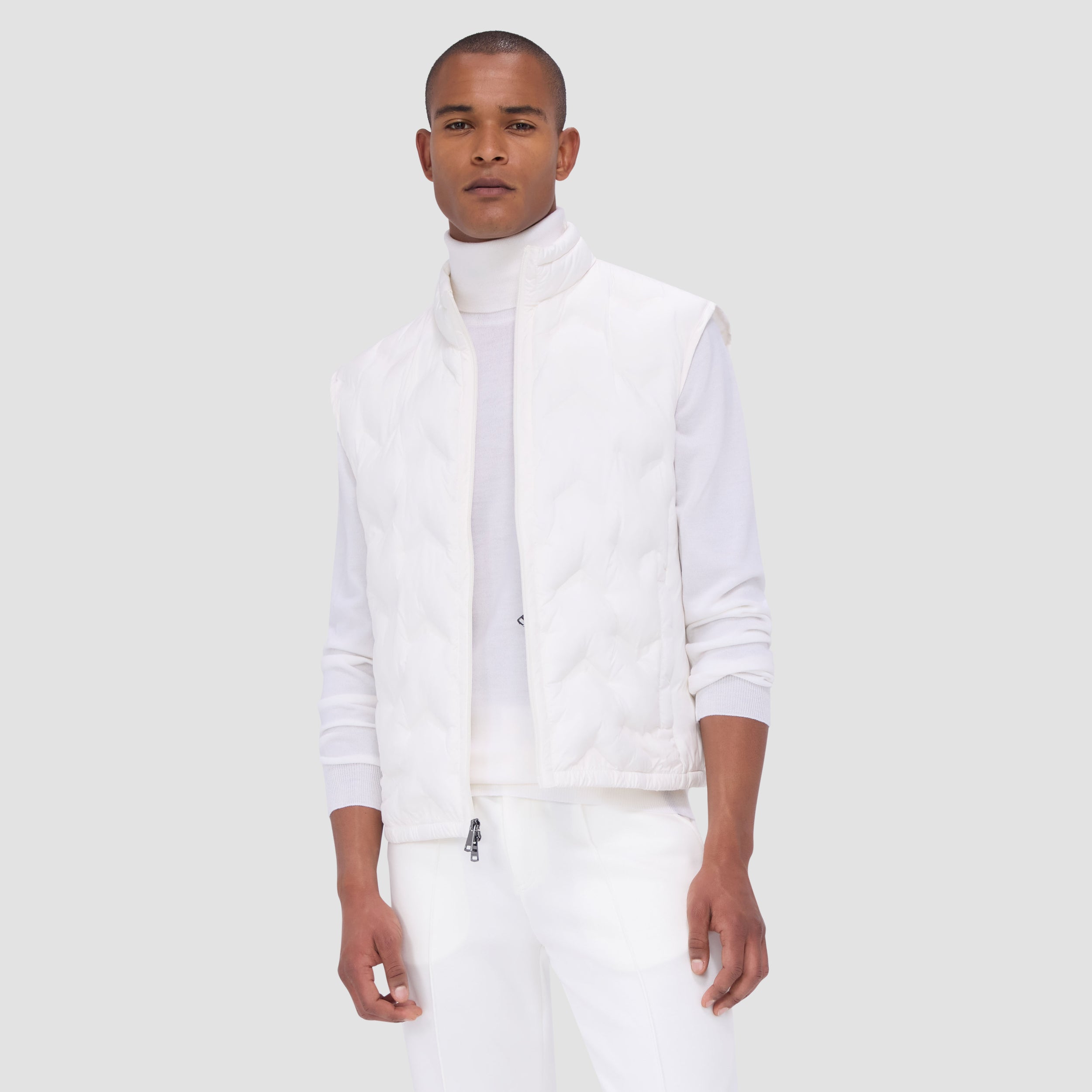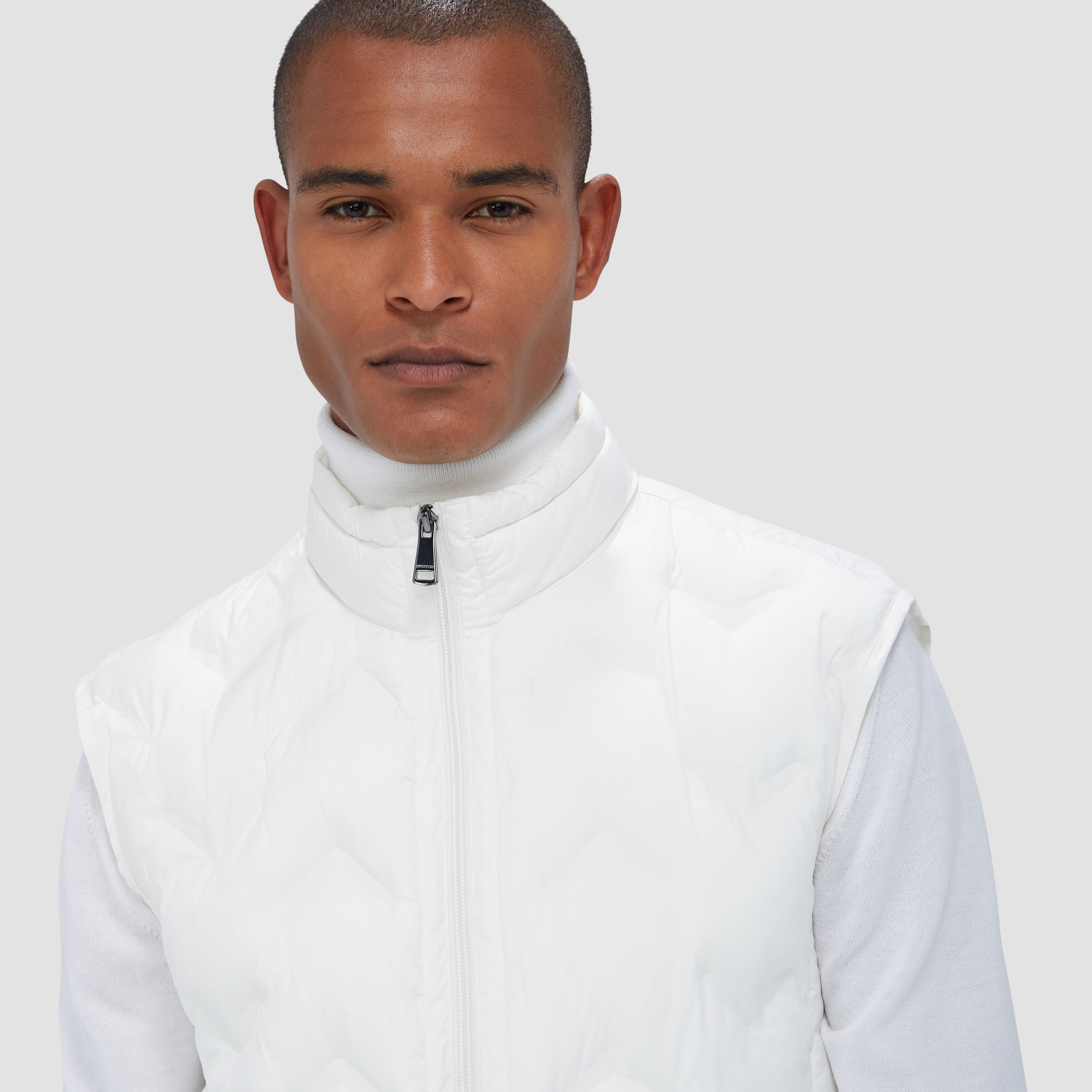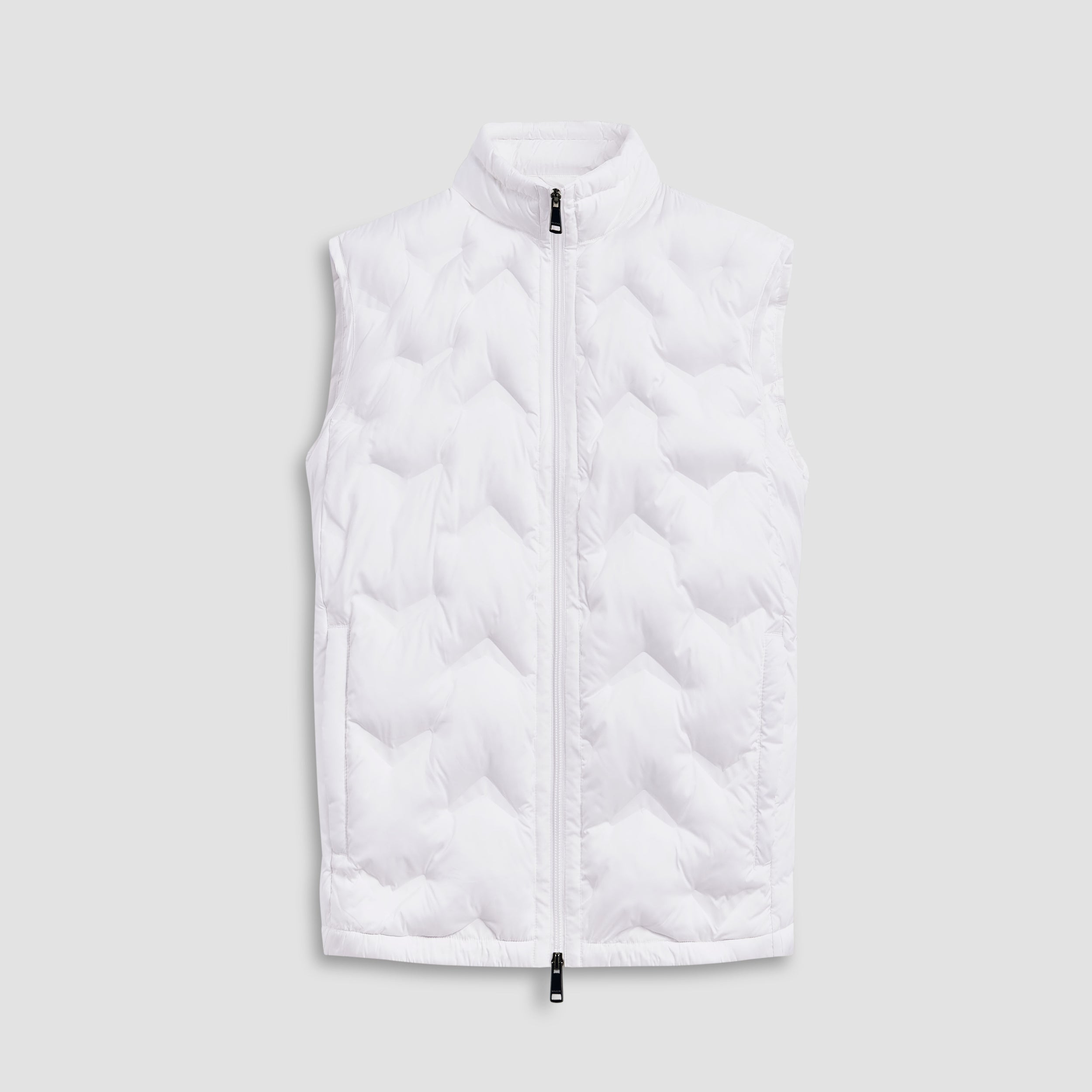 Stay warm and stylish with our chevron-quilted puffer vest. Constructed from durable nylon with a water-repellent finish, it offers superior insulation. Features a quilted stand-up collar, two-way zipper closure, and elasticized waistband for comfort. Vertical seam pockets with covered zippers provide secure storage, while inside, discover 2x2 patch pockets with additional zippered compartments and snap closure.