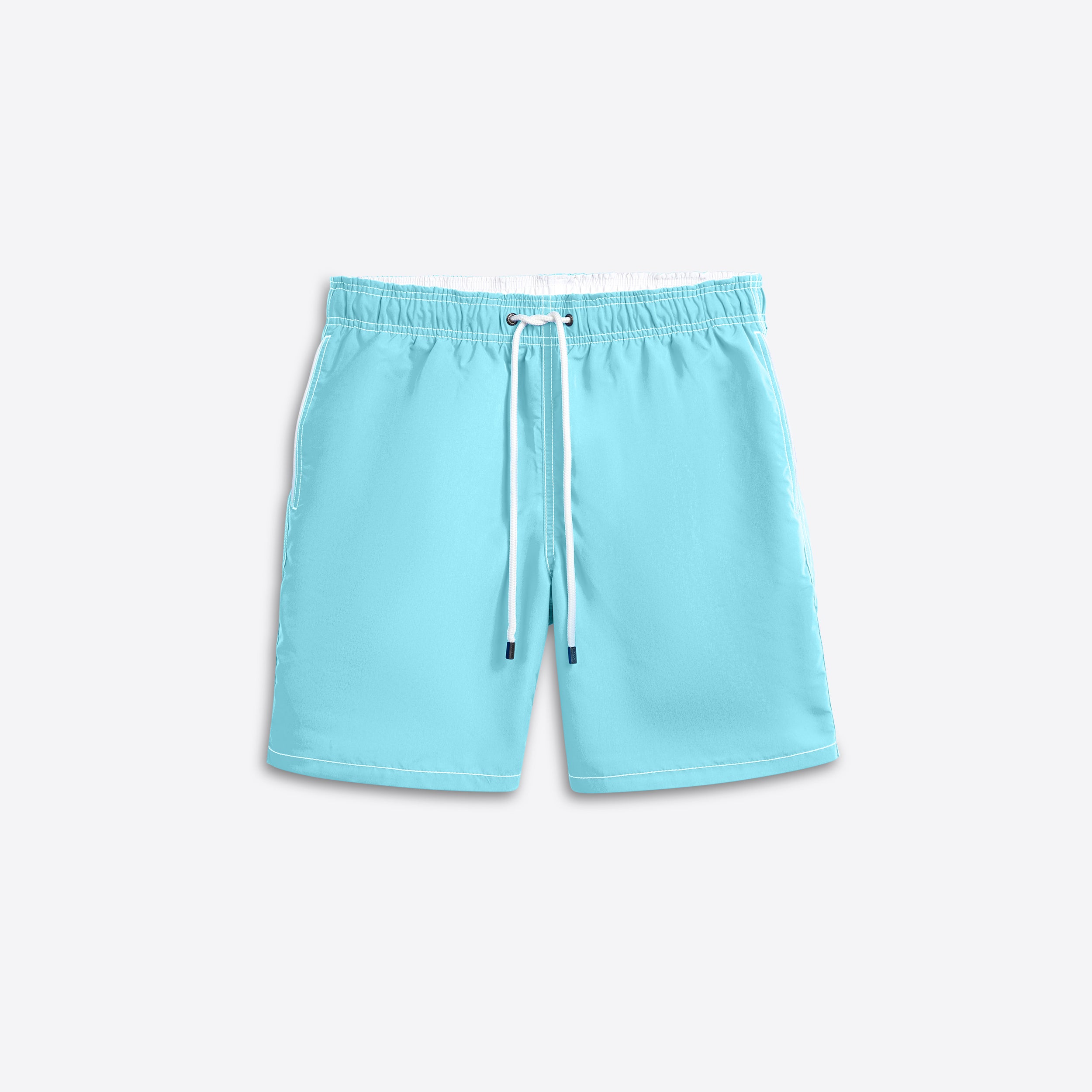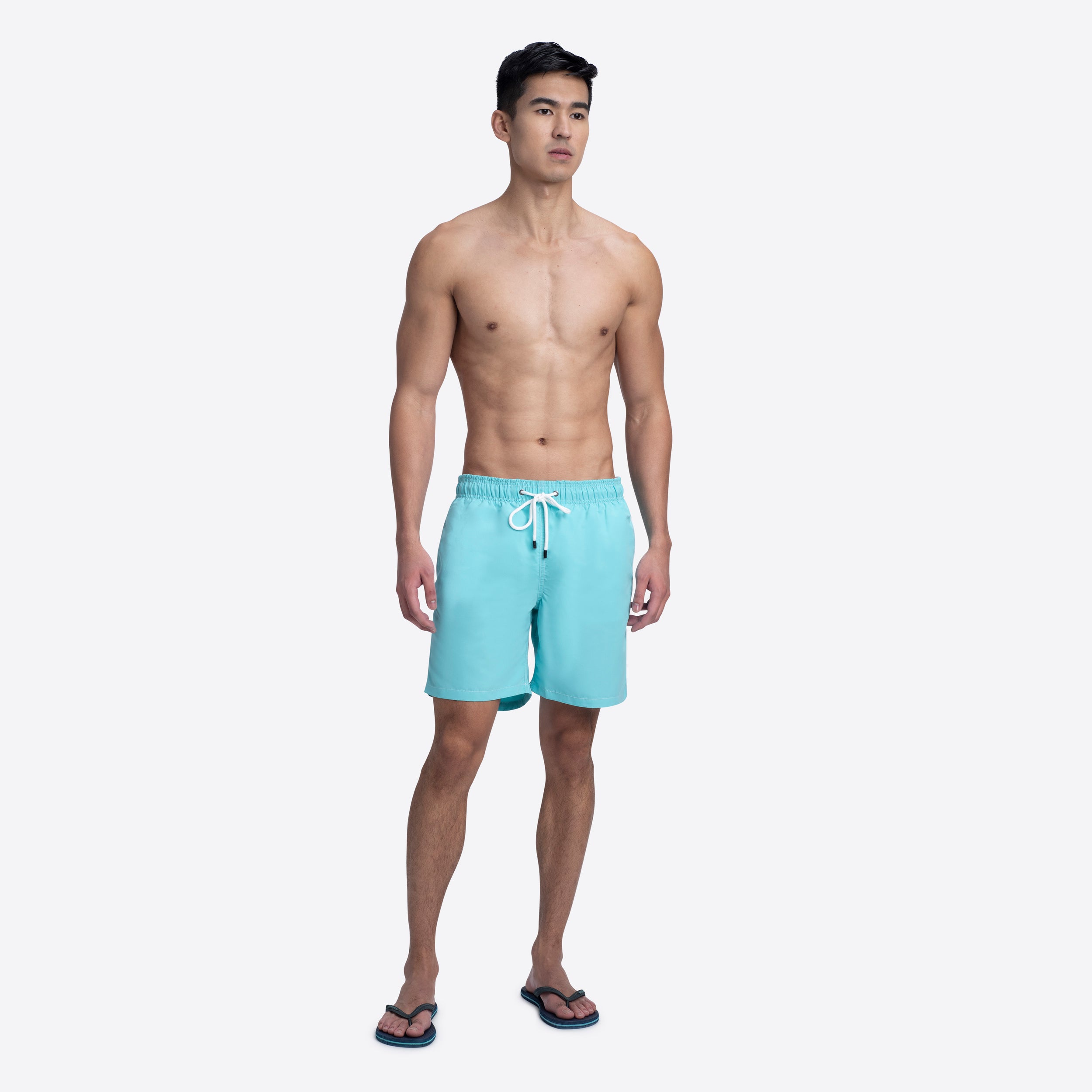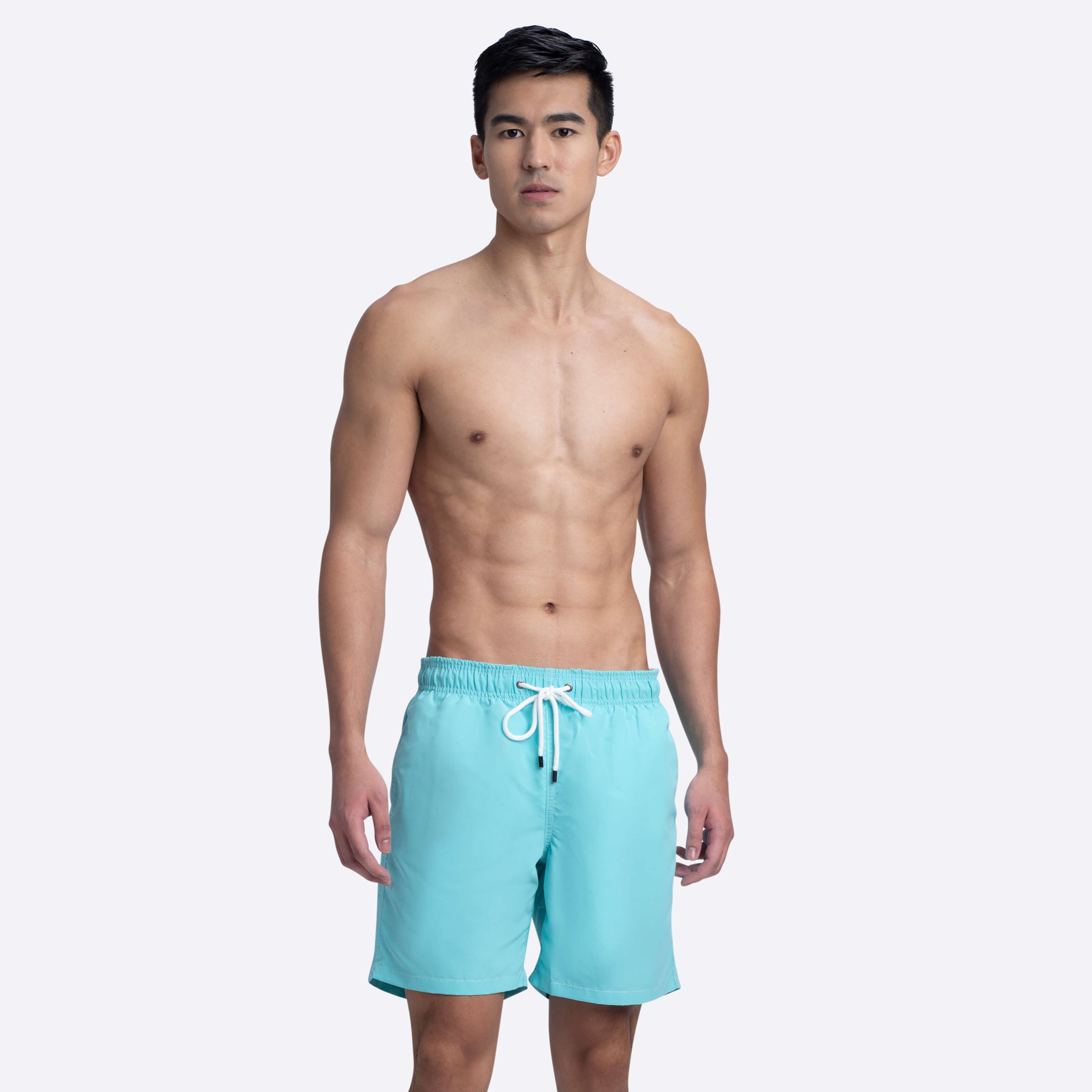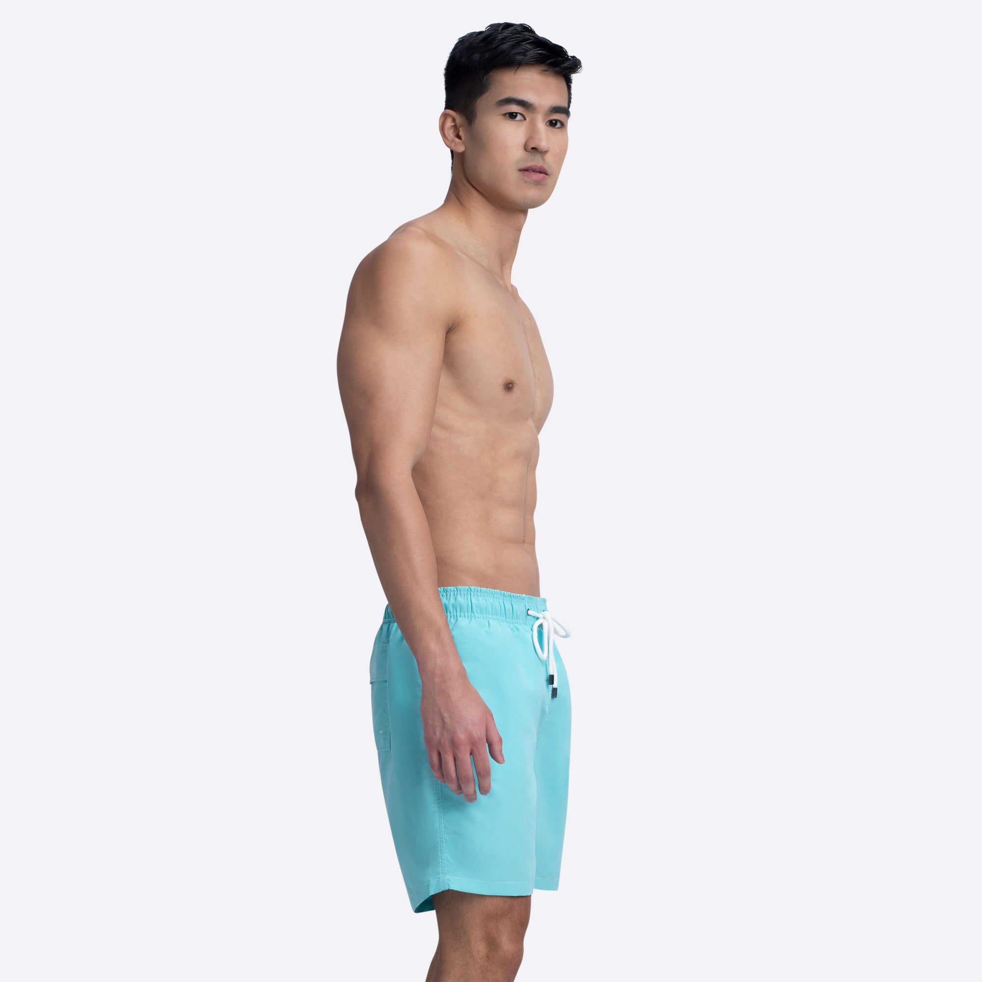 CLYDE solid swim trunks in lightweight, quick dry fabric with drawstring elasticized waistband, breathable mesh lining and back flap pocket.