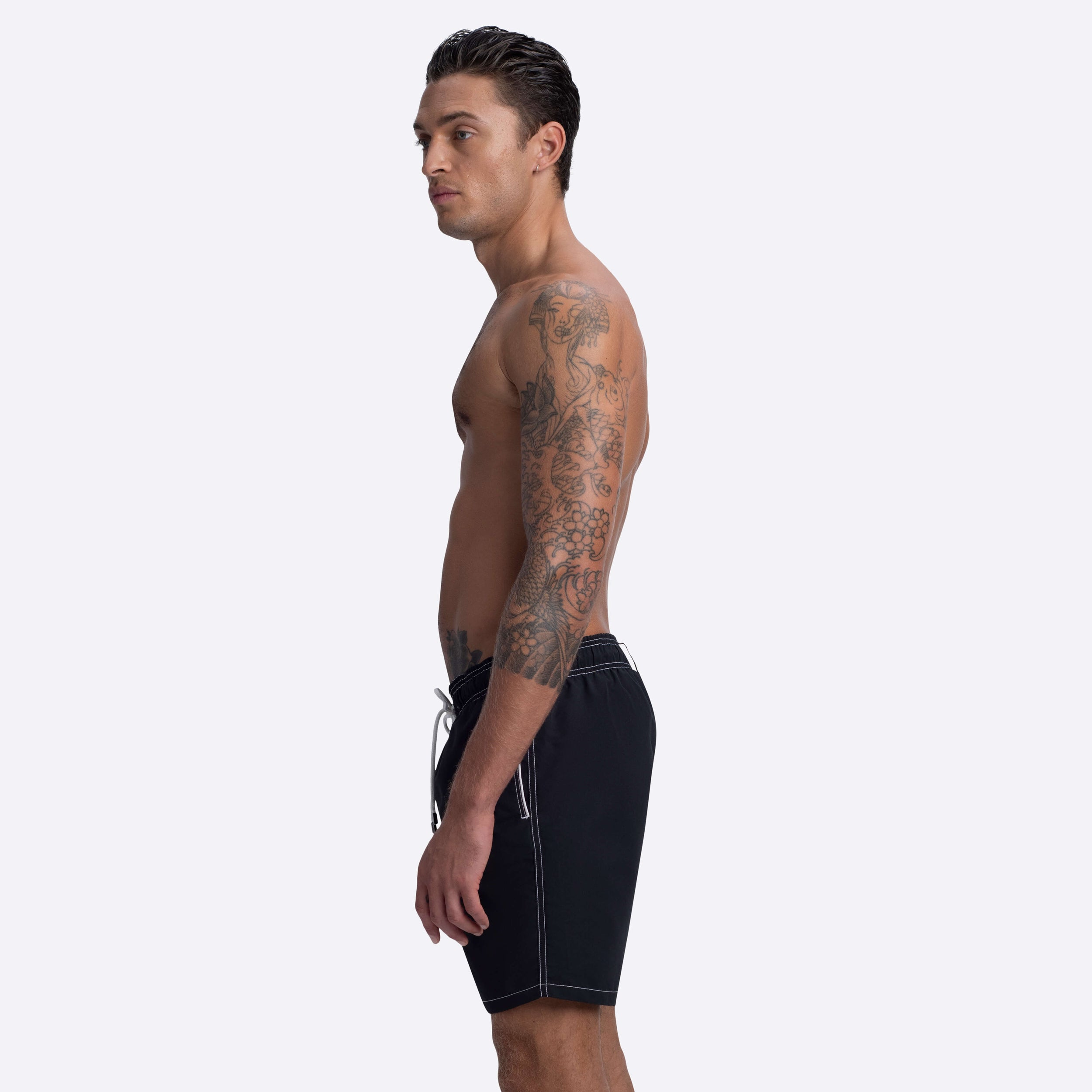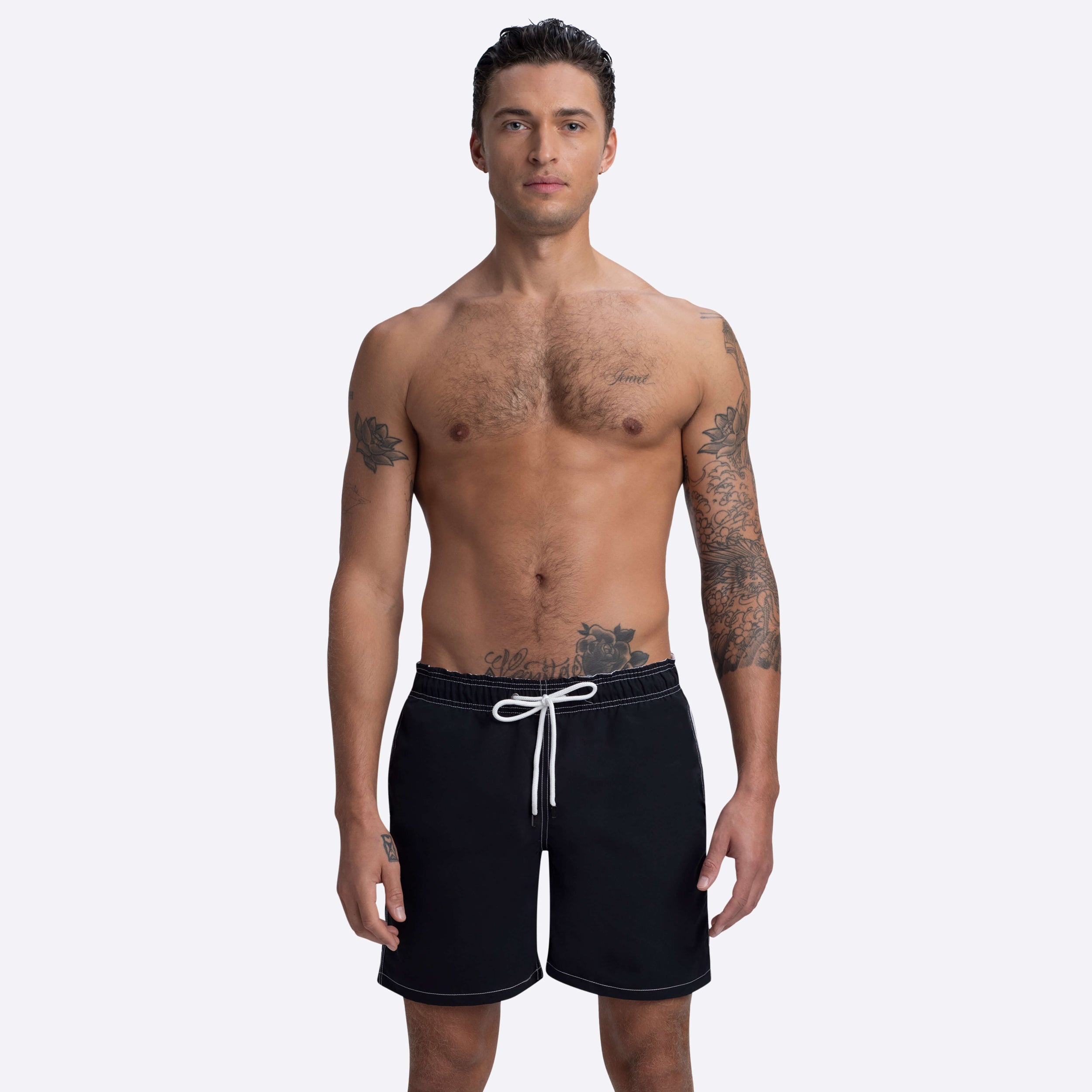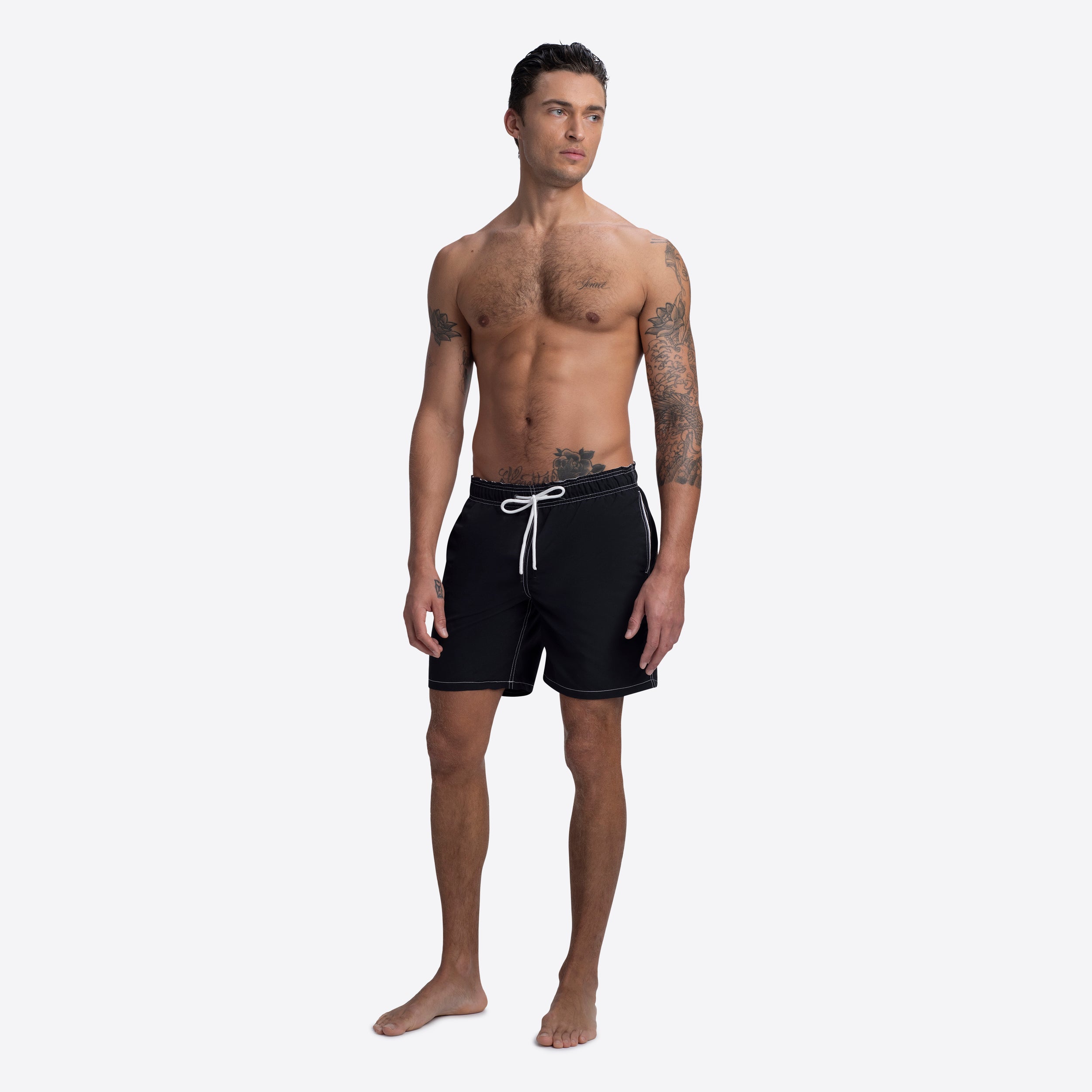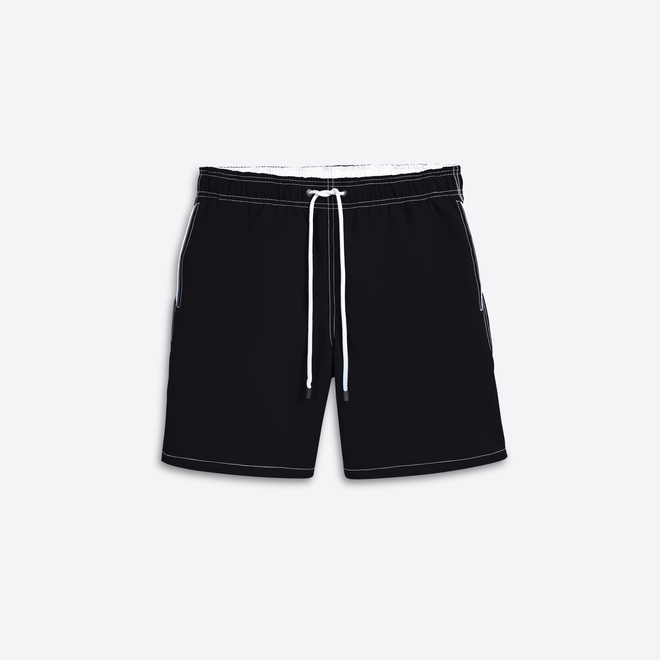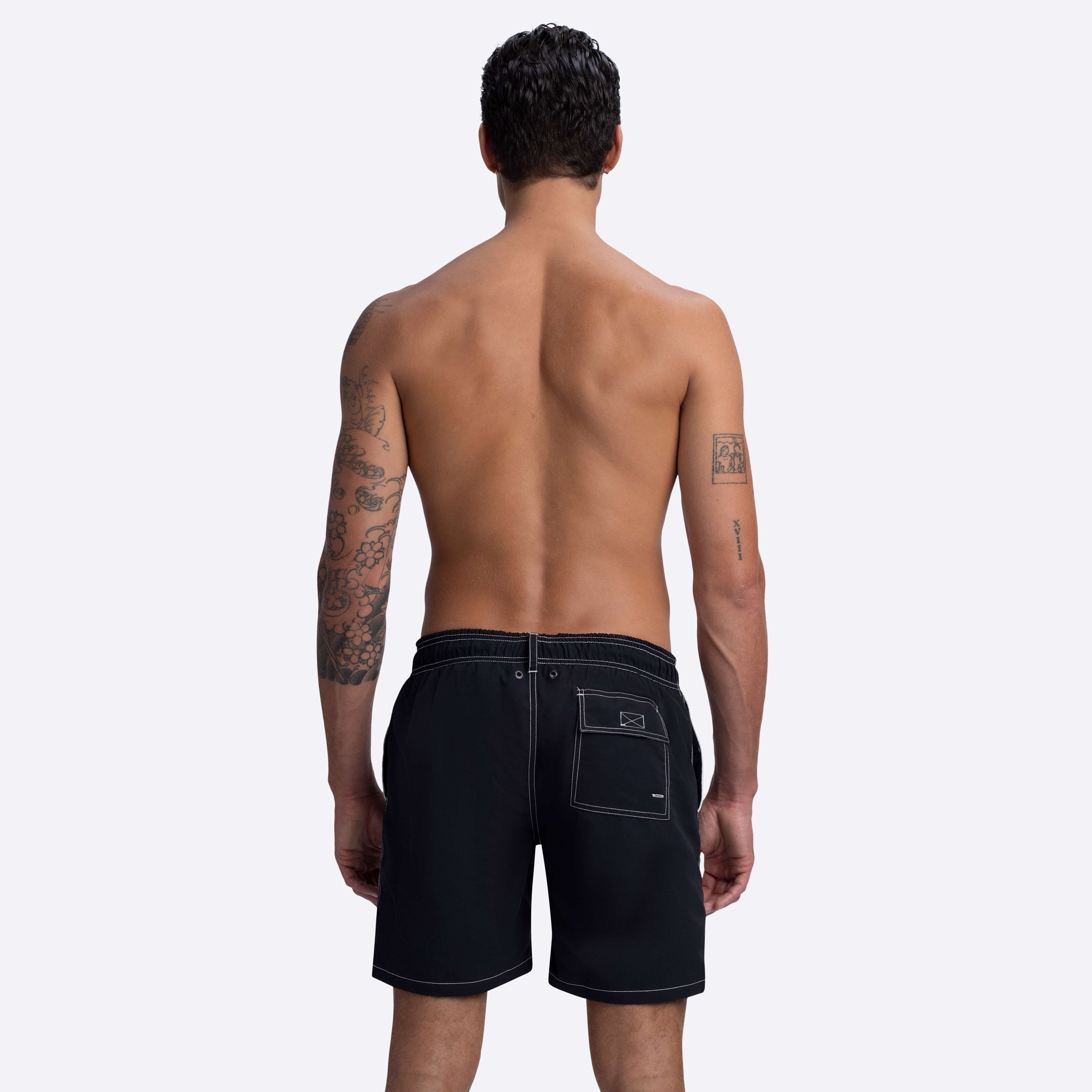 CLYDE solid swim trunks in lightweight, quick dry fabric with drawstring elasticized waistband, breathable mesh lining and back flap pocket.