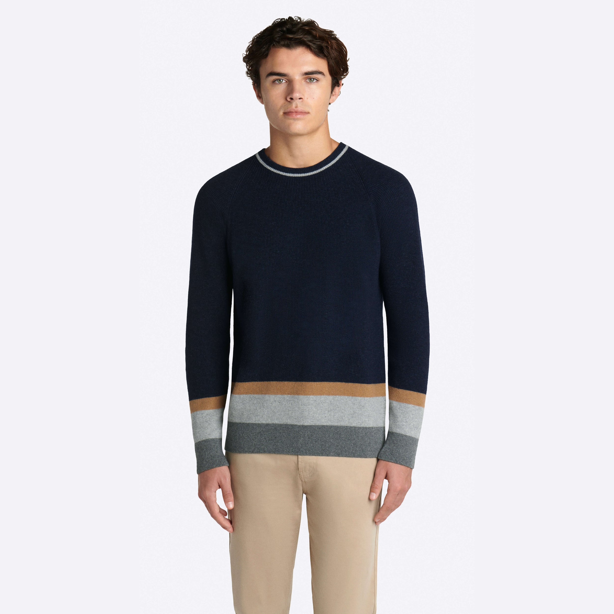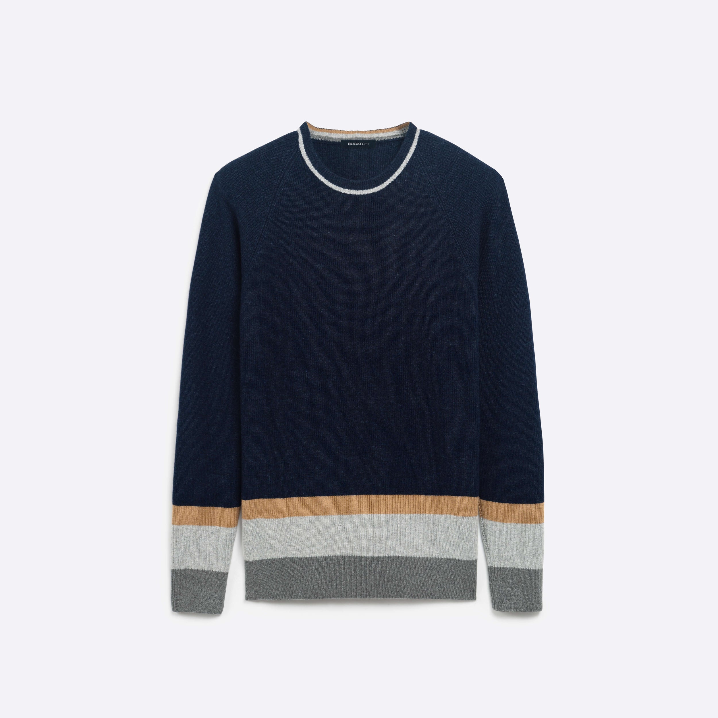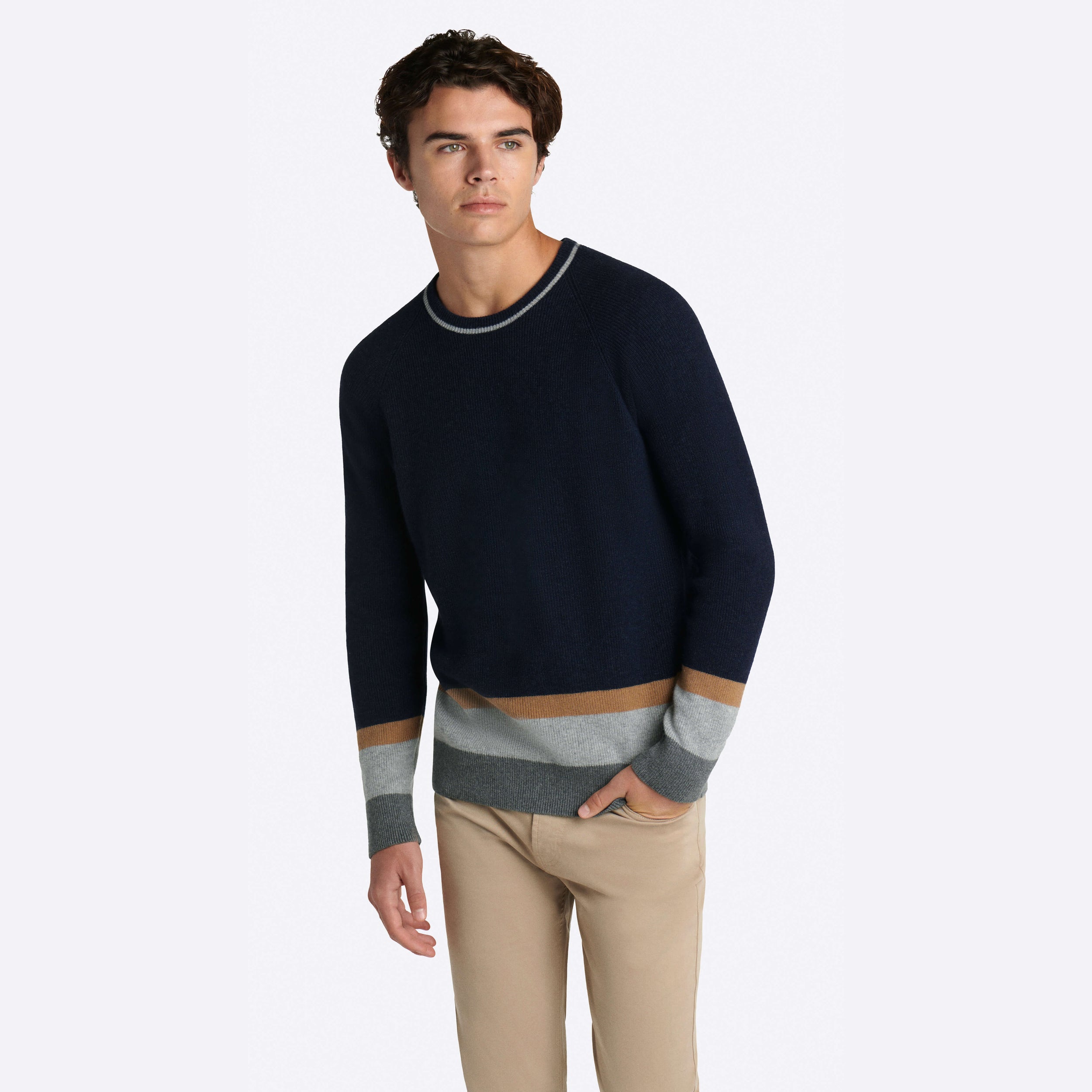 Color block raglan sleeve crew neck sweater in wool blend with rib knit collar, cuffs and waistband.