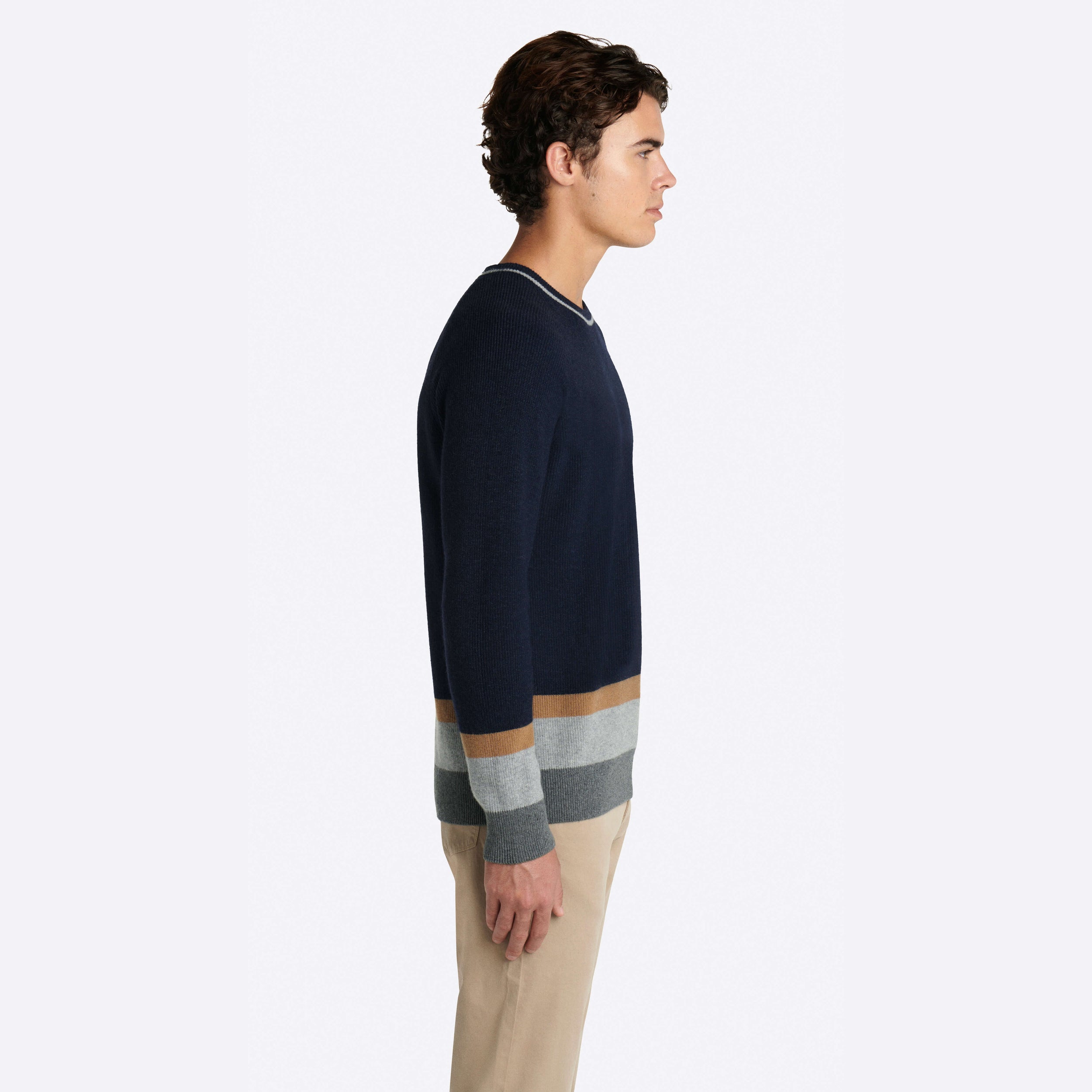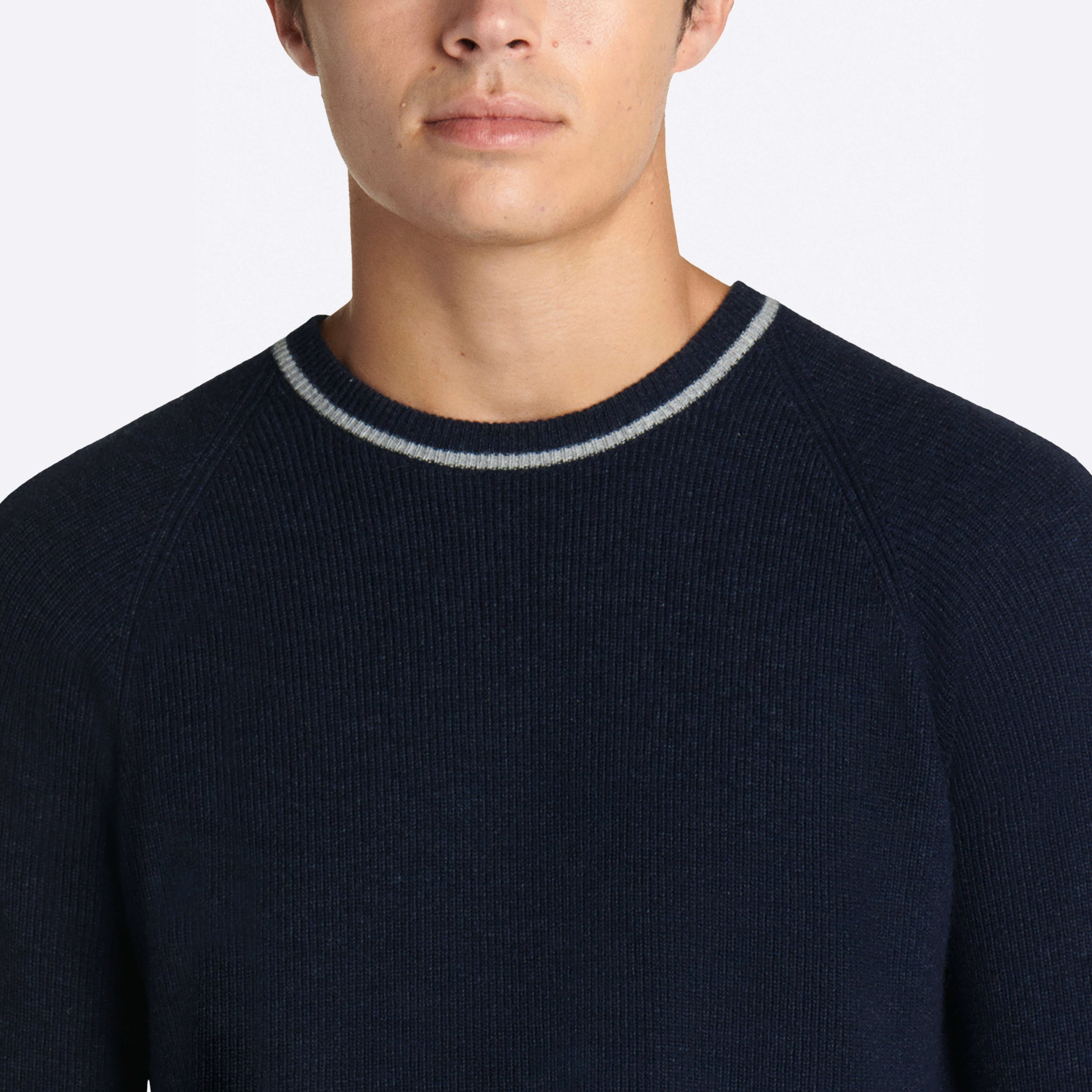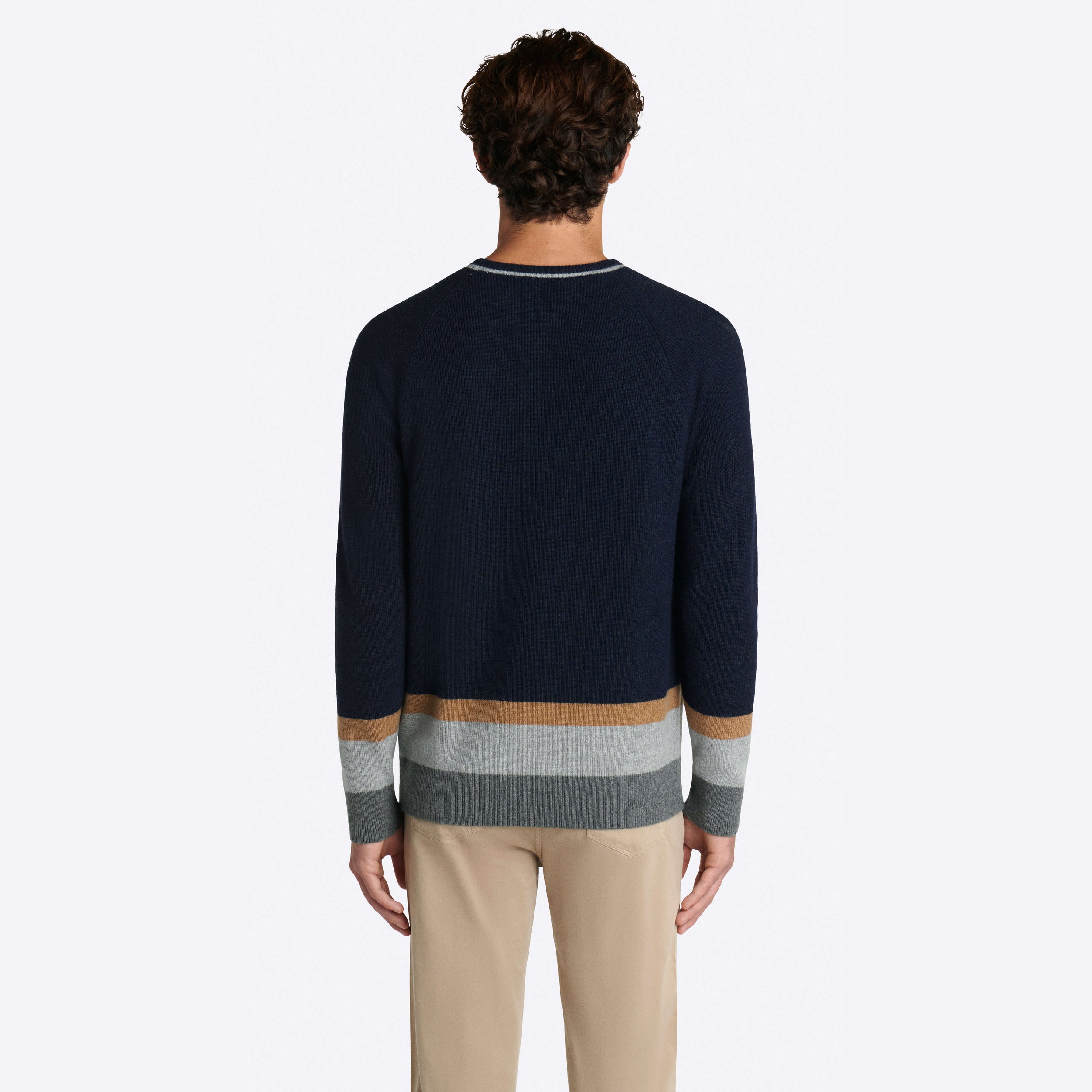 Color block raglan sleeve crew neck sweater in wool blend with rib knit collar, cuffs and waistband.