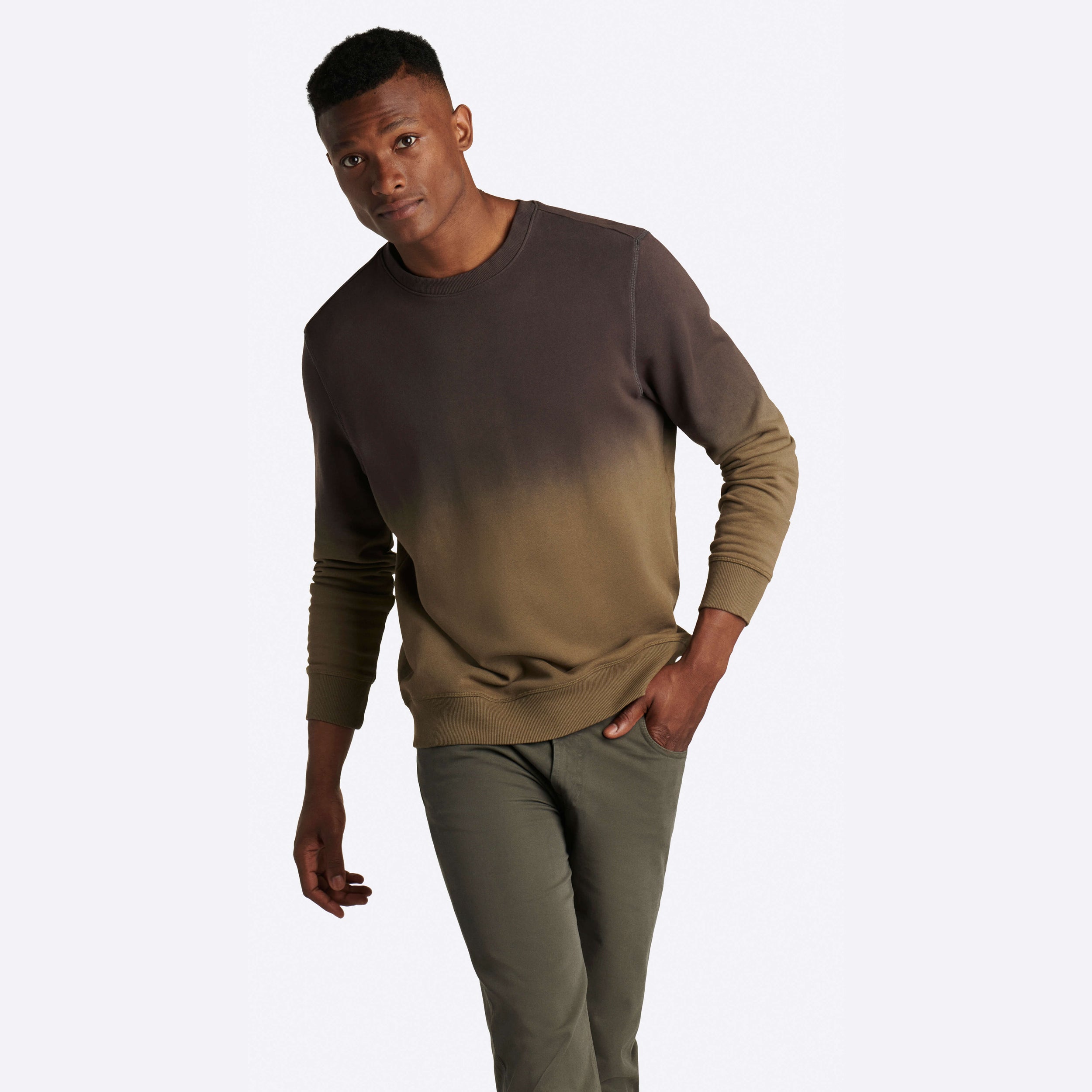 Ombre long sleeve crew neck in dip-dyed COMFORT soft 100% cotton with rib knit neckline, cuffs and waistband.