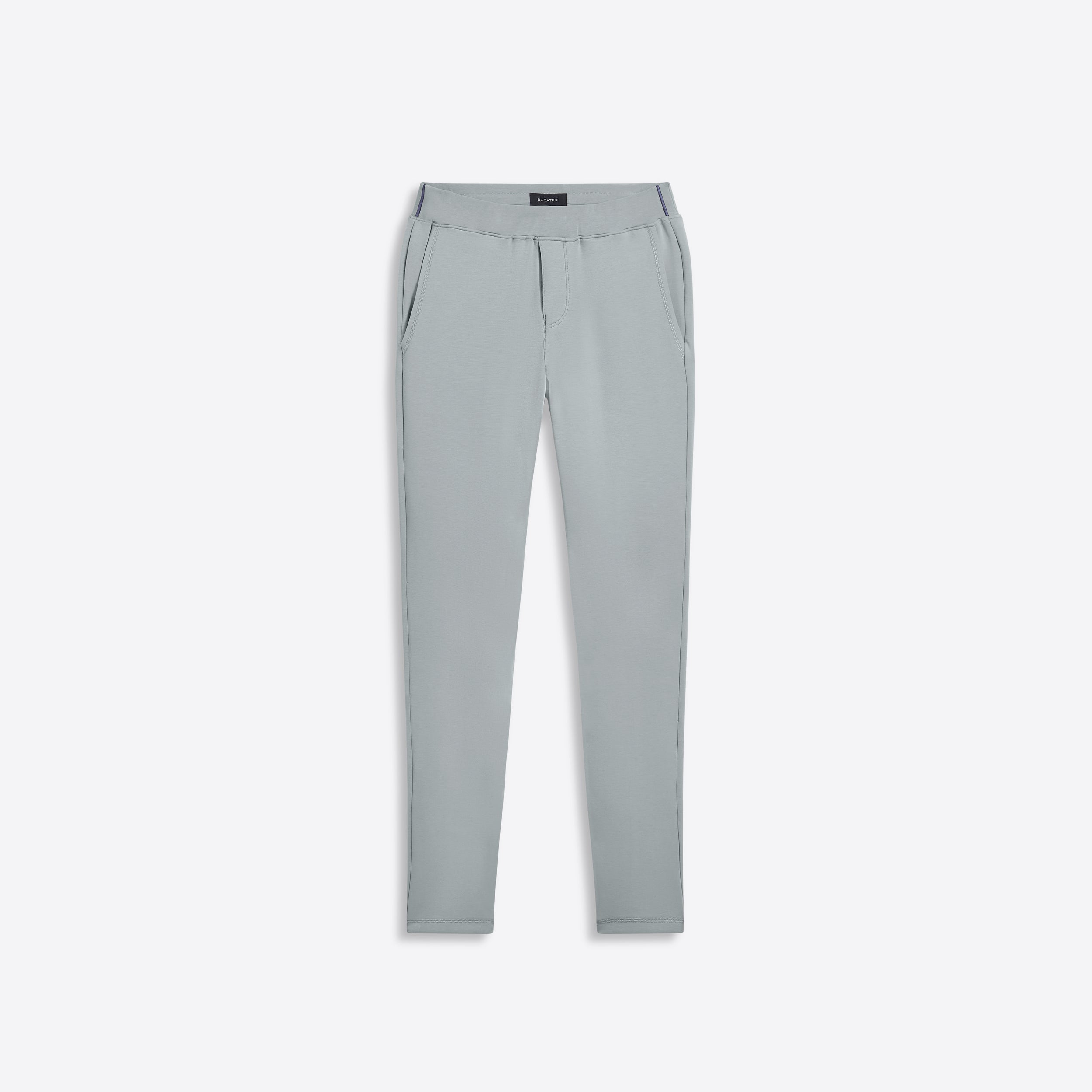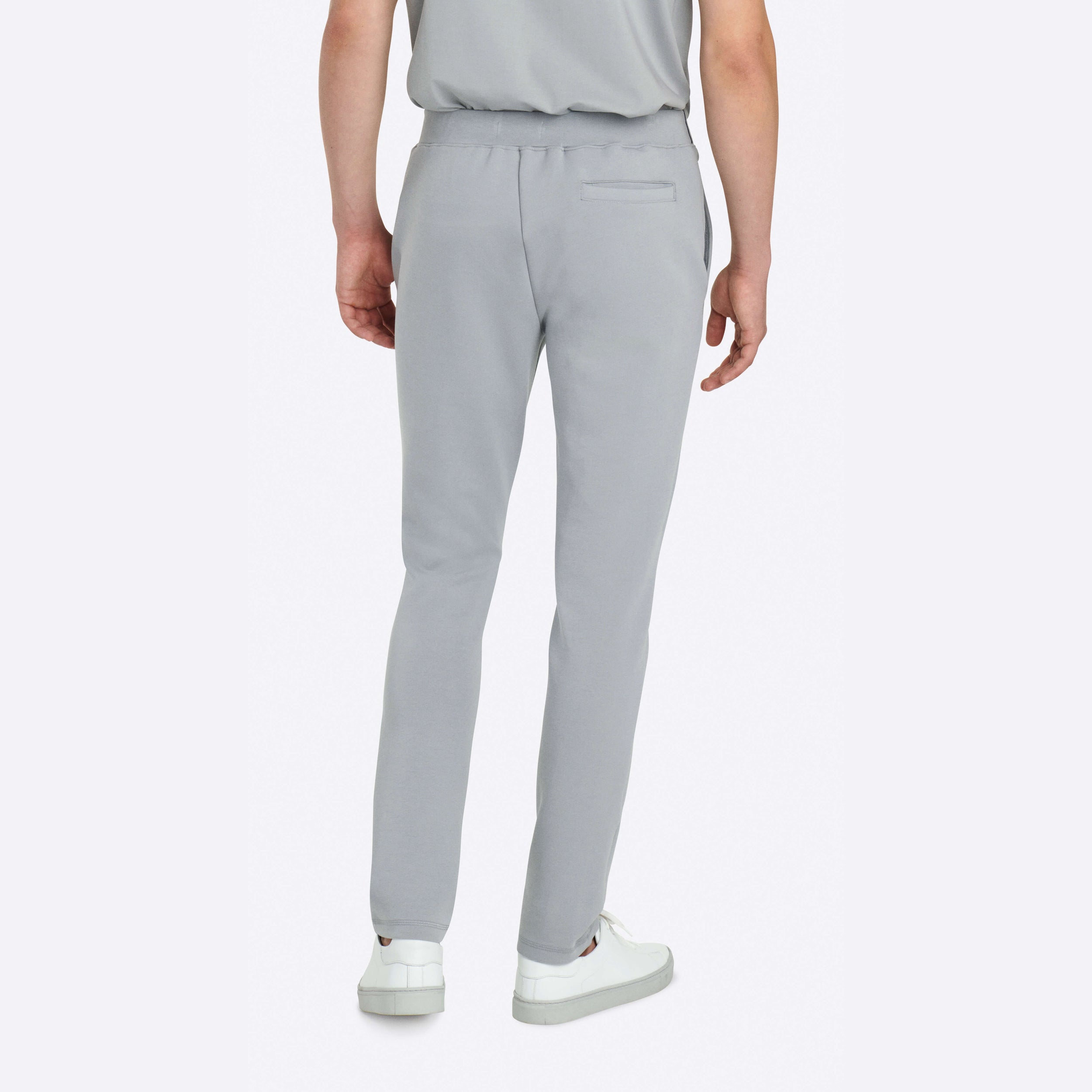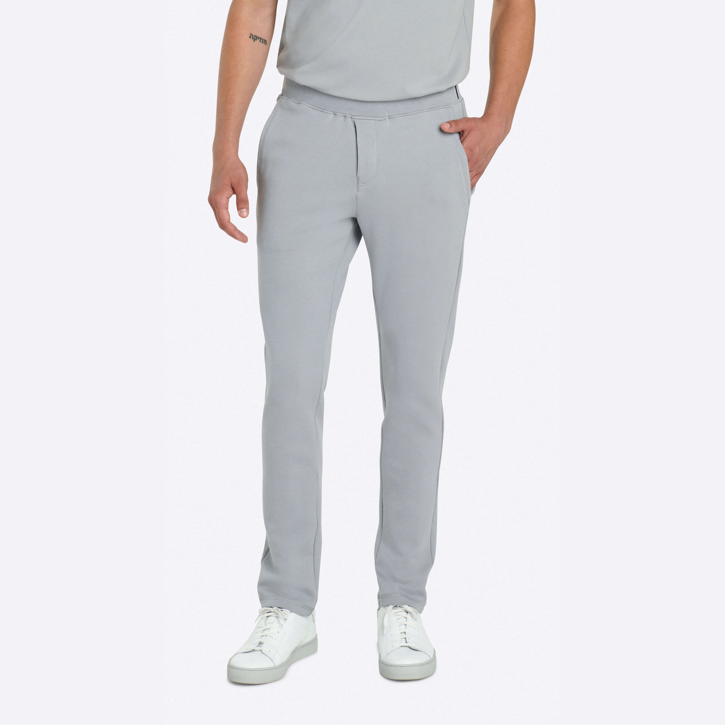 Solid straight leg jogging lounge pant in comfort soft stretch cotton with side and back pockets, elasticized drawstring waist and open cuff.