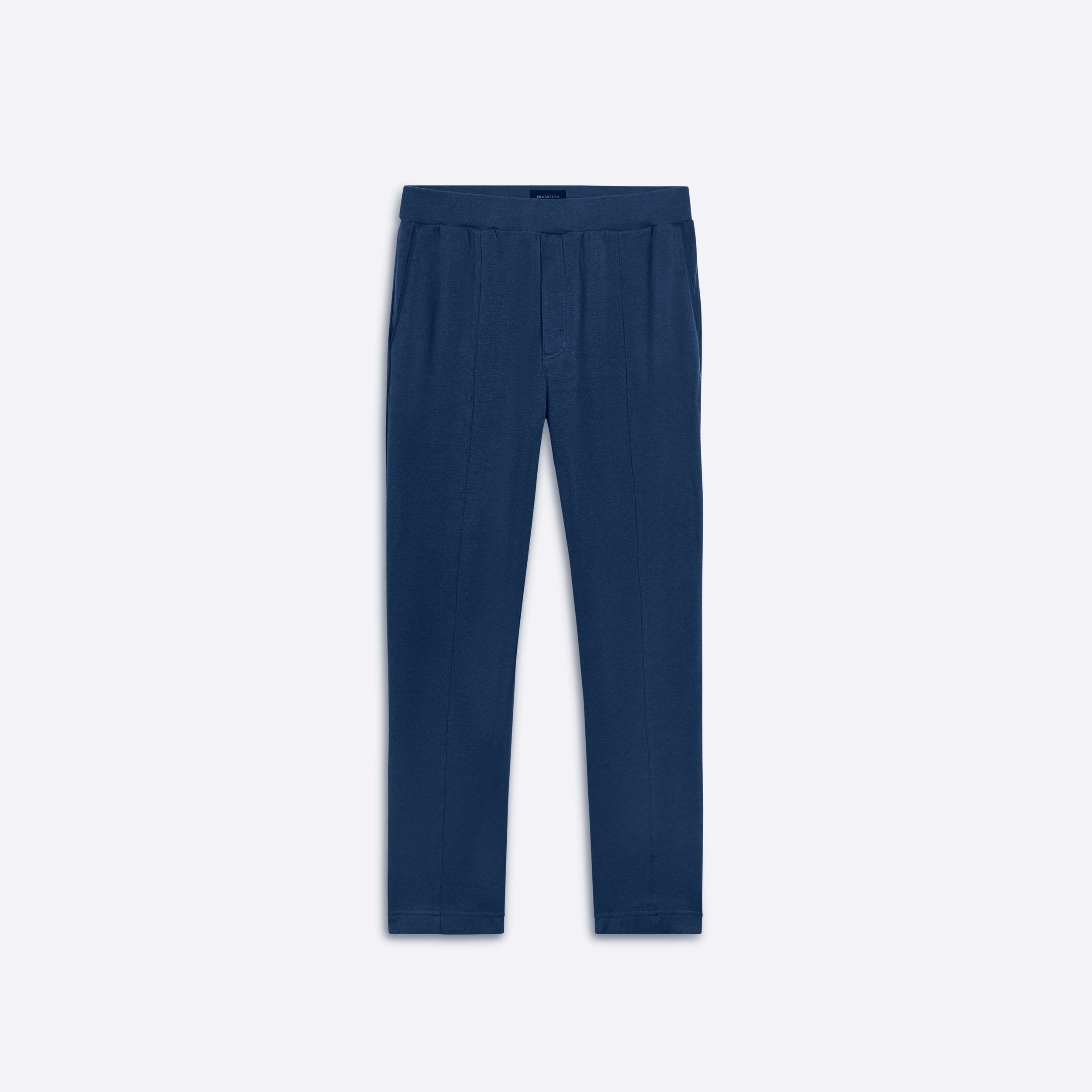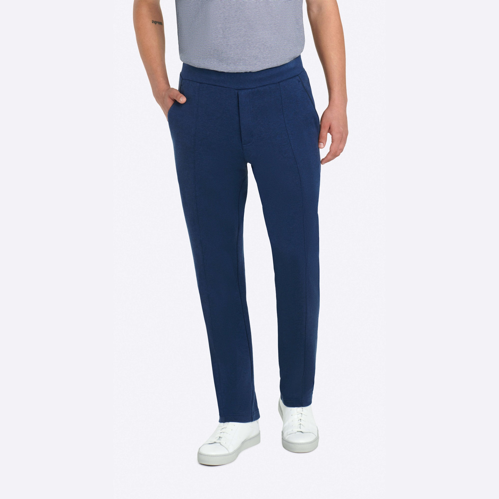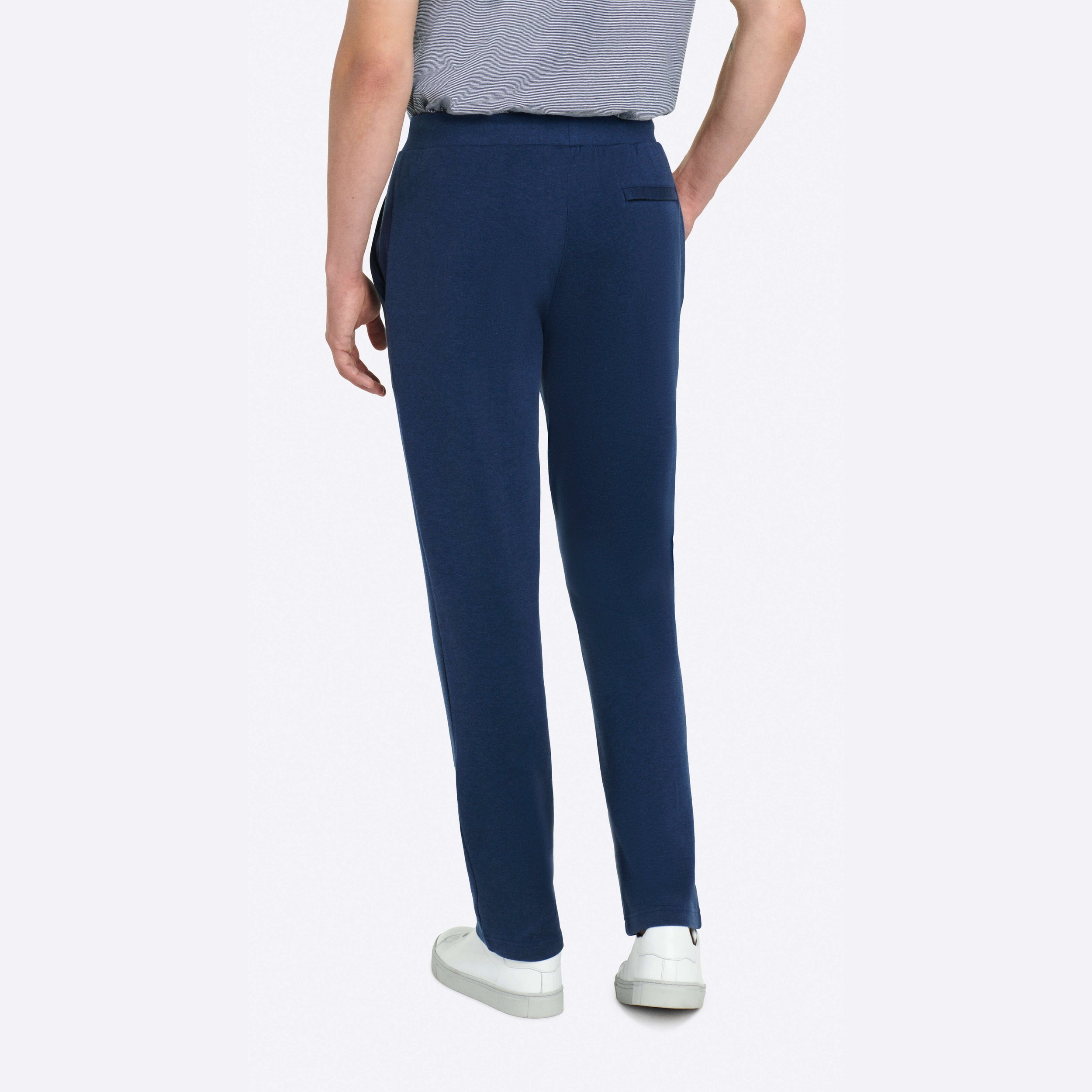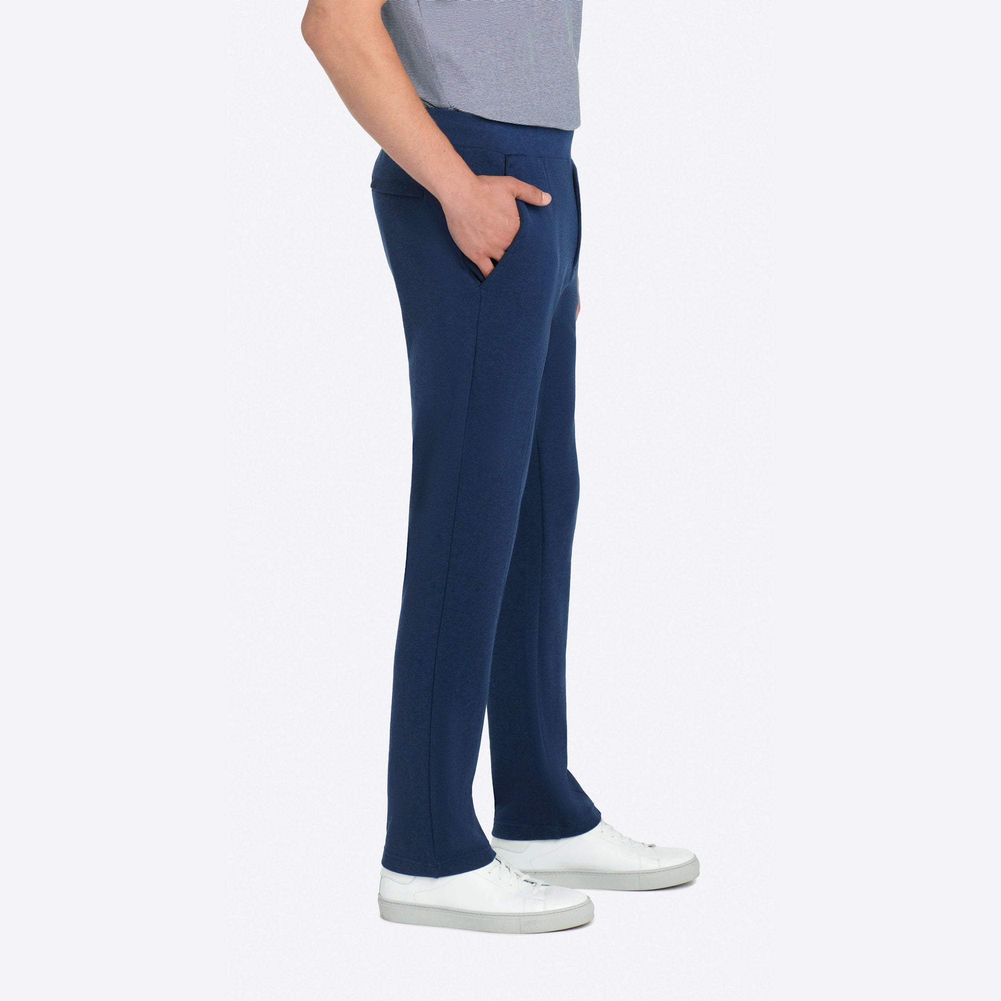 Straight leg jogging/lounge pant in comfort solid heather stretch cotton with side and back pockets, elasticized drawstring waist and open cuff.