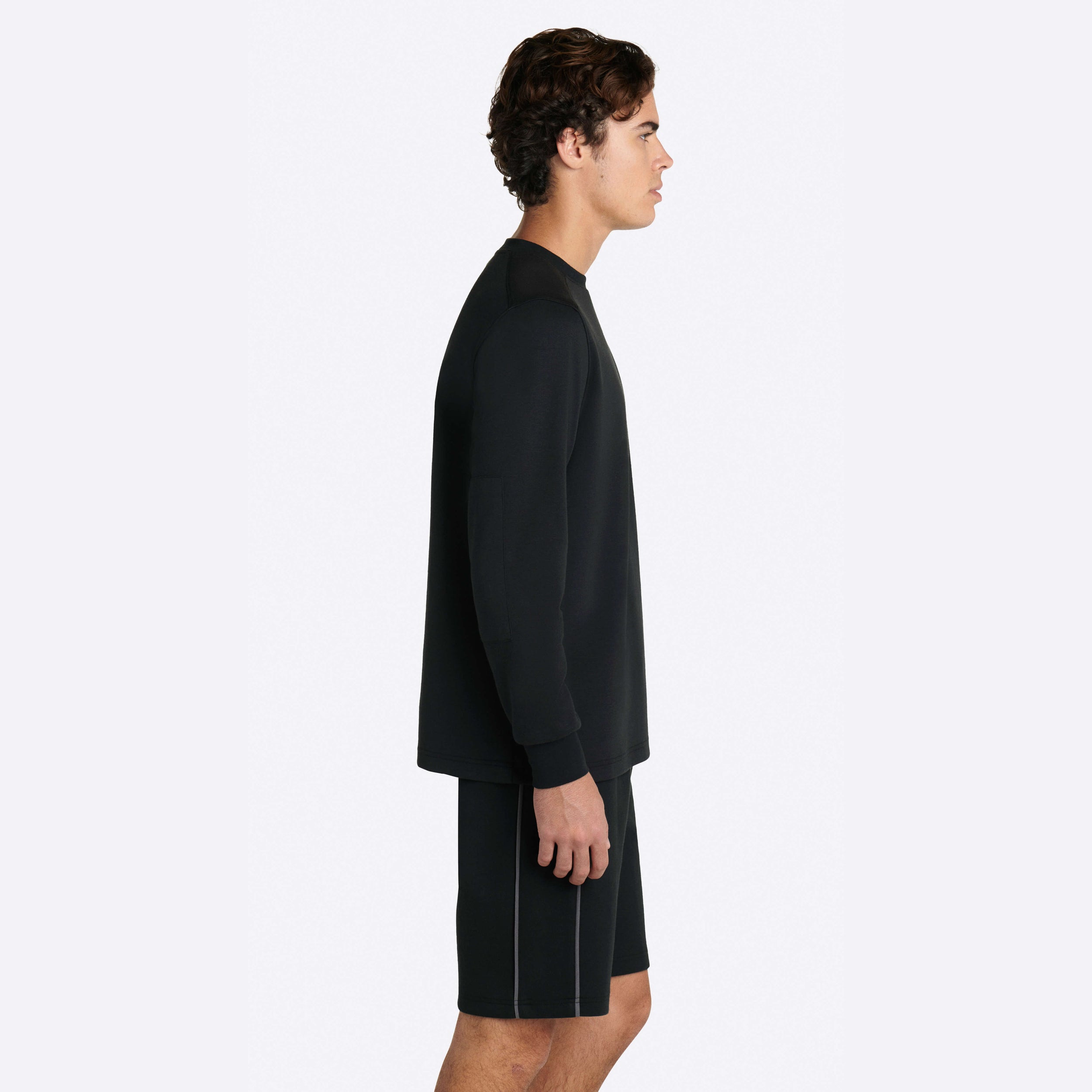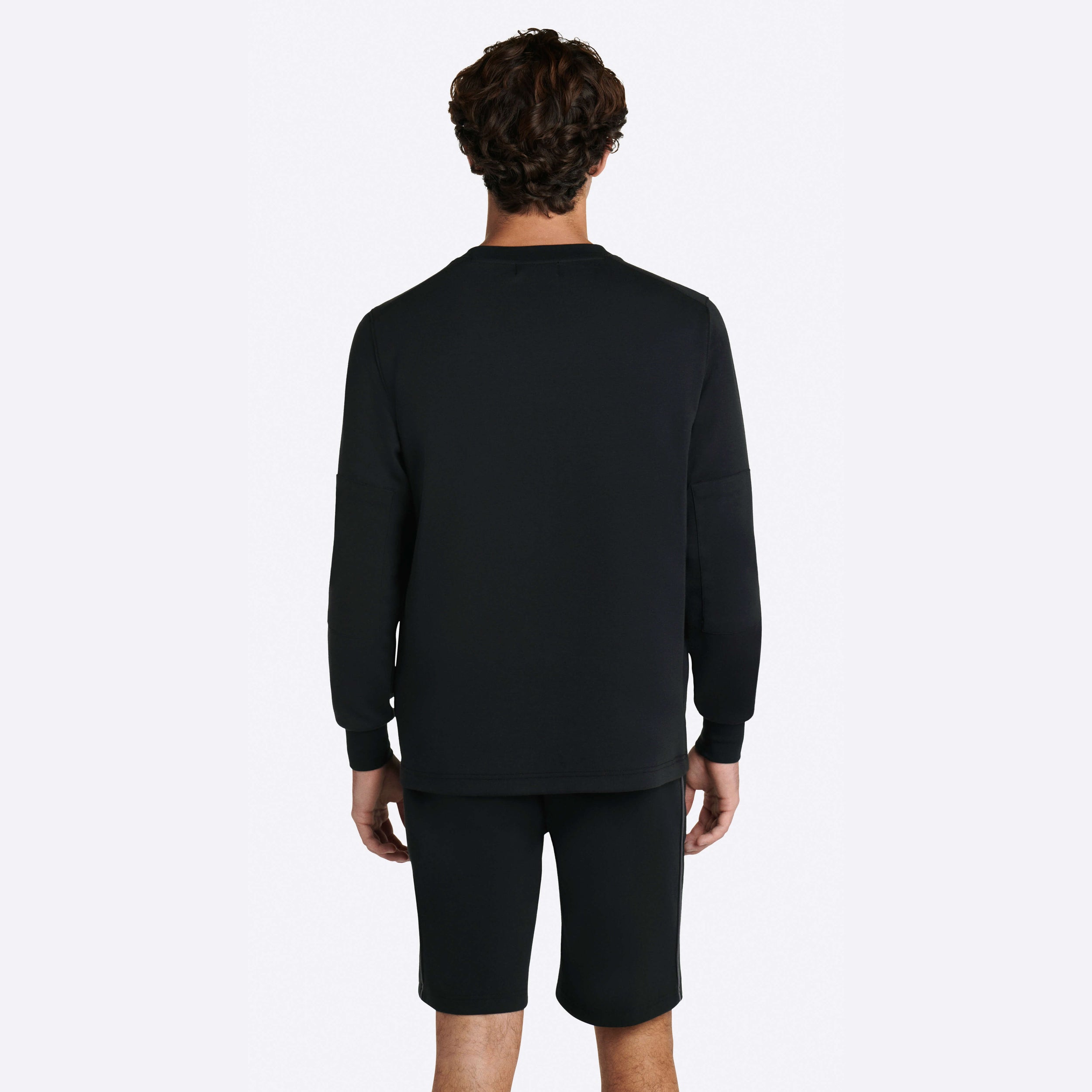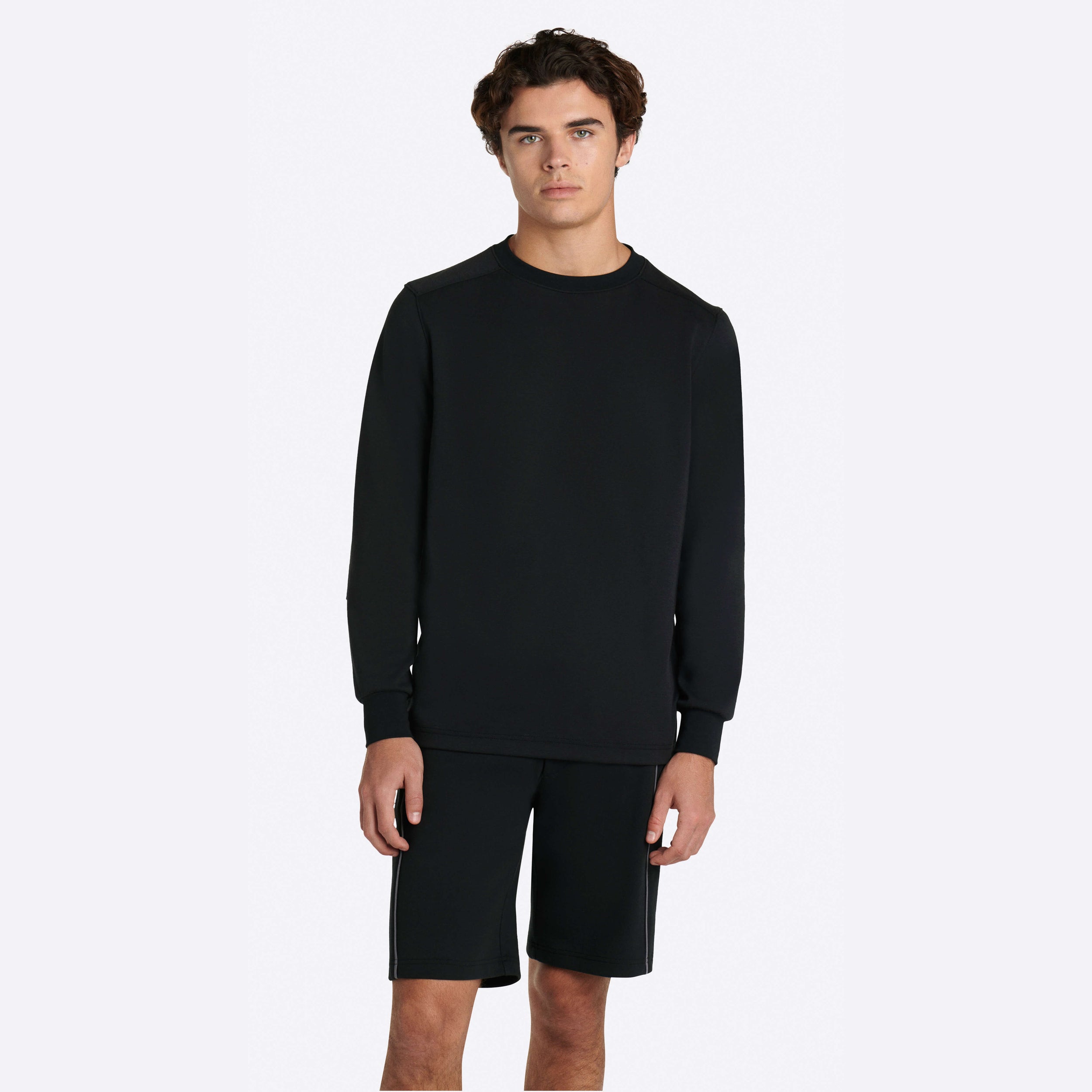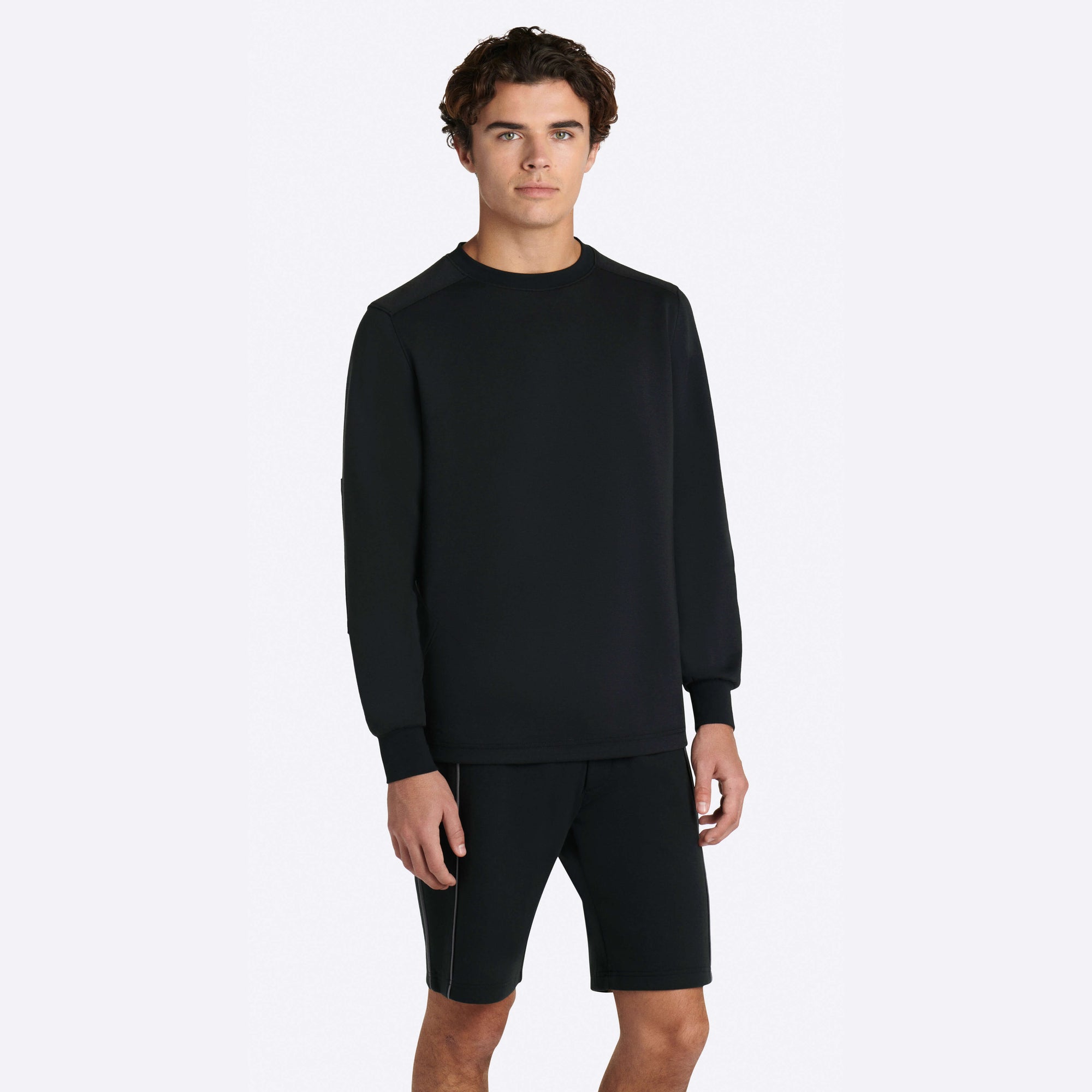 Solid long sleeve crew neck in COMFORT soft stretch cotton with self fabric elbow patch.