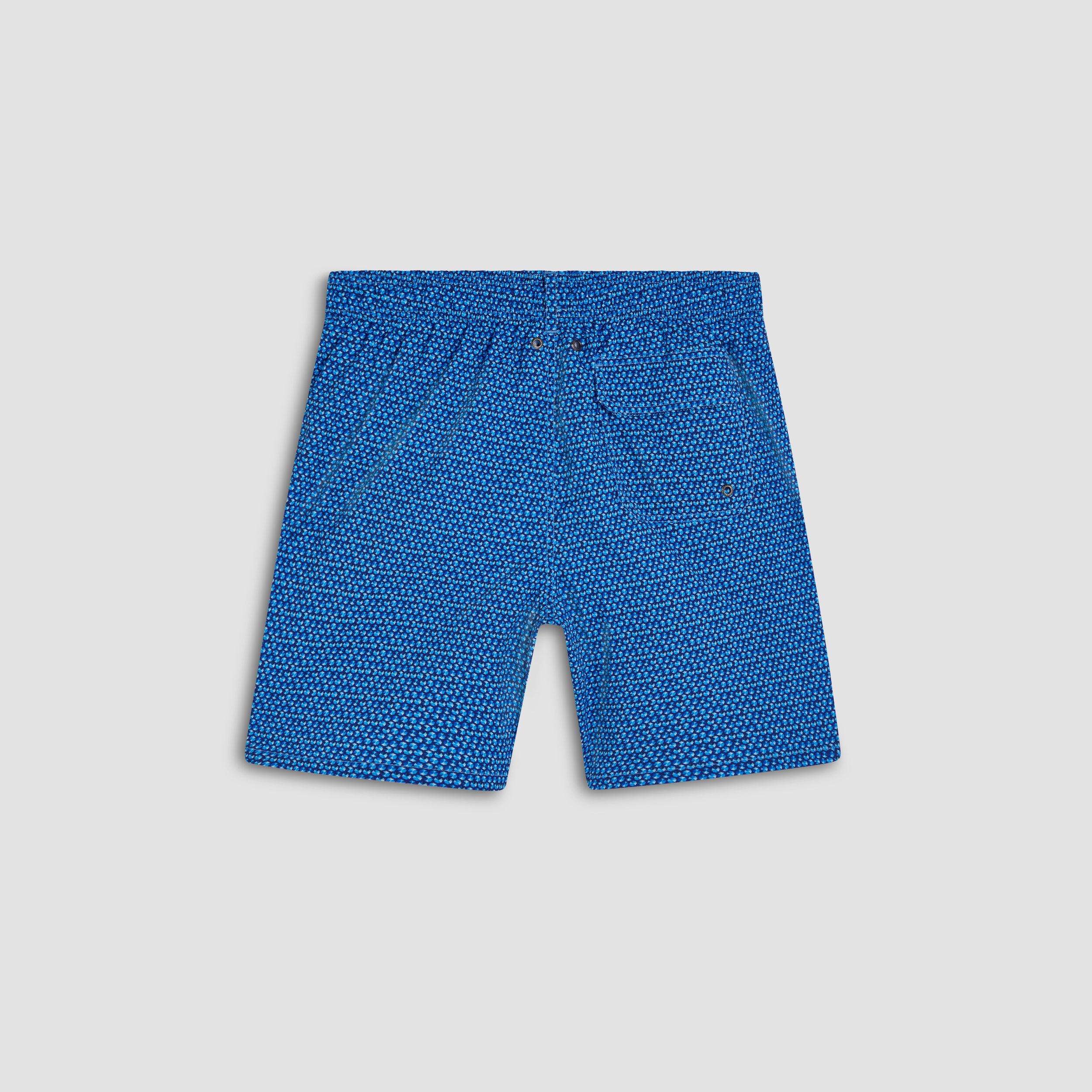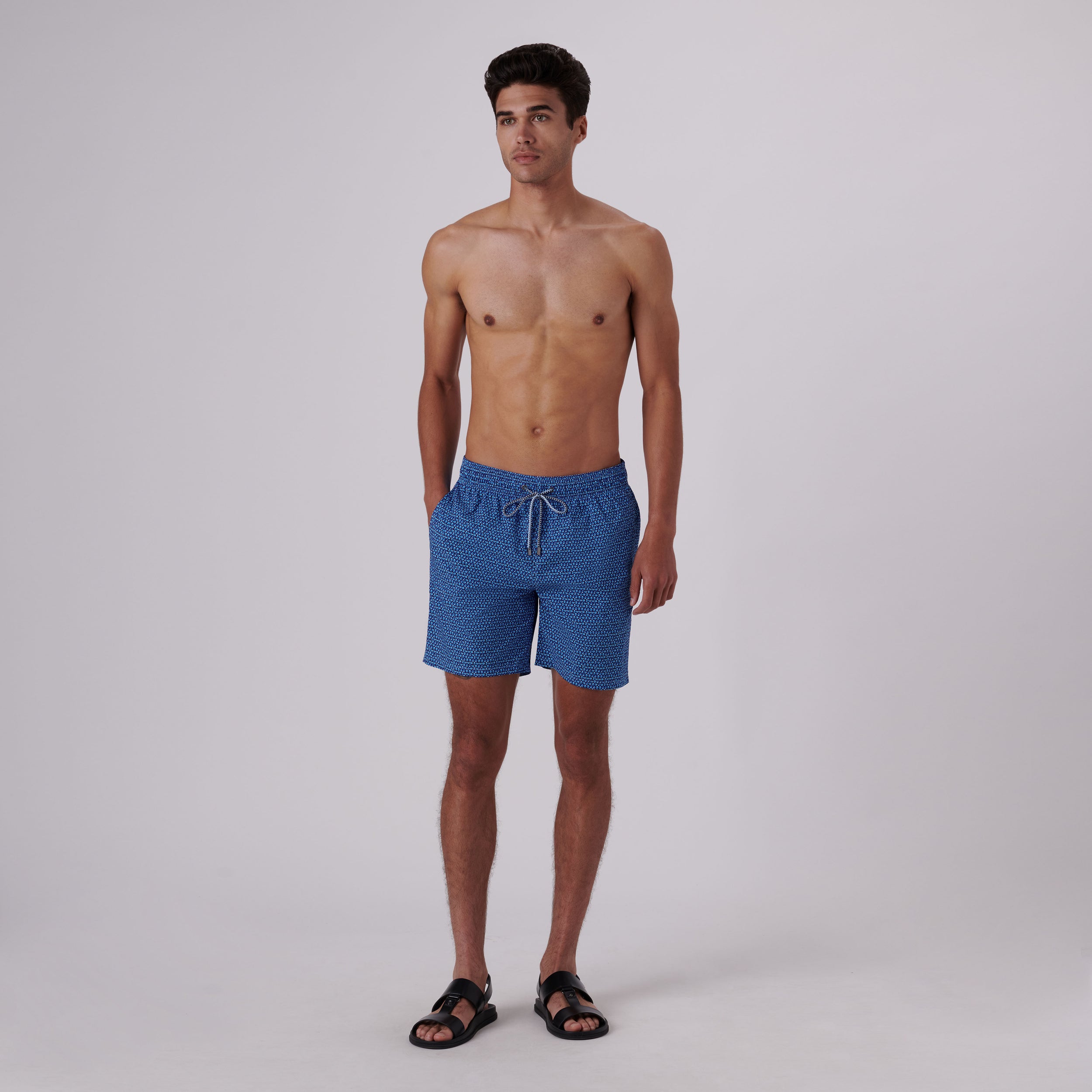Cosmo abstract swim trunks in lightweight, easy care, quick-dry, comfort stretch polyester with resistance to UV rays, chlorine, salt and sunscreen feature an elasticized waistband, drawstring closure, breathable stretch mesh lining, drainage grommets, side pockets and back flap pocket.