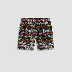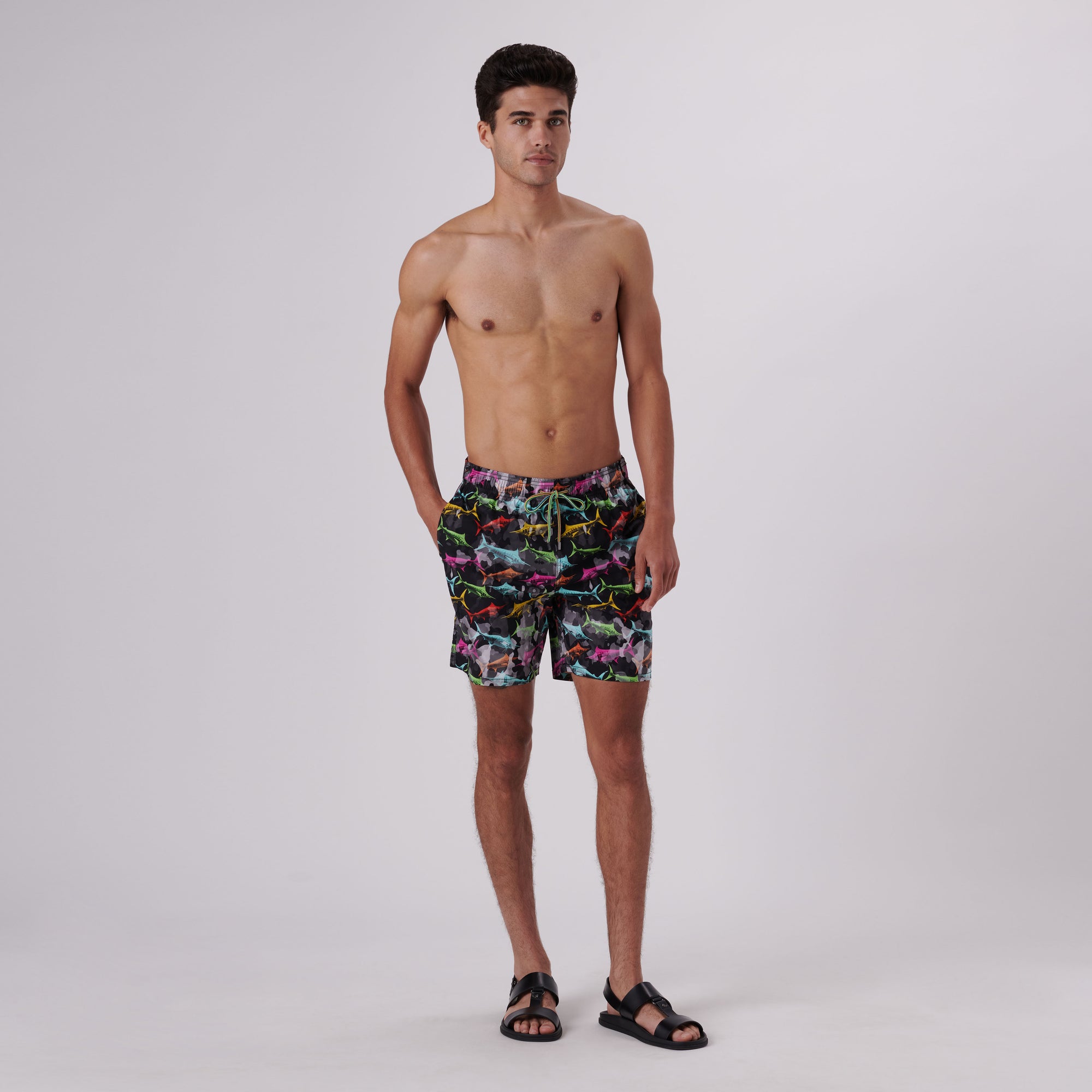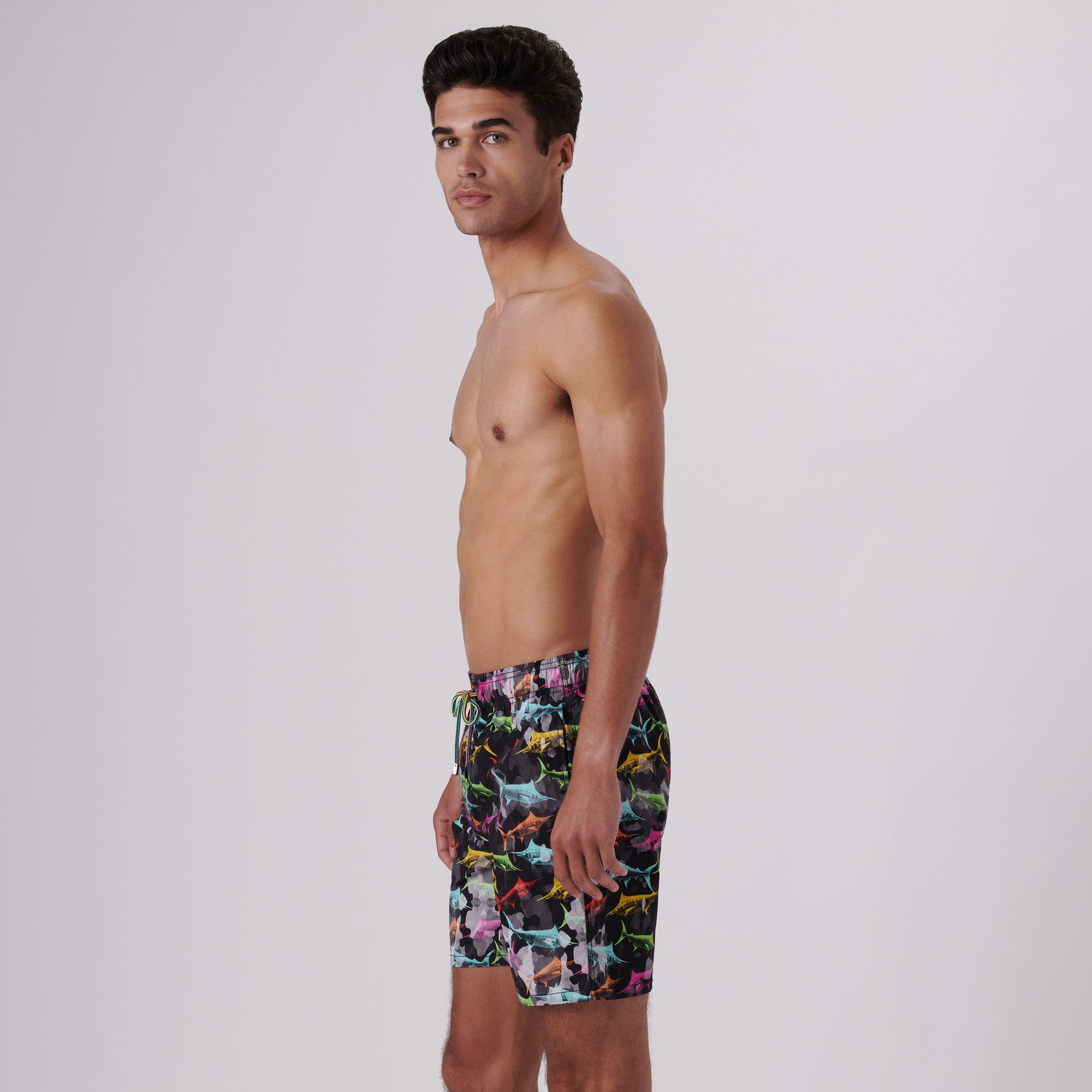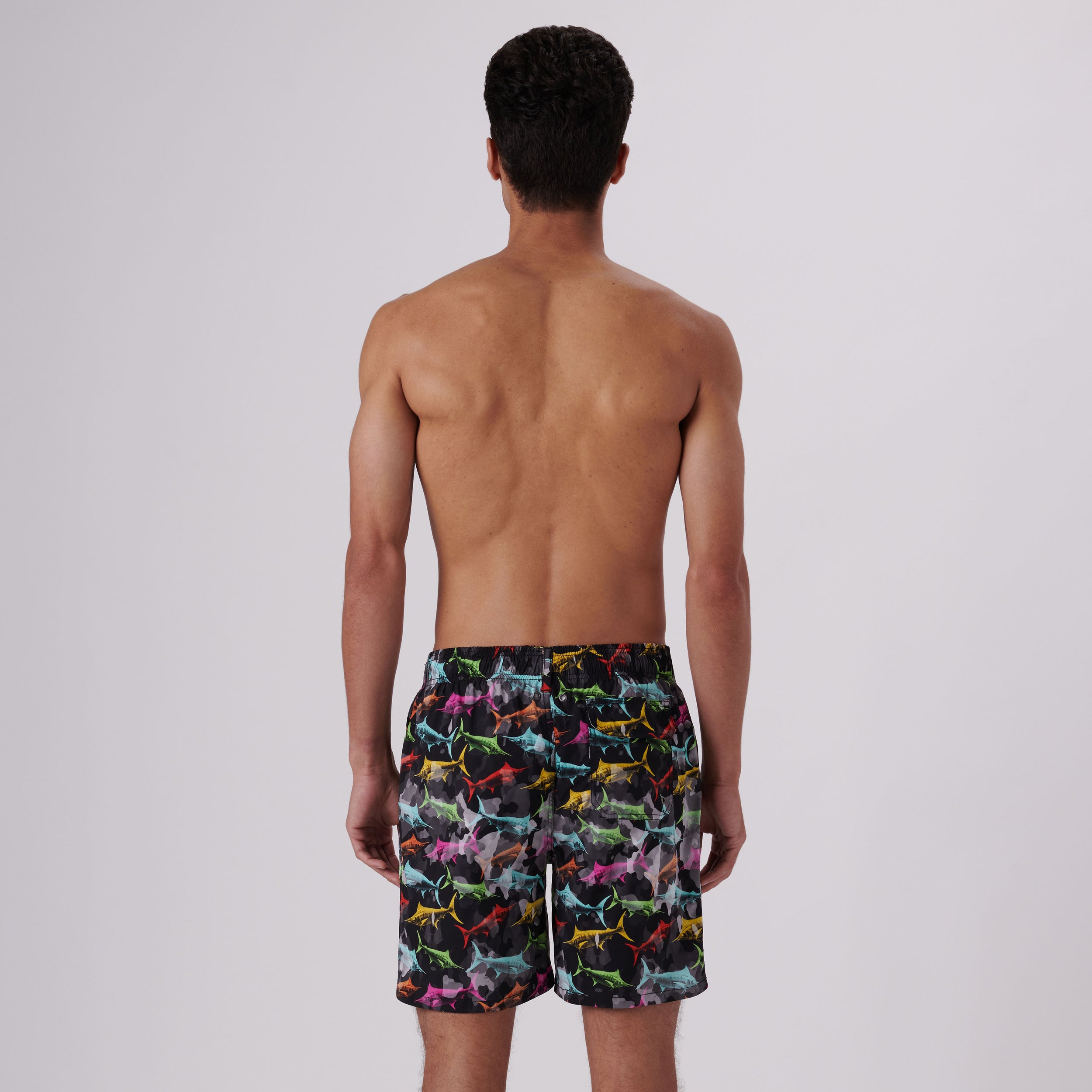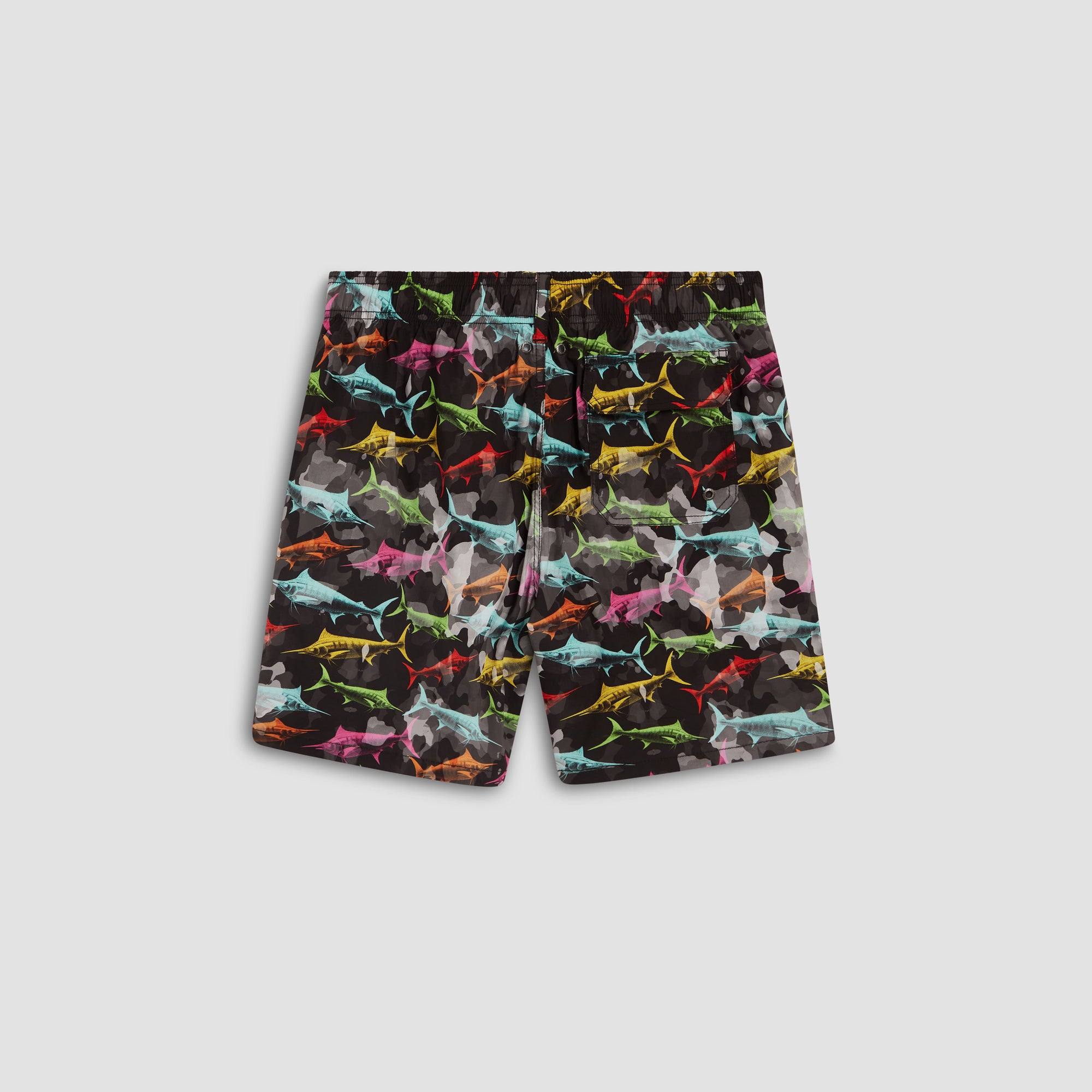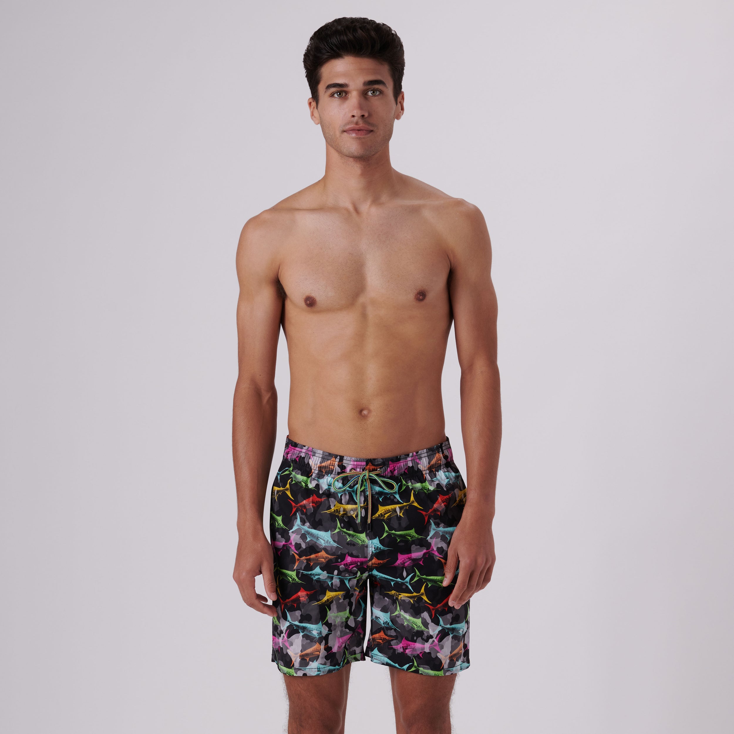 Cosmo longnose fish swim trunks in lightweight, easy care, quick-dry, comfort stretch polyester with resistance to UV rays, chlorine, salt and sunscreen feature an elasticized waistband, drawstring closure, breathable stretch mesh lining, drainage grommets, side pockets and back flap pocket.