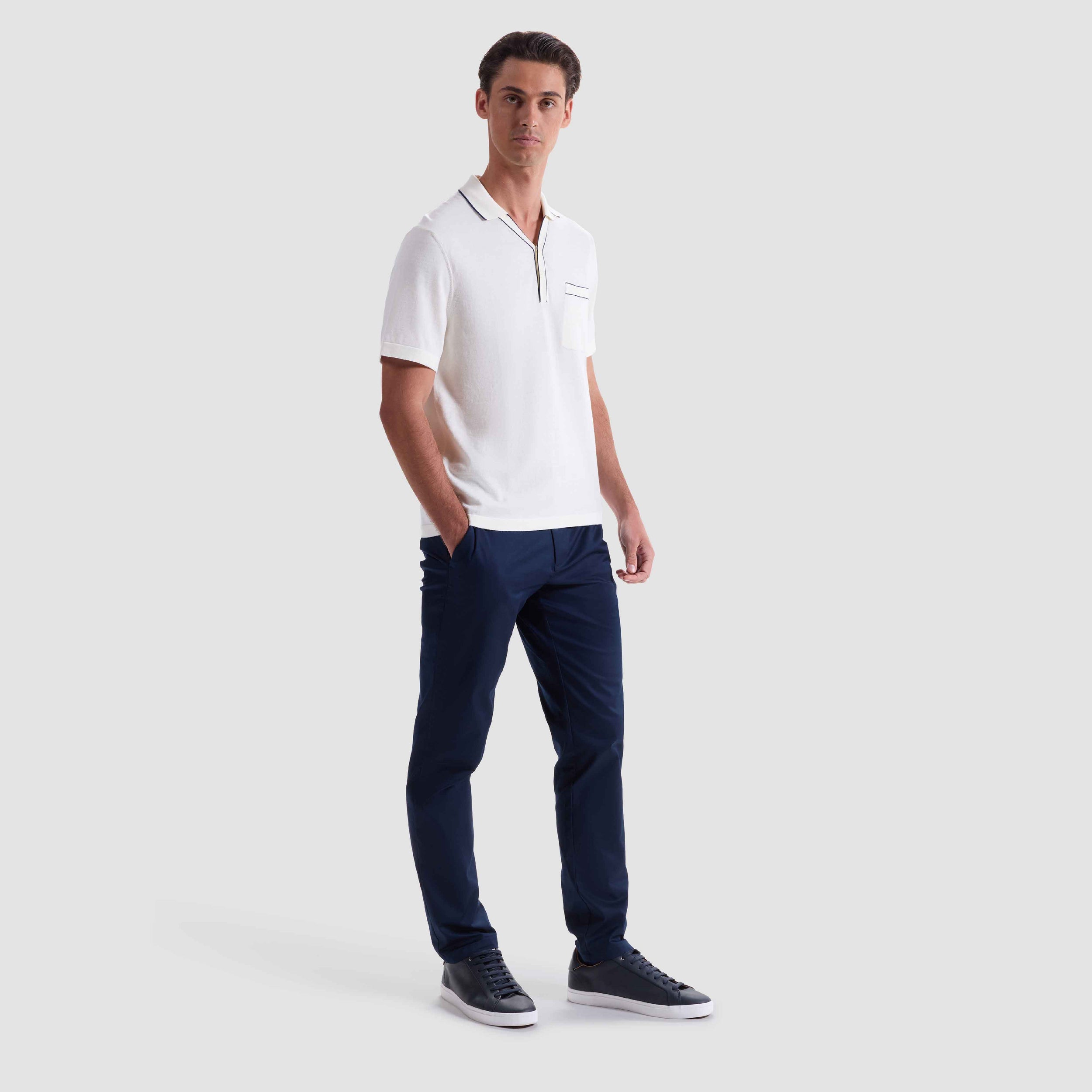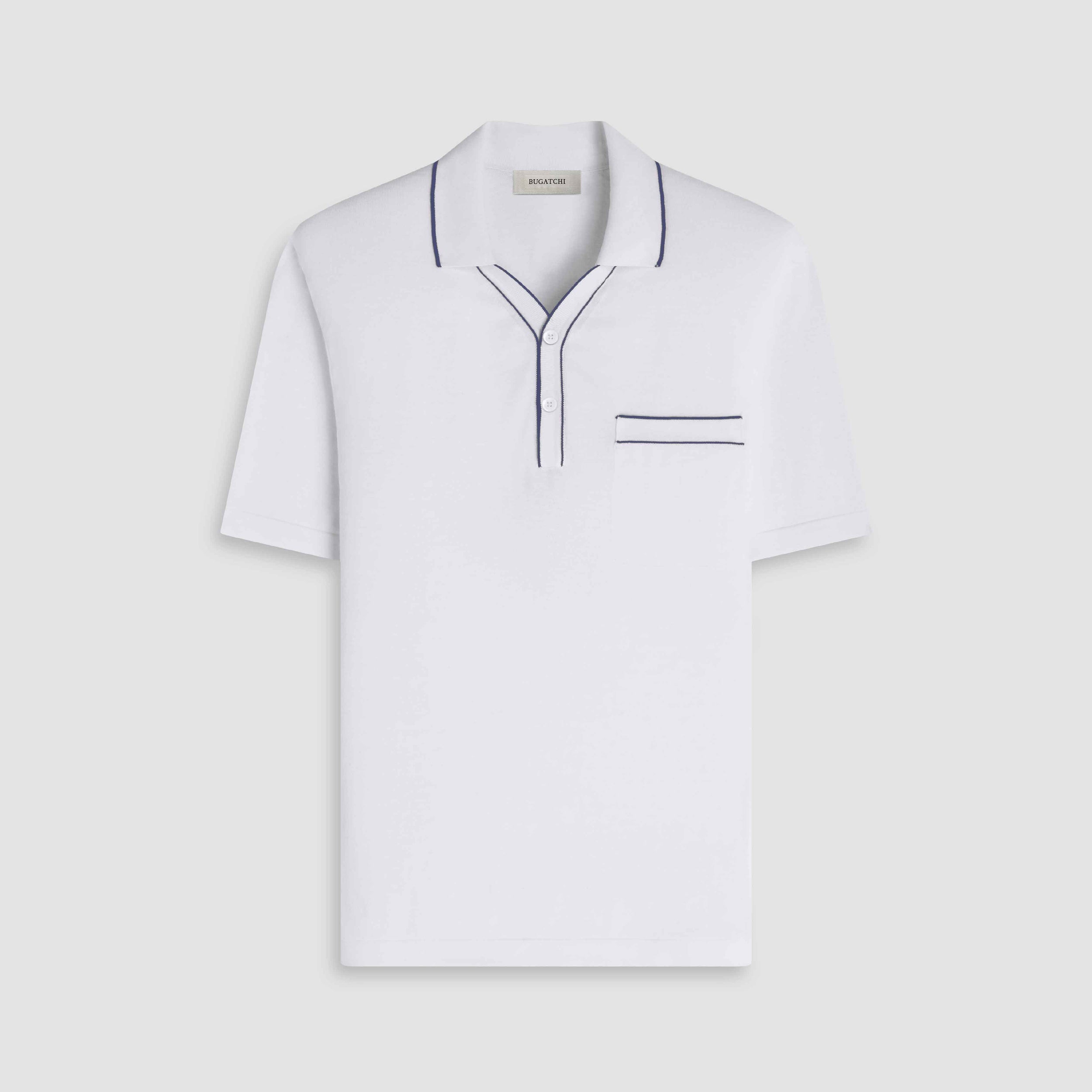 Crafted from a soft cotton-silk blend, this short sleeve polo sweater features a Johnny collar with a two-button closure accented by mother-of-pearl buttons. Refined contrast piping along the collar, placket, and chest pocket adds a touch of sophistication, while the lightweight knit ensures a smooth, breathable feel. A versatile staple for elevated casual wear.