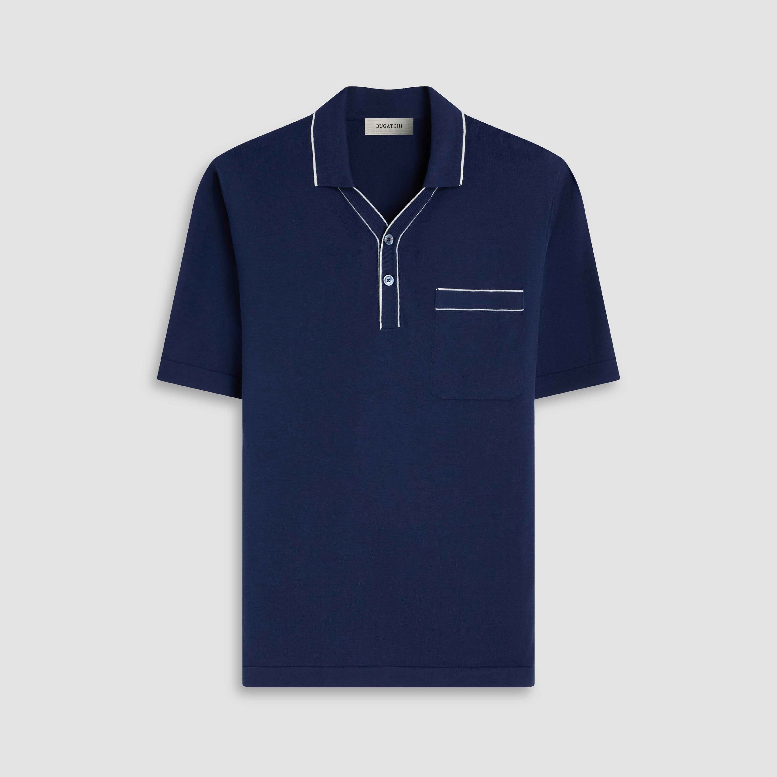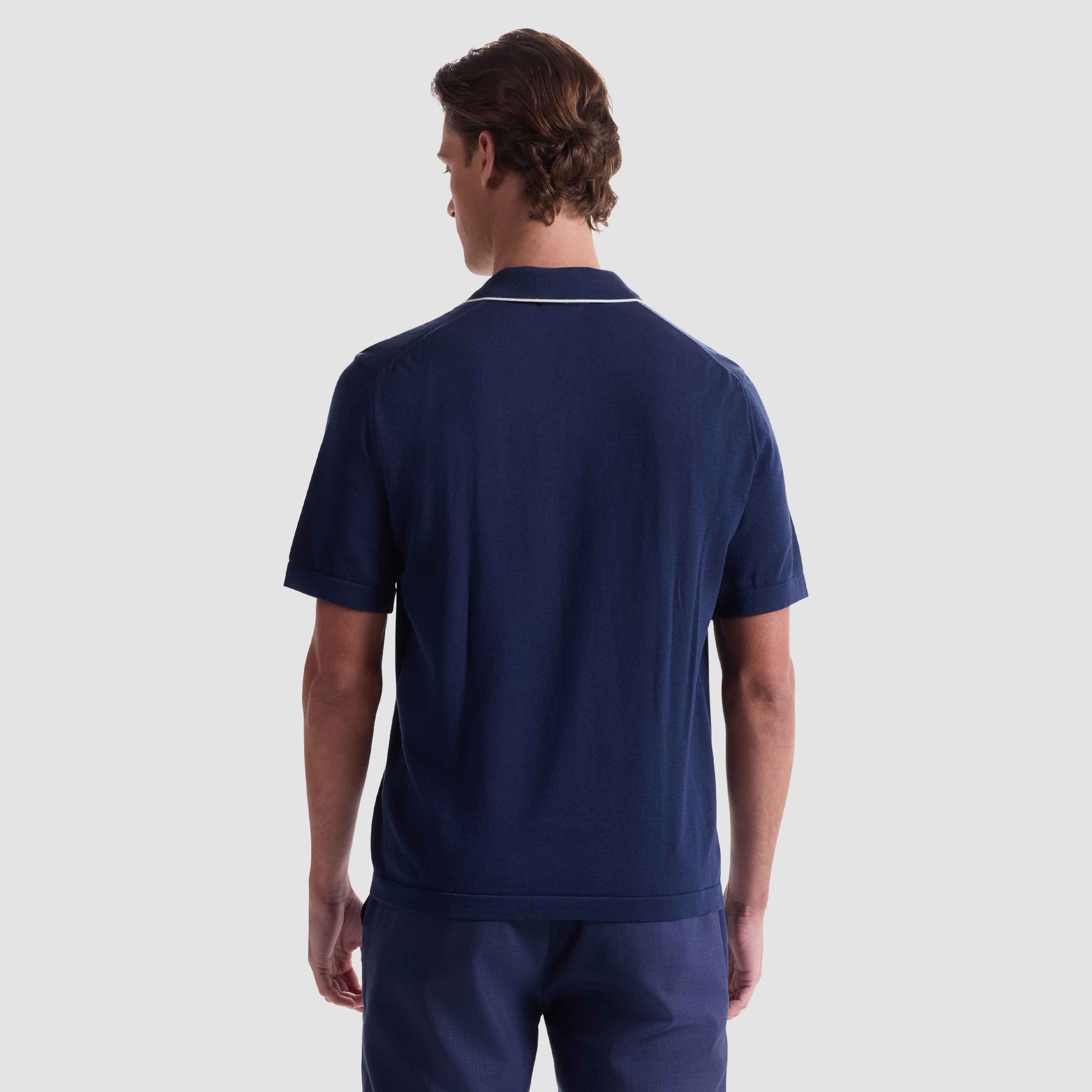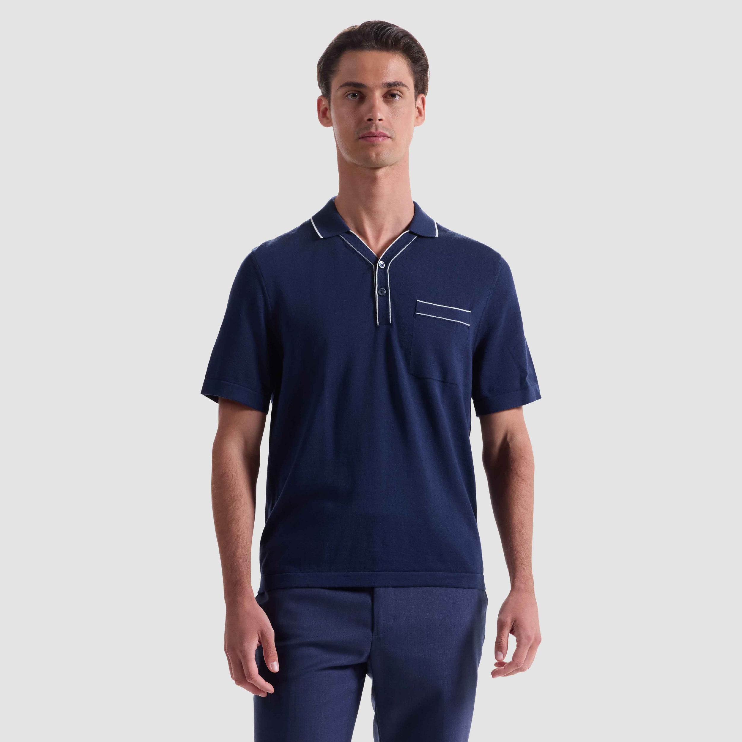 Crafted from a soft cotton-silk blend, this short sleeve polo sweater features a Johnny collar with a two-button closure accented by mother-of-pearl buttons. Refined contrast piping along the collar, placket, and chest pocket adds a touch of sophistication, while the lightweight knit ensures a smooth, breathable feel. A versatile staple for elevated casual wear.
