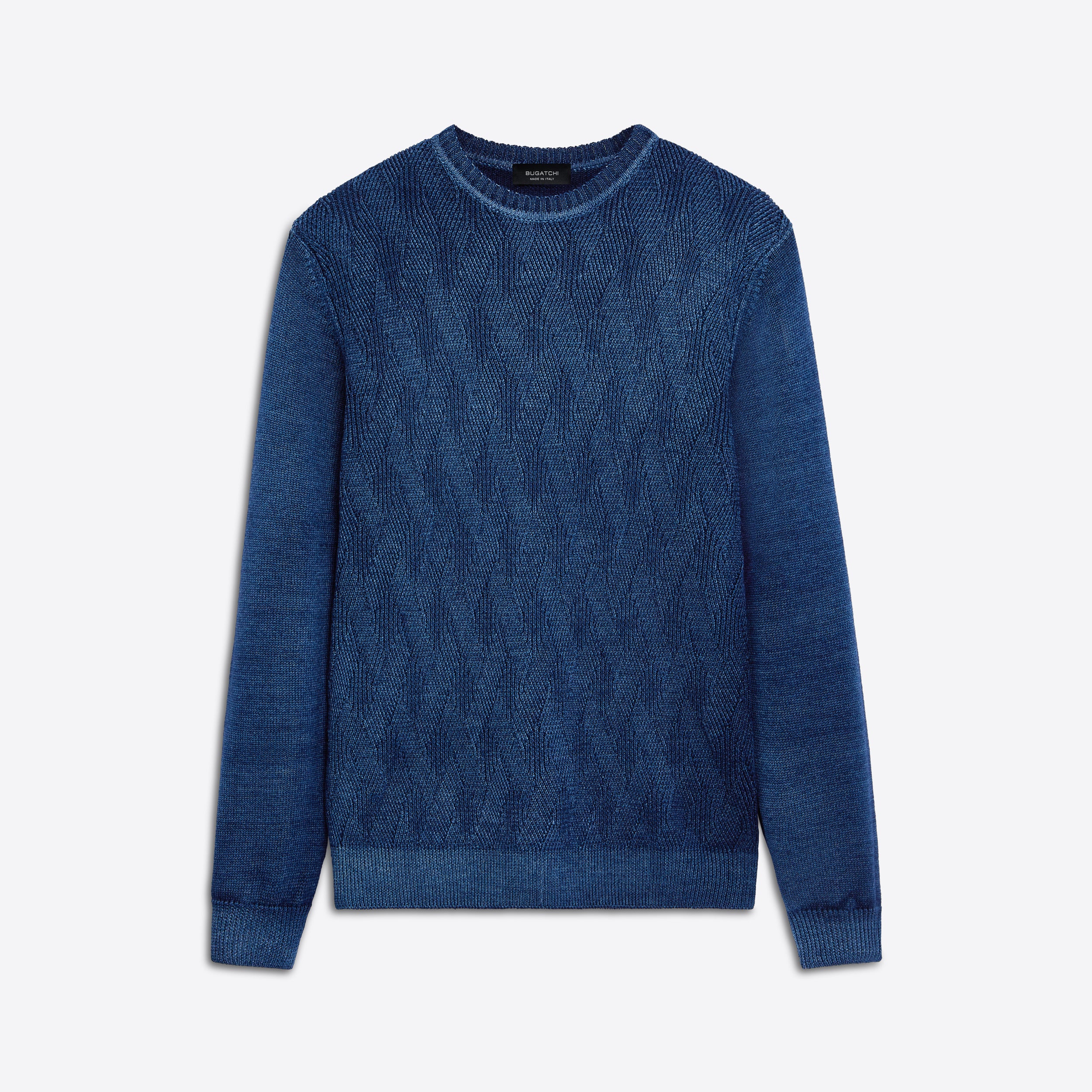 Crew neck sweater in diamond cable 100% extra fine merino wool with Harmony 4.0 special finishing. This sweater is made with a high twist yarn that is breathable, hygroscopic, water repellent, machine washable and crease proof for long lasting performance wash after wash. Made in Italy.