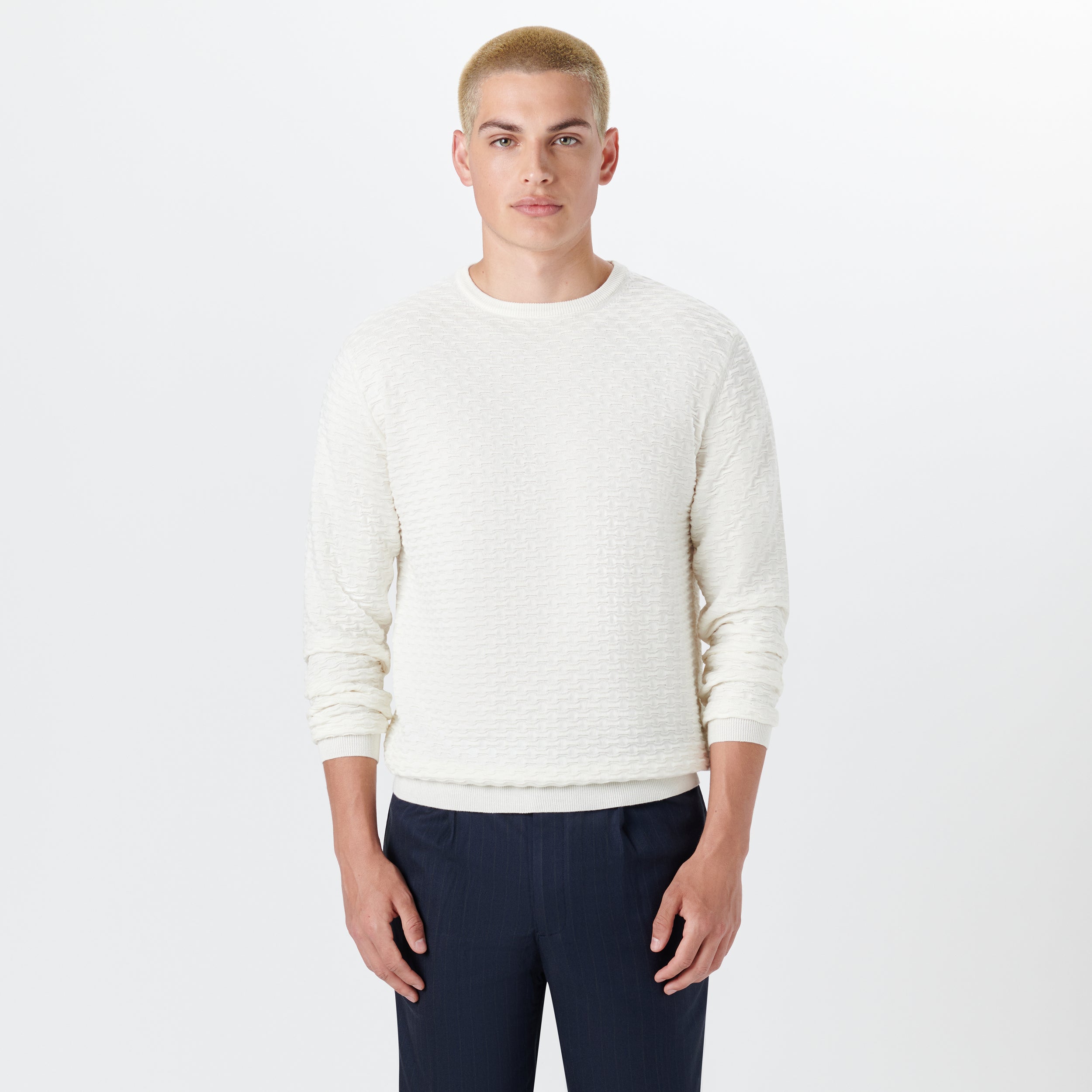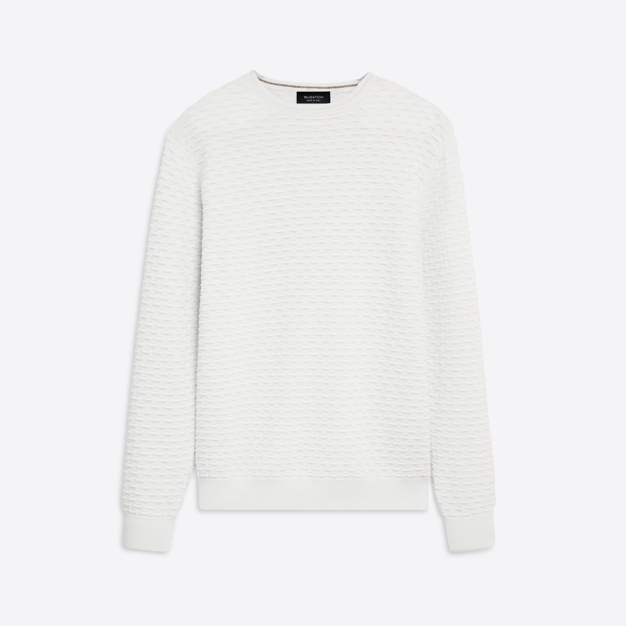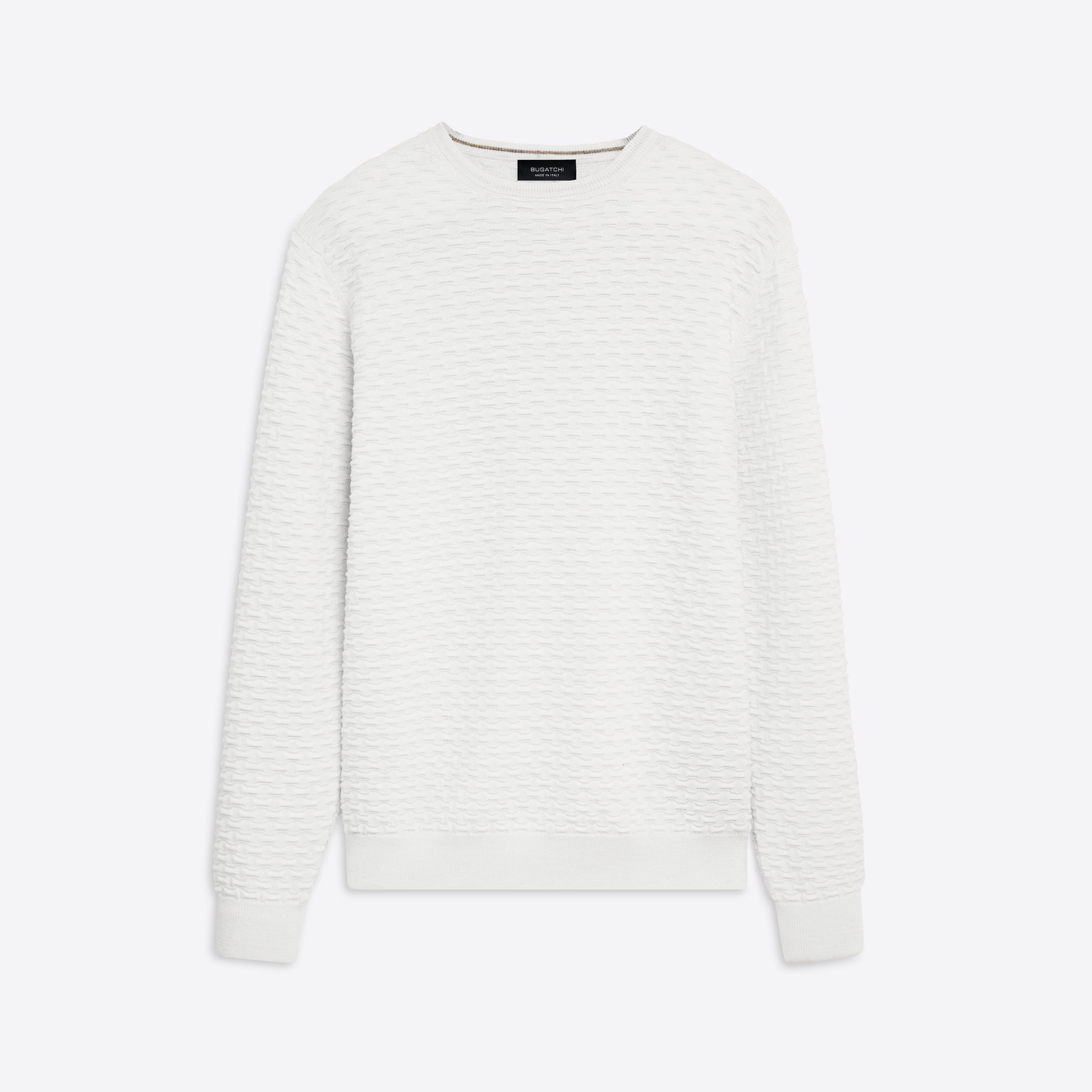 Crew neck sweater in jacquard wave knit cotton and cashmere blend with ribbed collar, cuffs and waistband. Made in Italy.