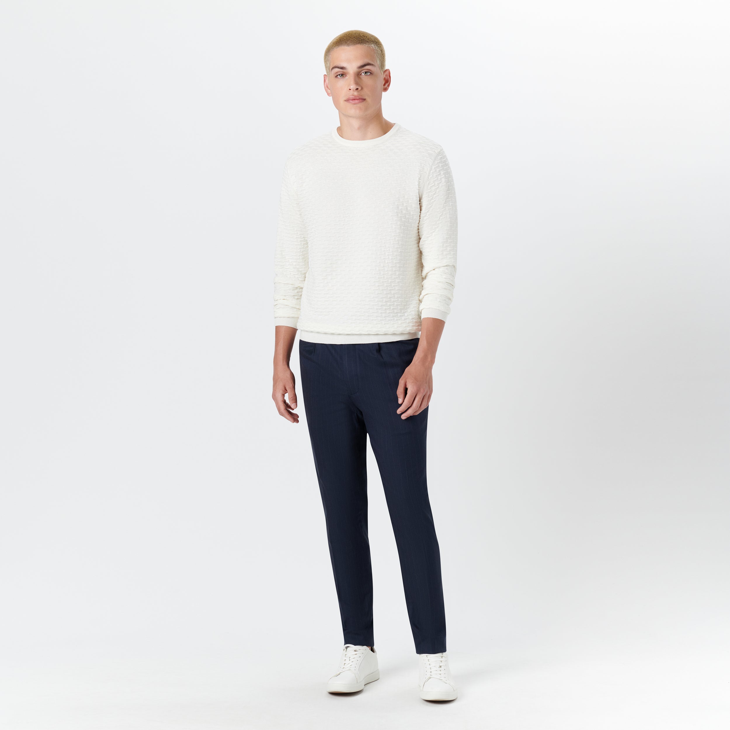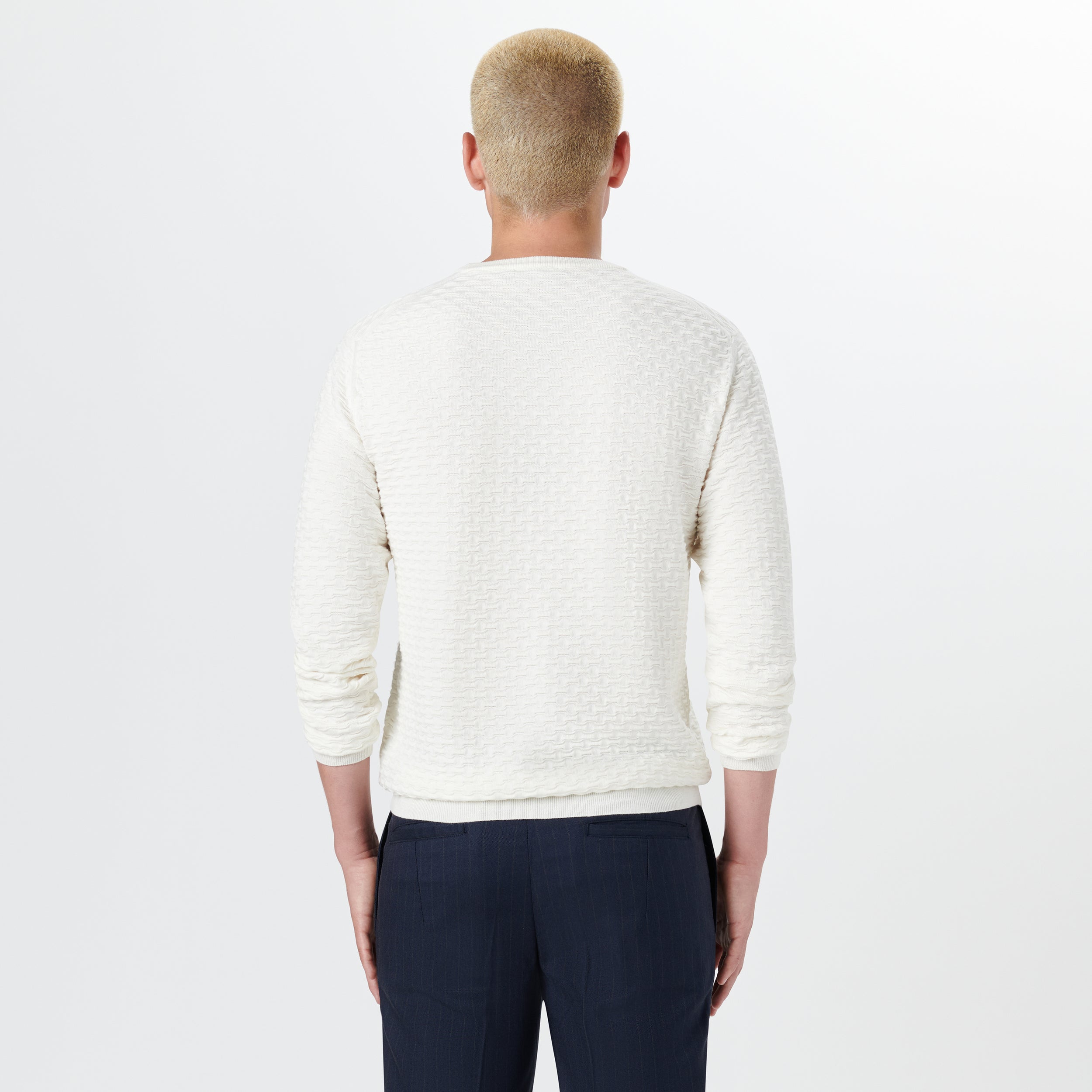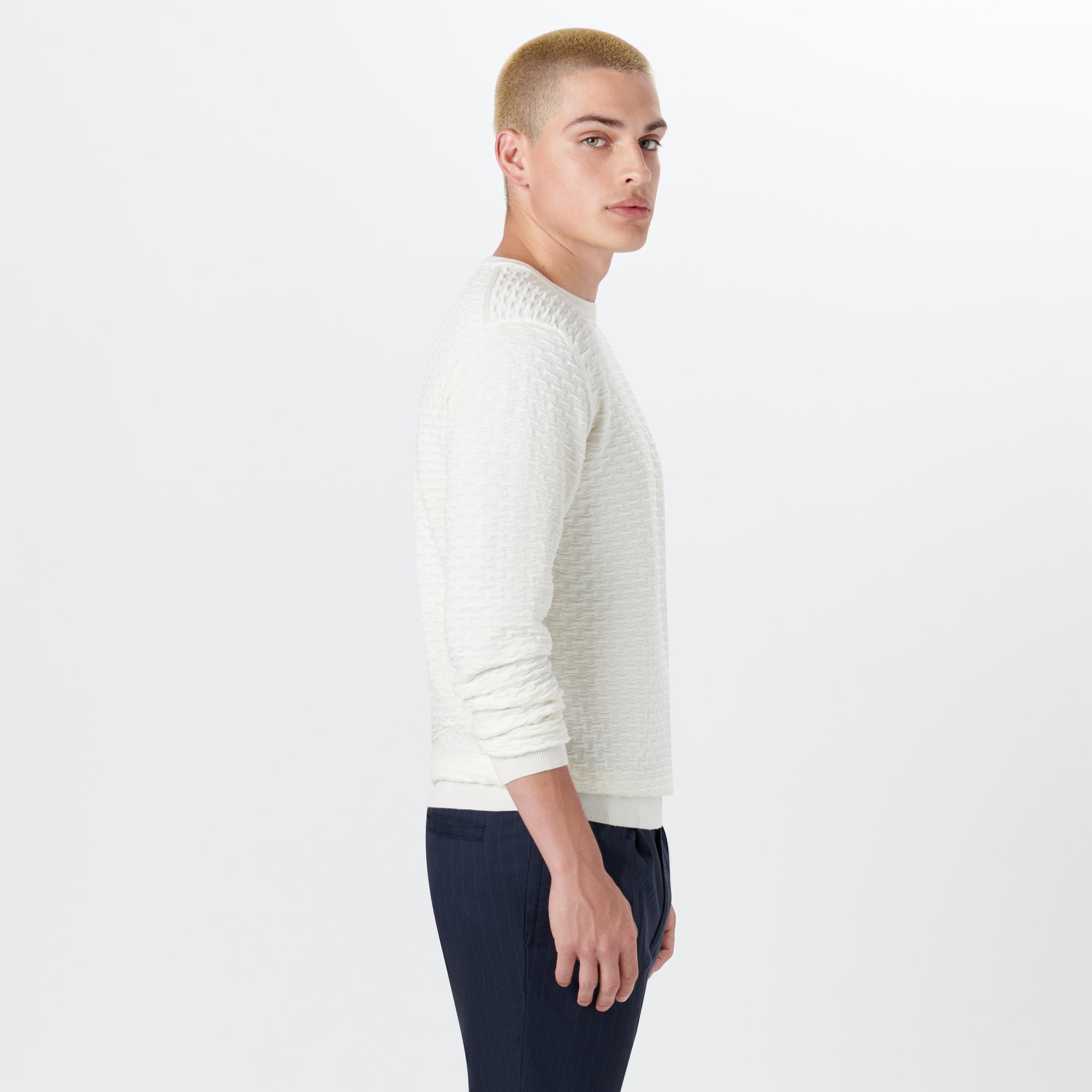 Crew neck sweater in jacquard wave knit cotton and cashmere blend with ribbed collar, cuffs and waistband. Made in Italy.