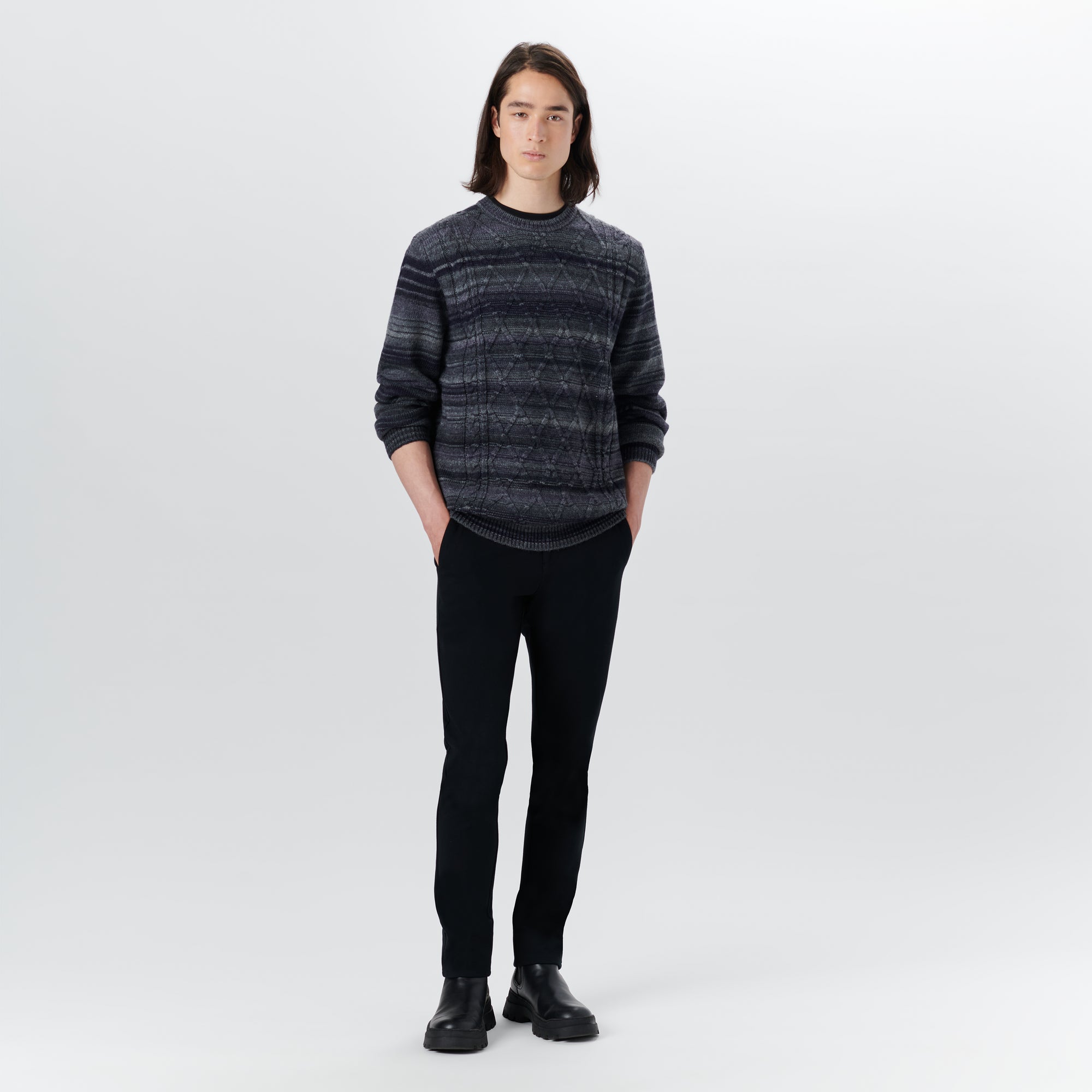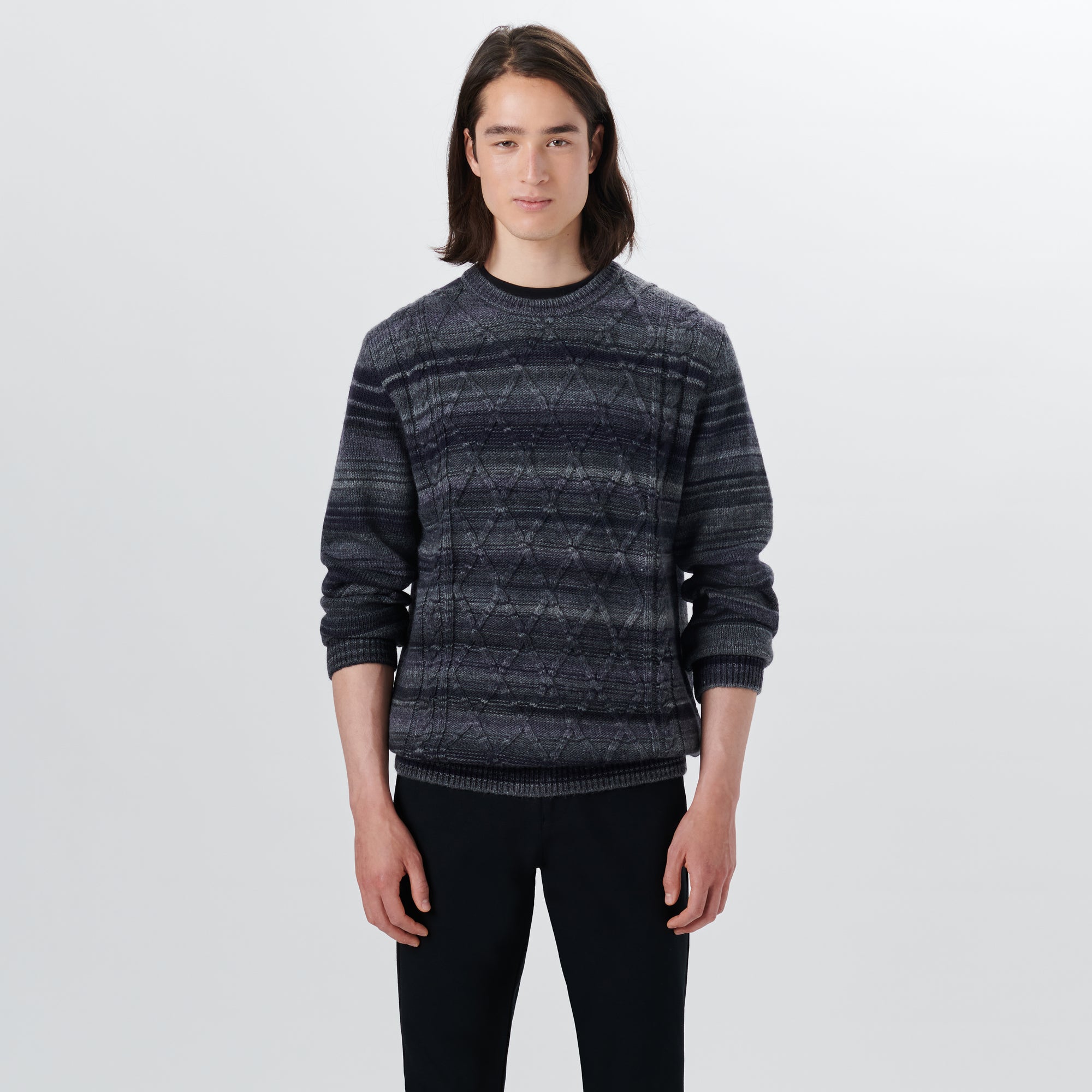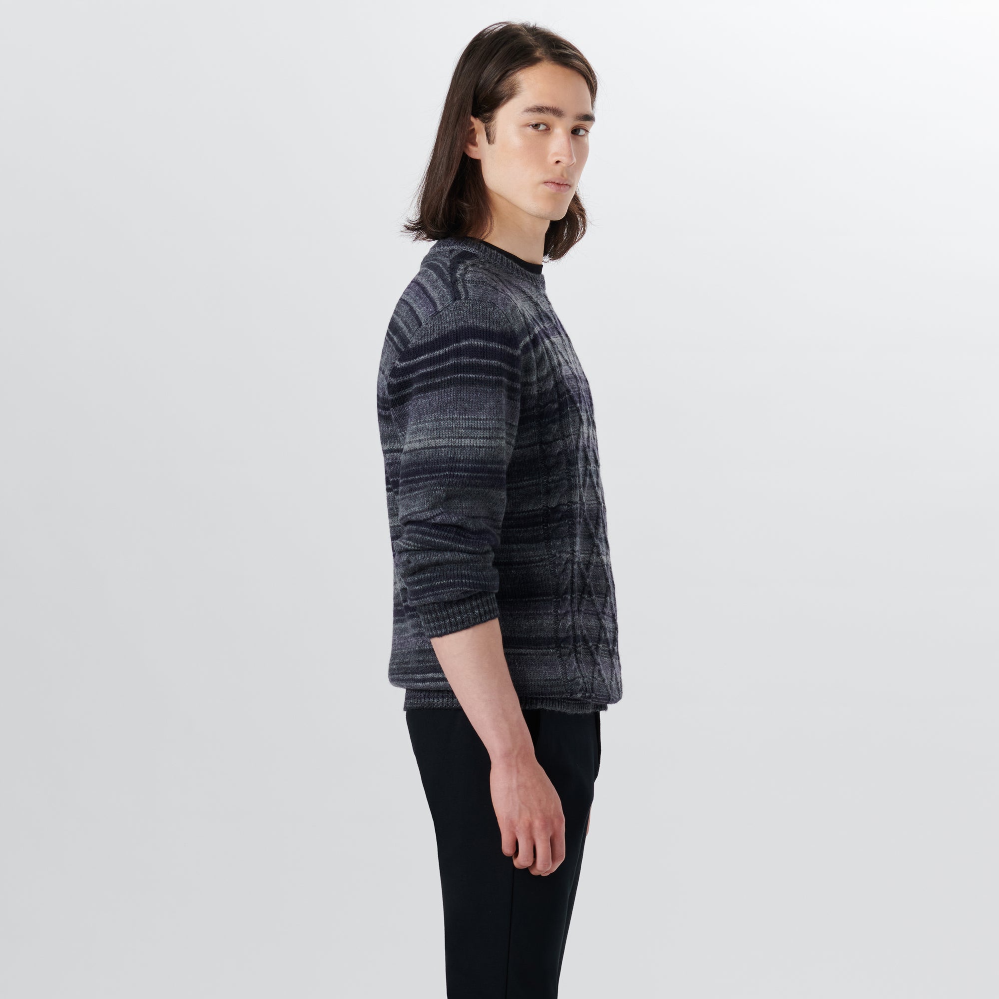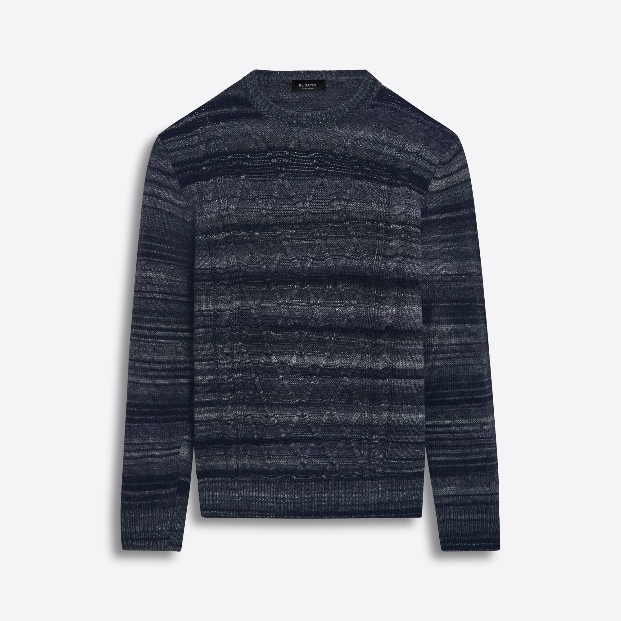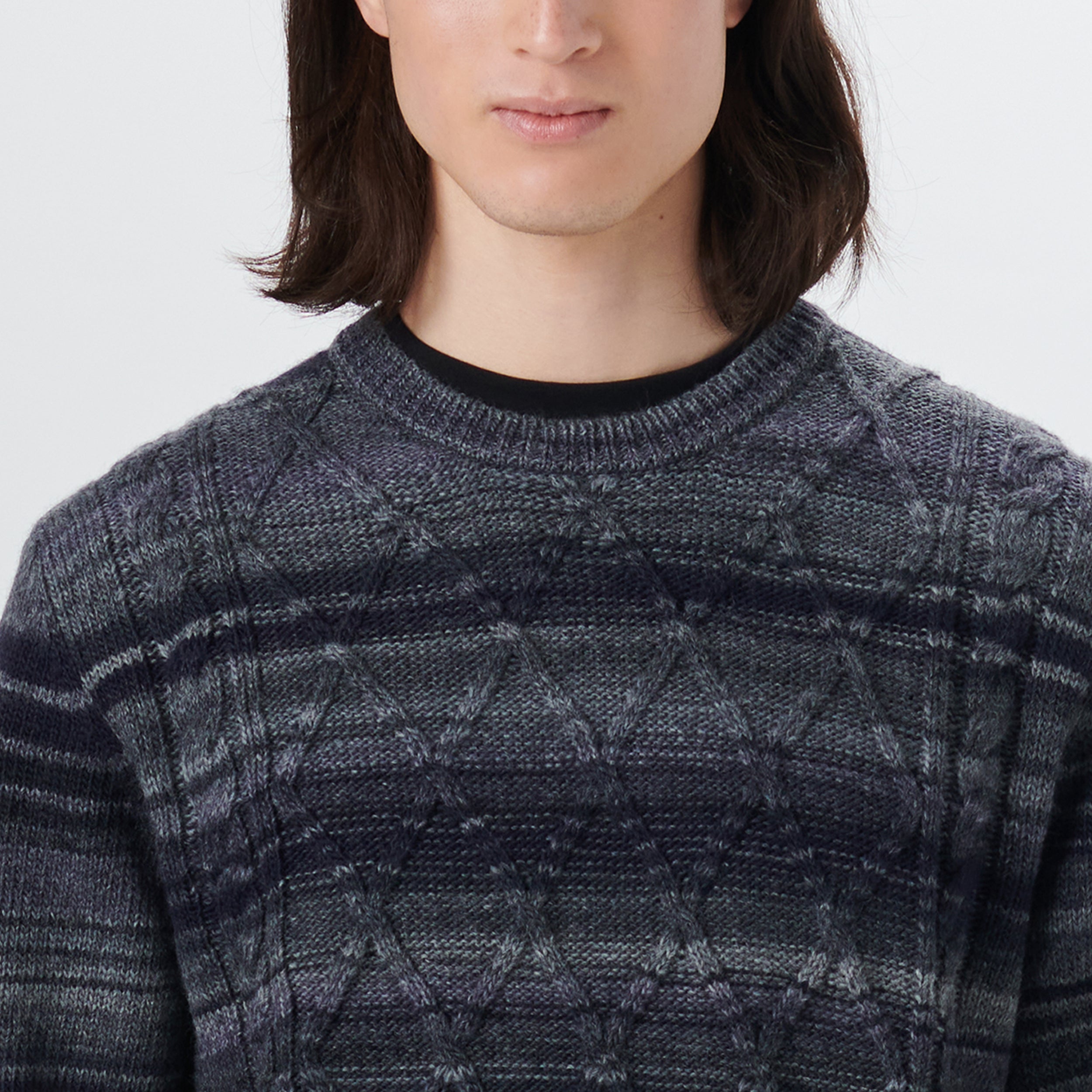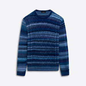 Crew neck striped cable jacquard sweater in wool blend with ribbed collar, cuffs and waistband. Made in Italy.