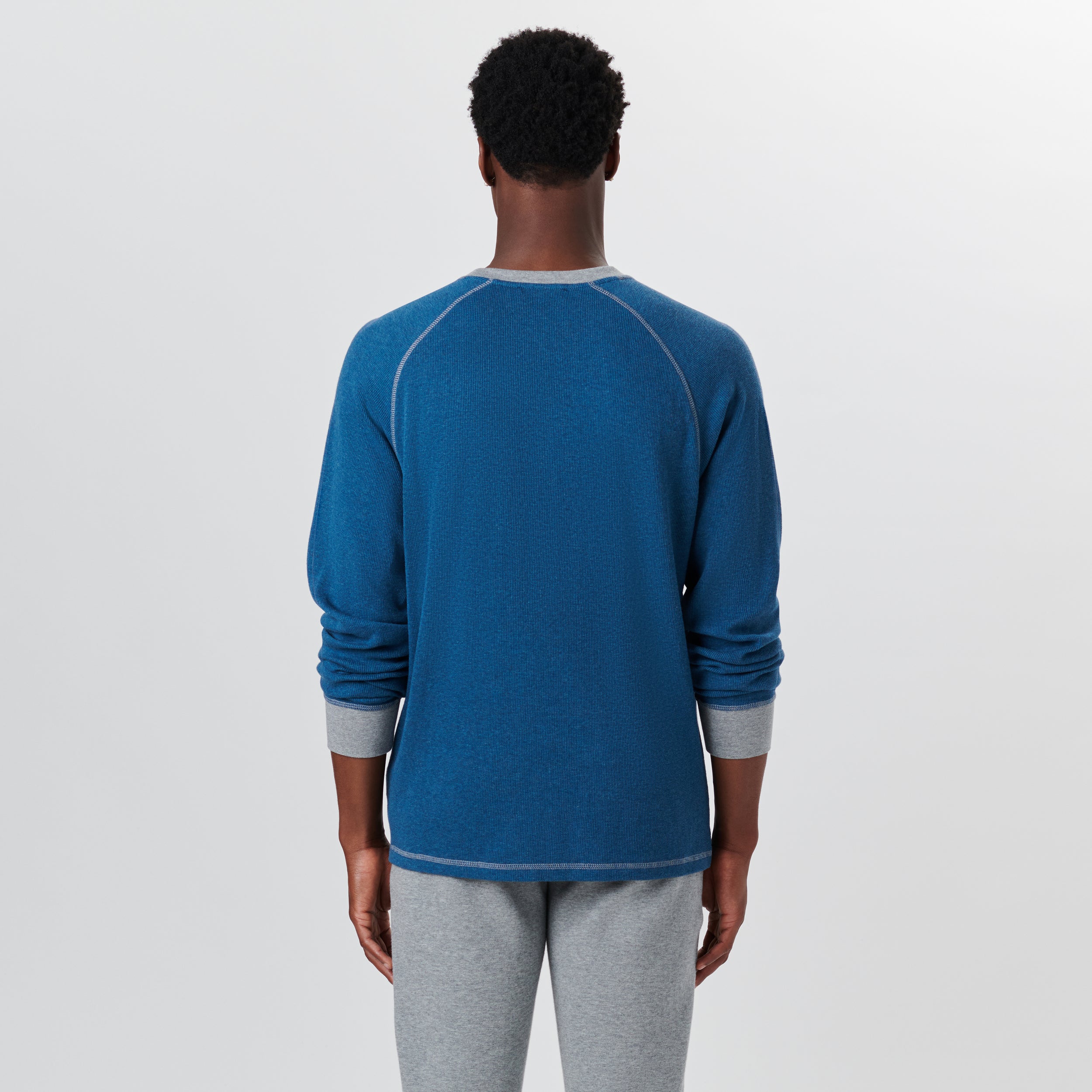 Long sleeve crew neck in 100% cotton waffle knit with contrast ribbed collar and cuffs and contrast overlock stitch detail.