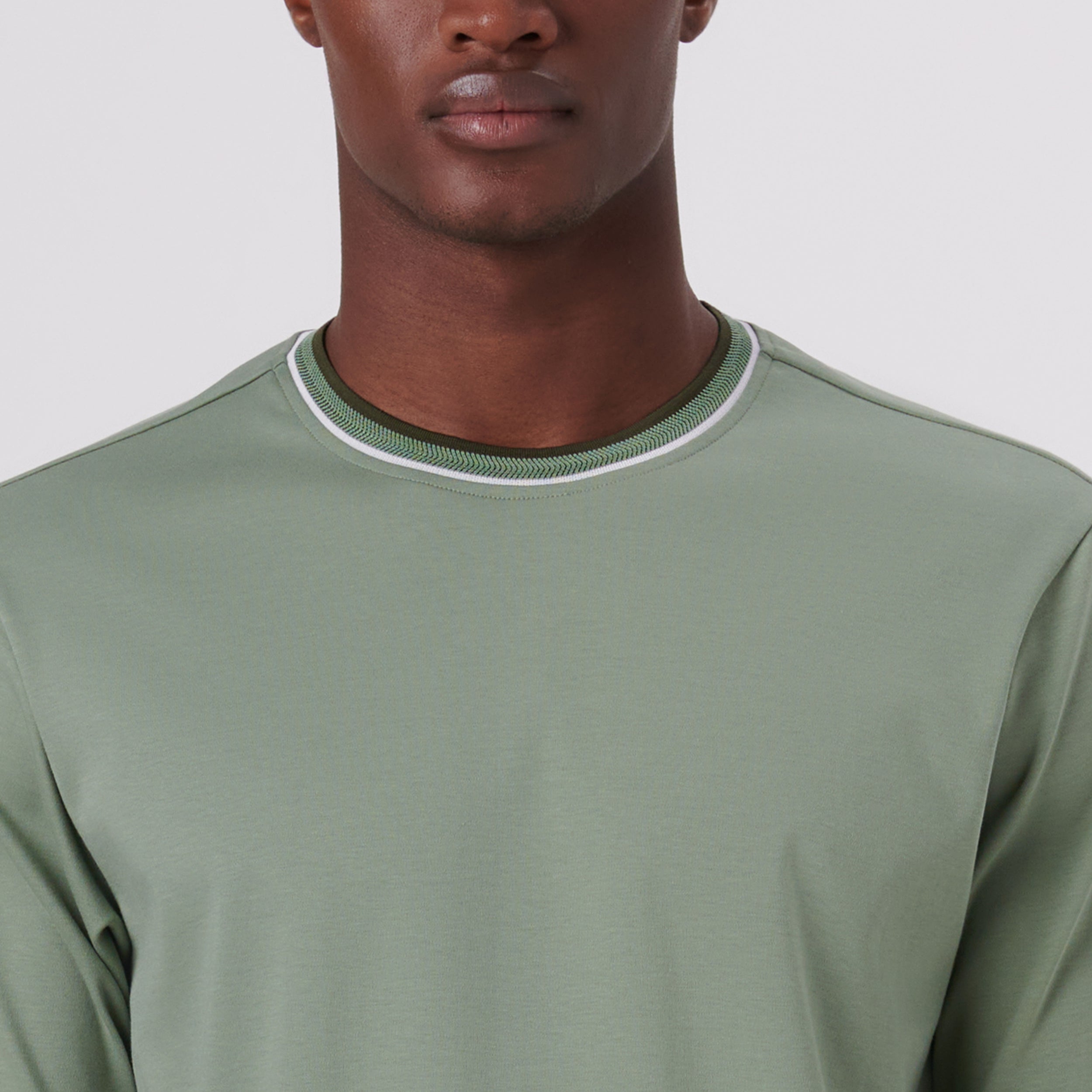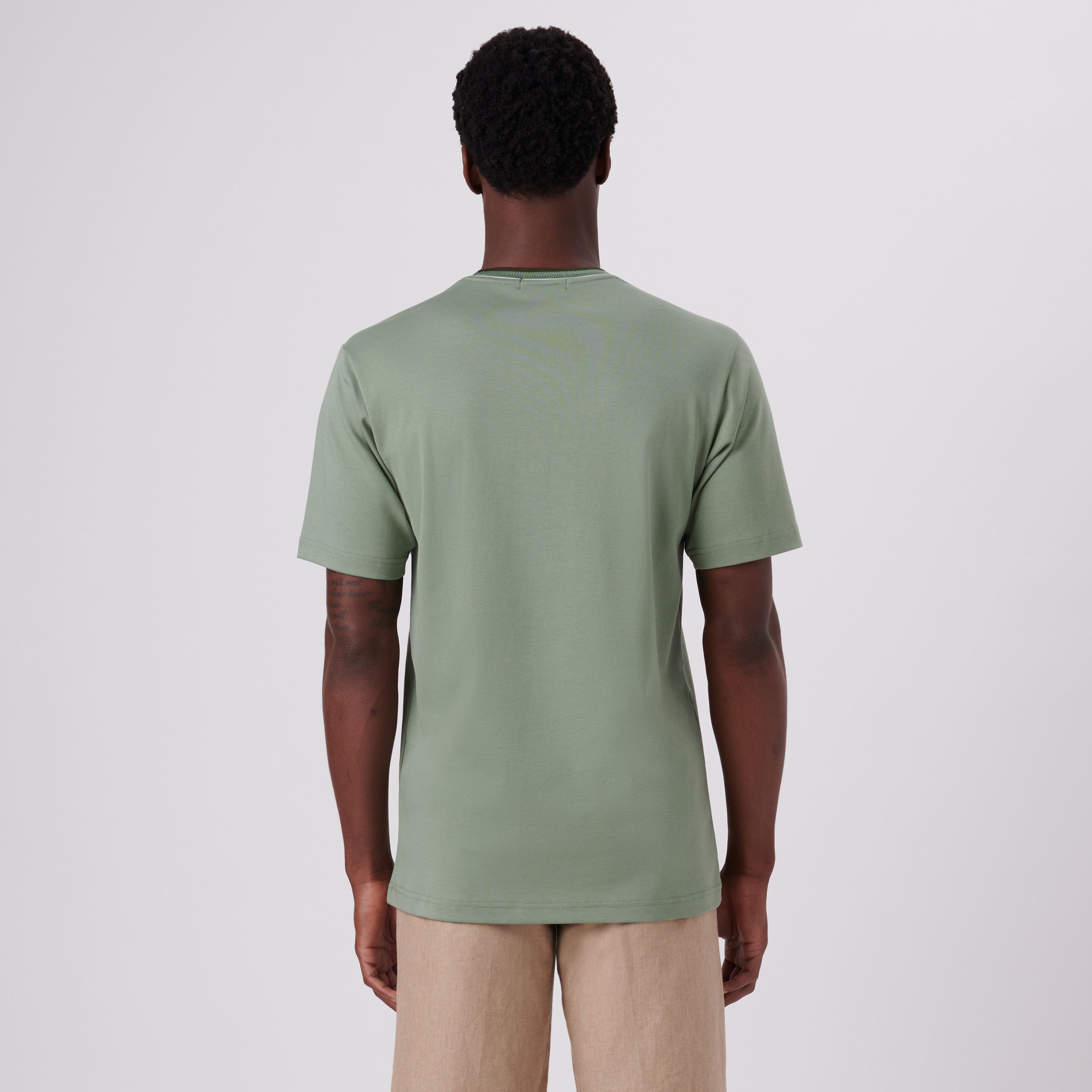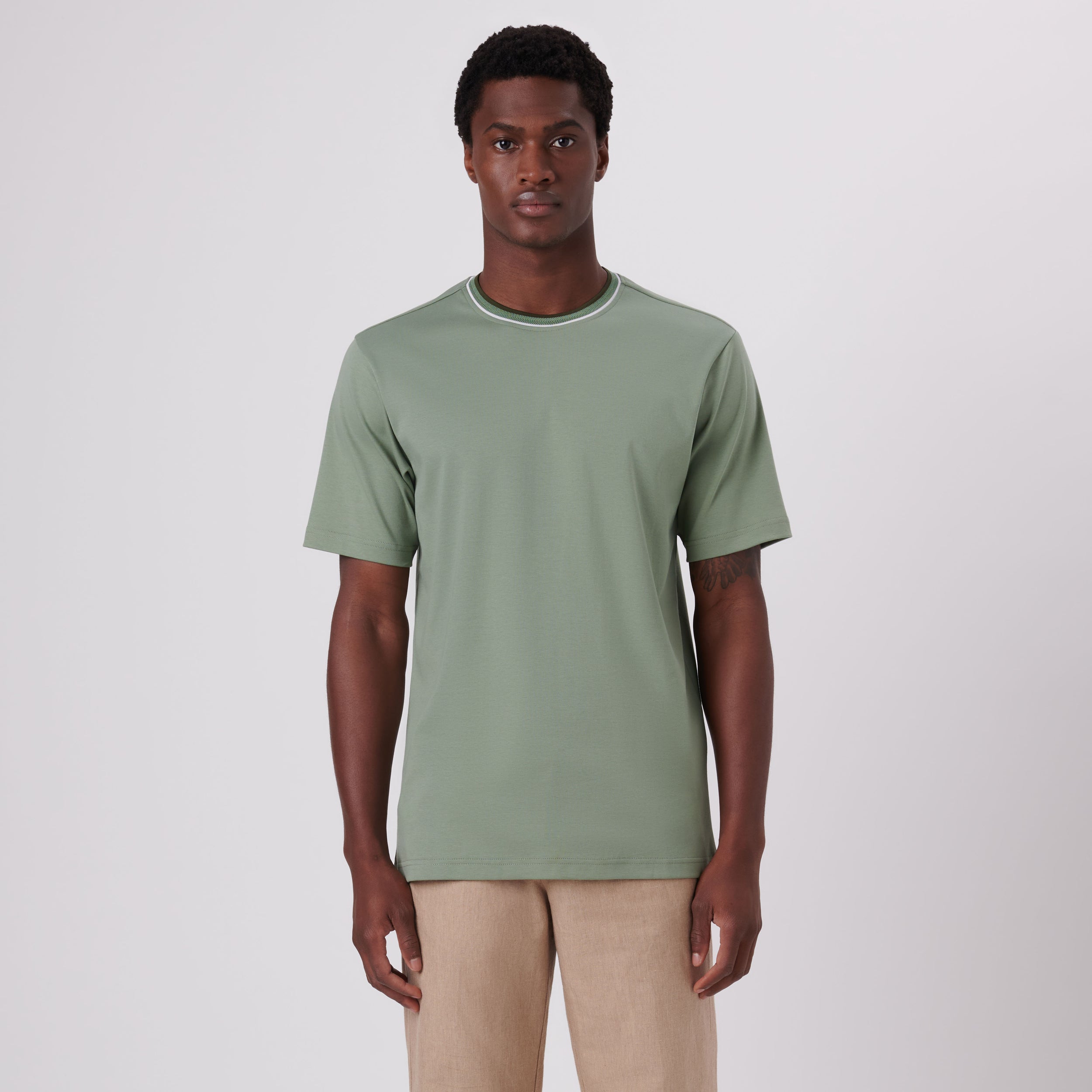 Solid short-sleeved crew neck T-shirt in 100% pima cotton with chevron striped rib knit collar and double contrast tipping detail.