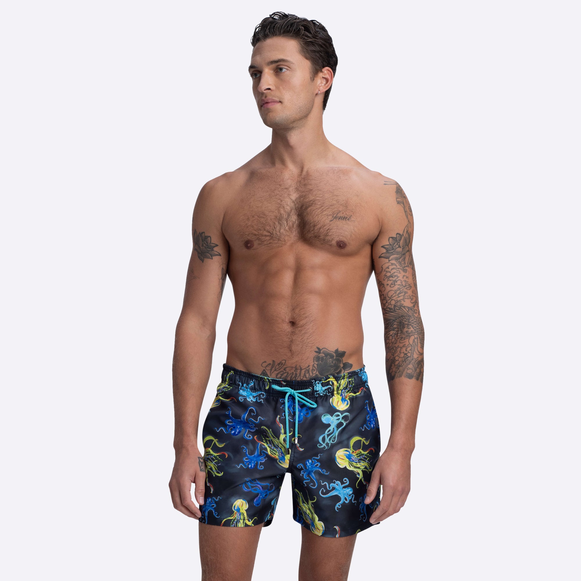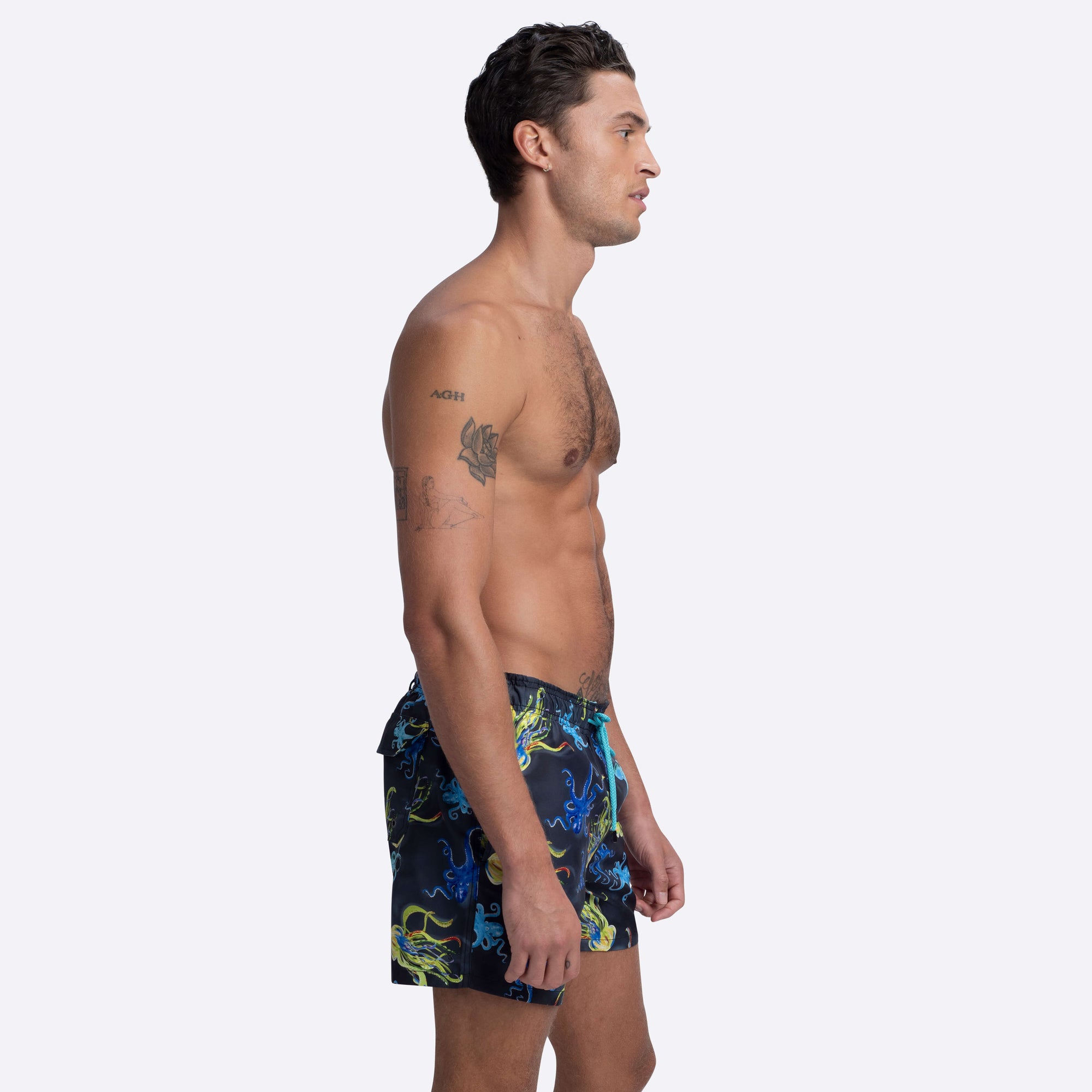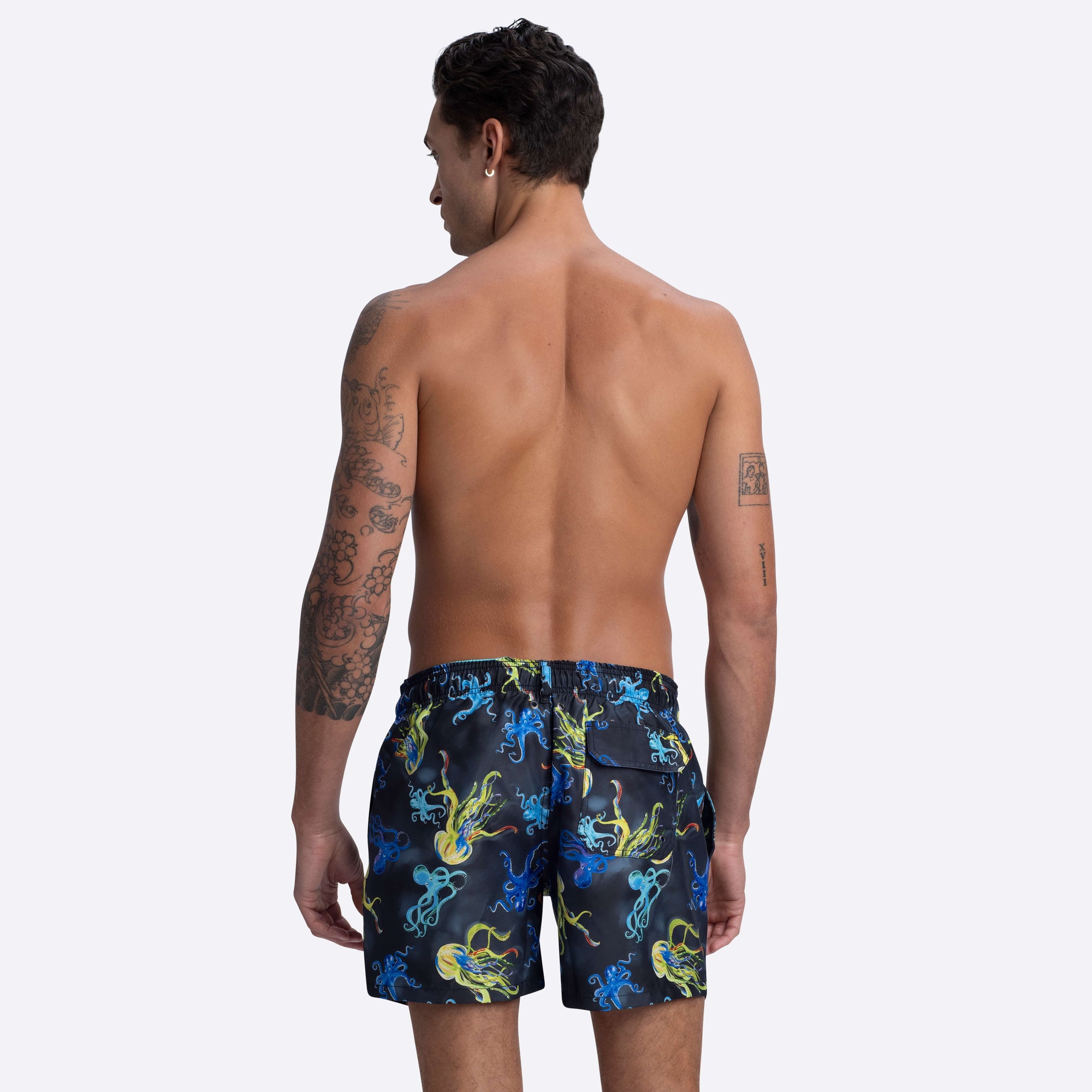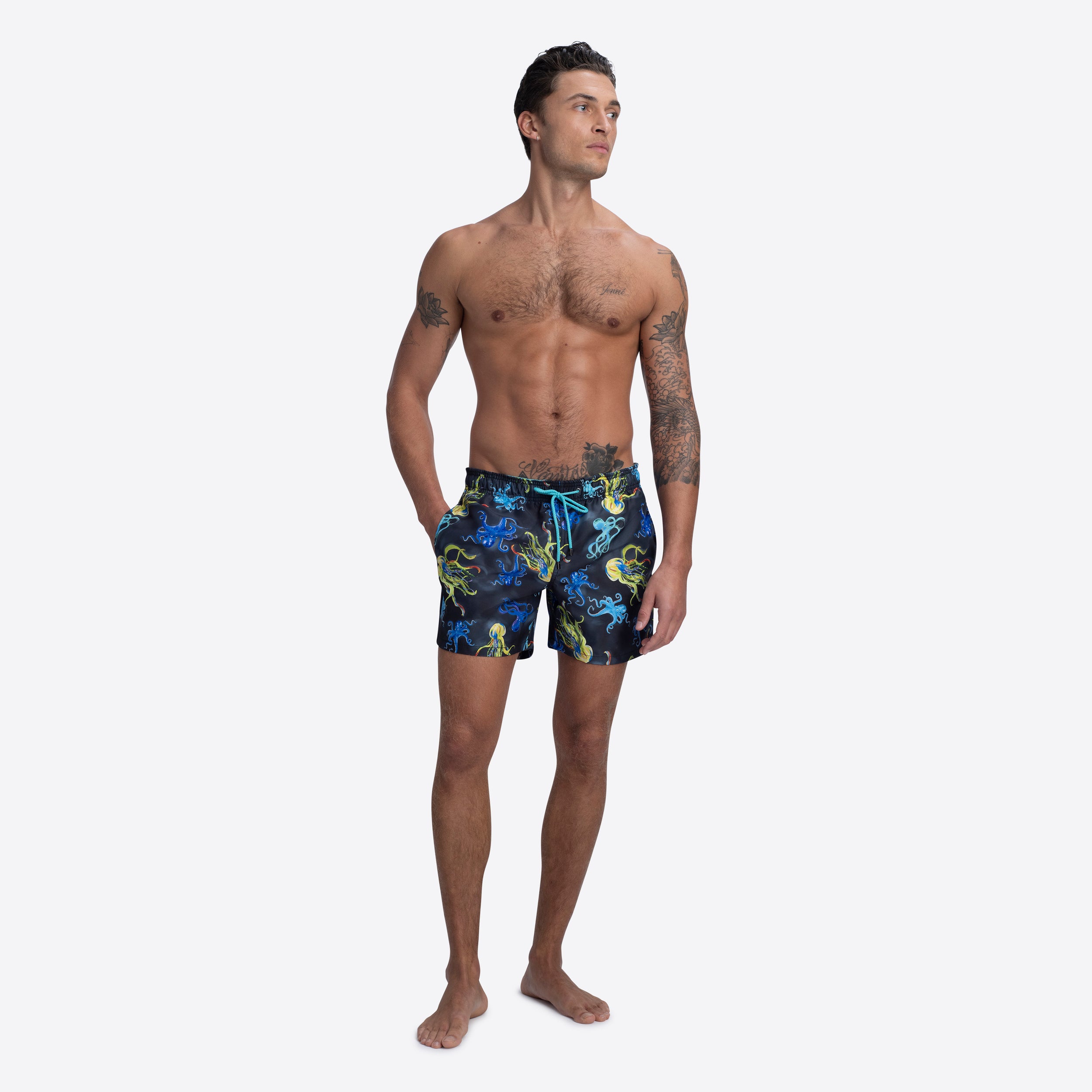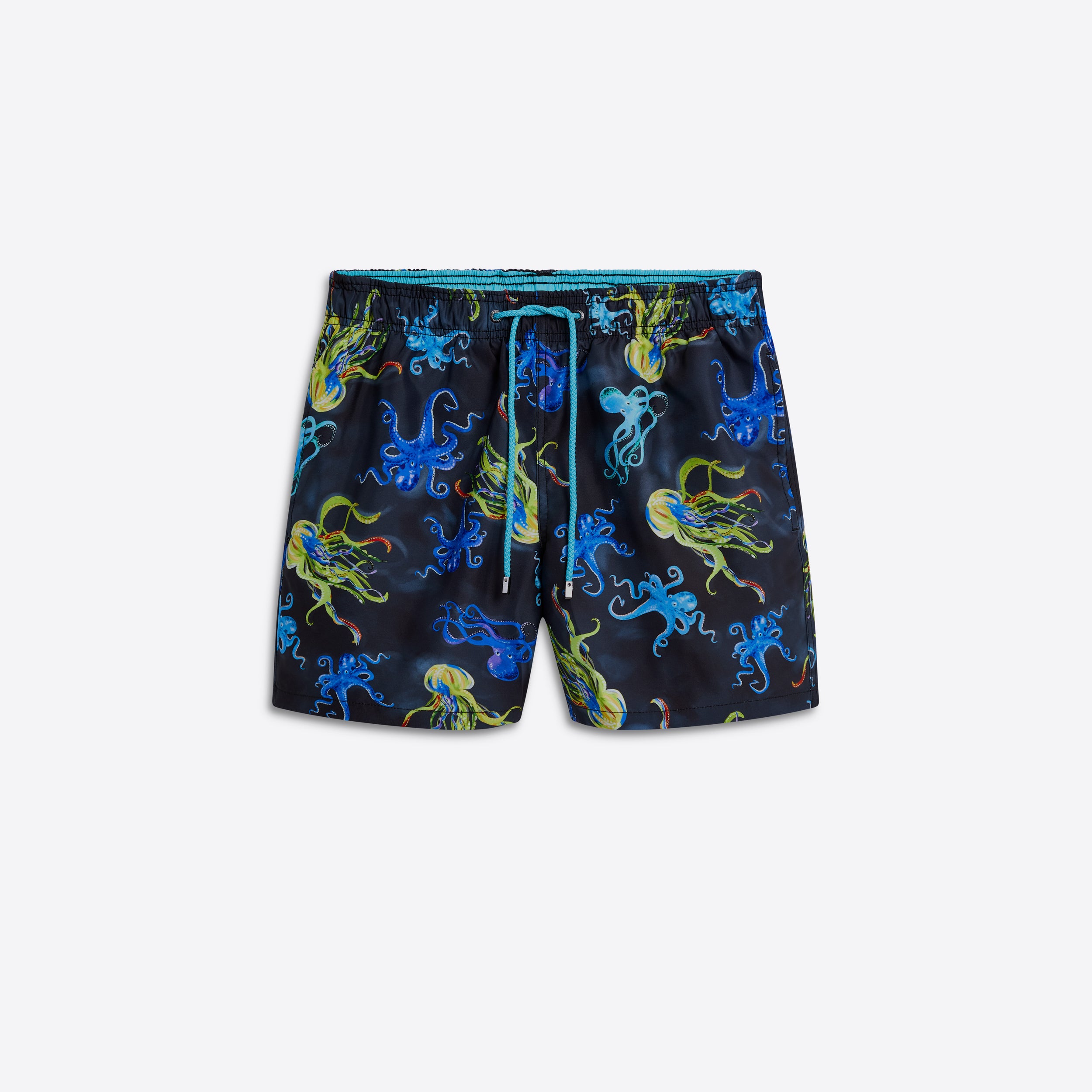 DELANO octopus print swim trunks in lightweight, quick dry fabric with drawstring elasticized waistband, breathable mesh lining and back flap pocket.