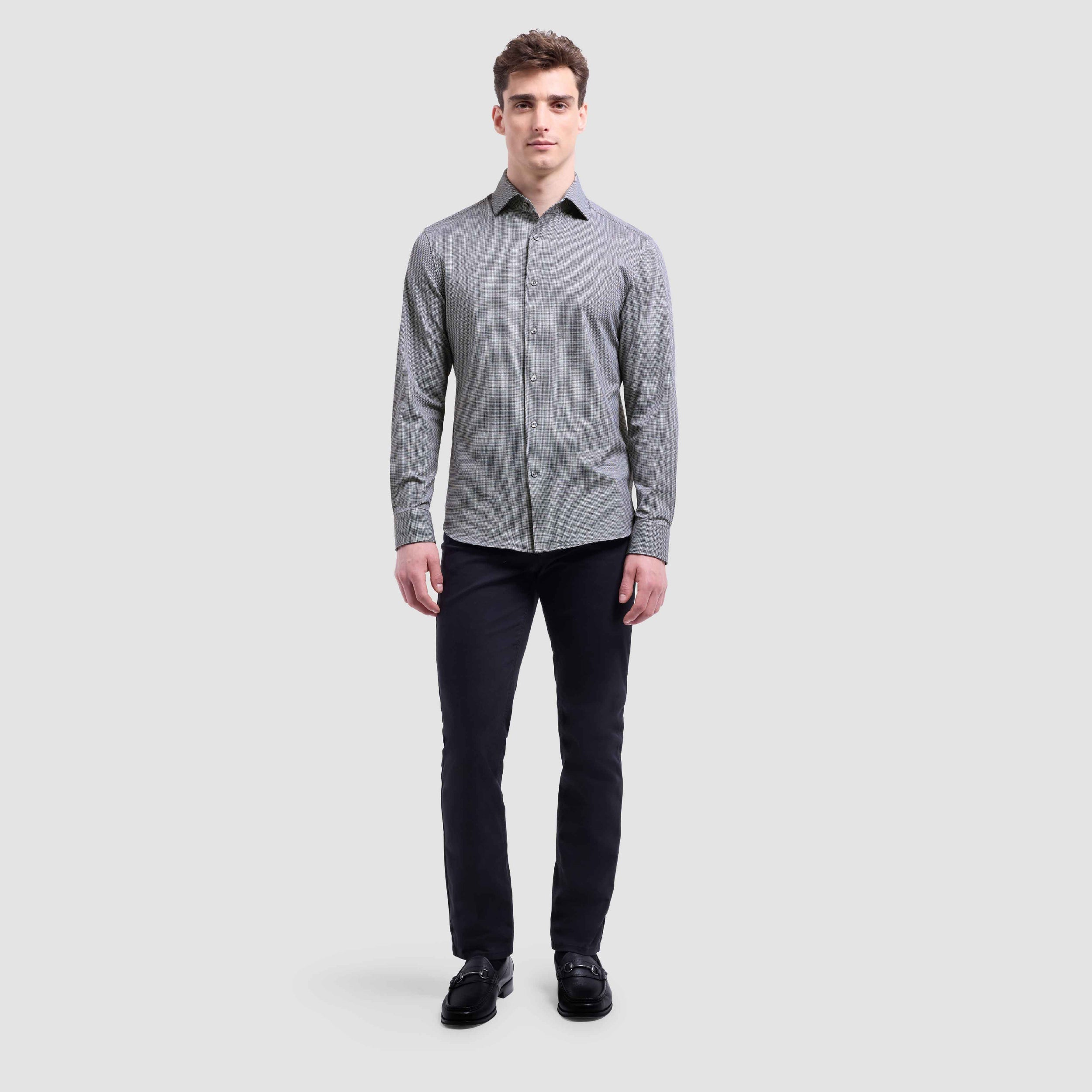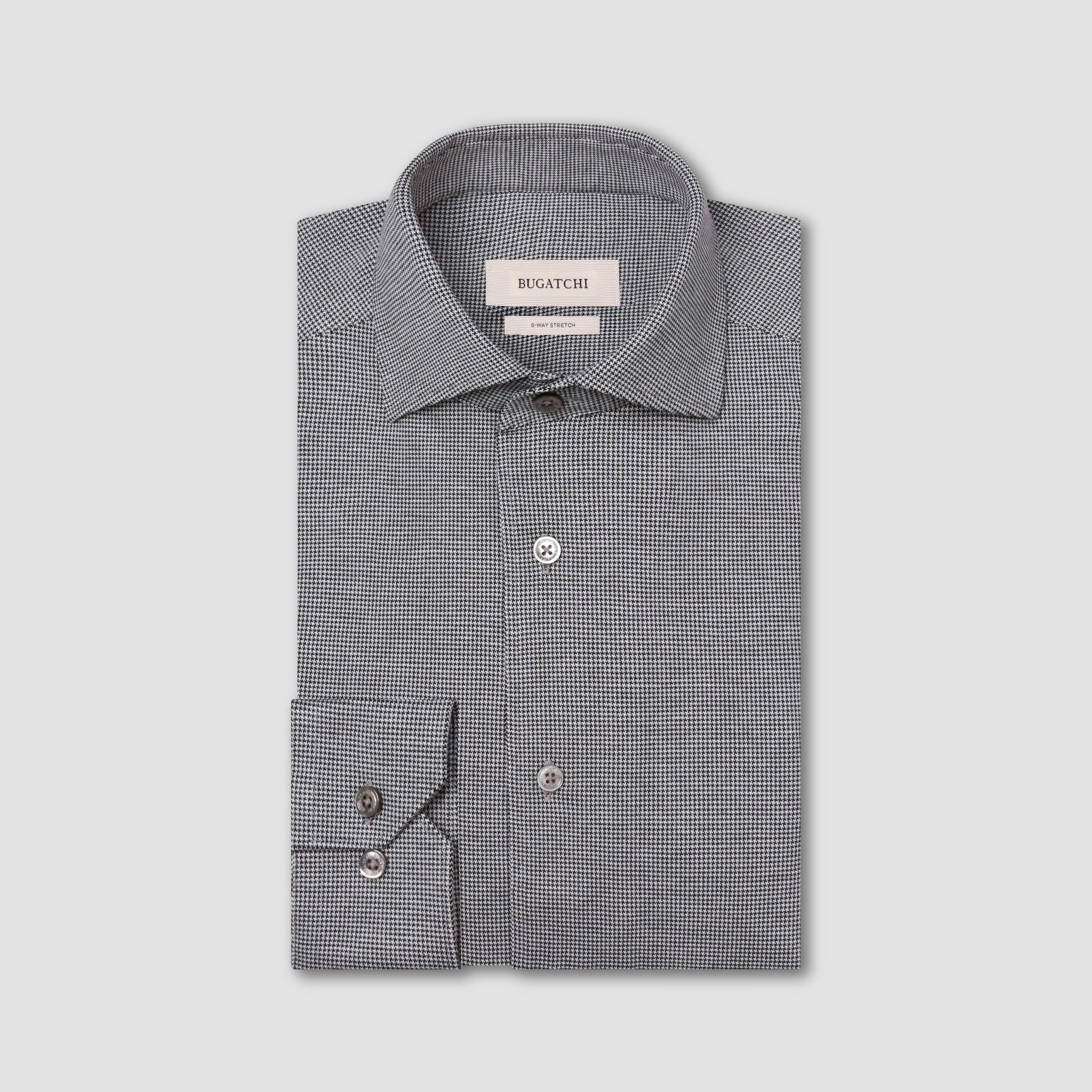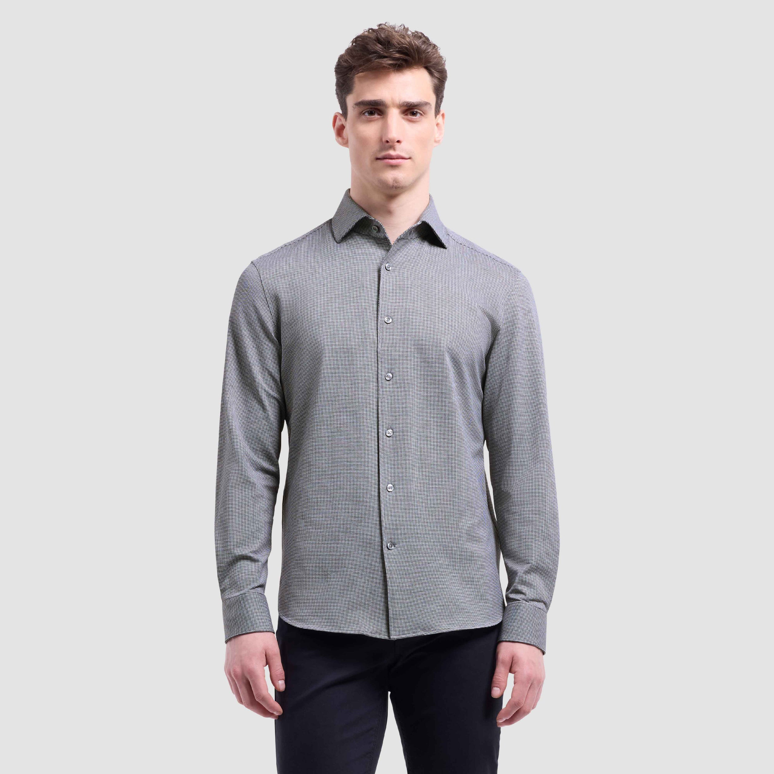 The Devon OoohCotton long-sleeved shirt in houndstooth print features a one-piece spread collar, mother-of-pearl buttons, and a curved hem for a sleek tucked or untucked look. The notched cuffs are adjustable to allow for customized fit and also convertible to accommodate cufflinks. OoohCotton is a performance, double-mercerized, wrinkle-resistant, breathable, and easy-care cotton blend with 8-way stretch, quick-dry, and thermal comfort properties.