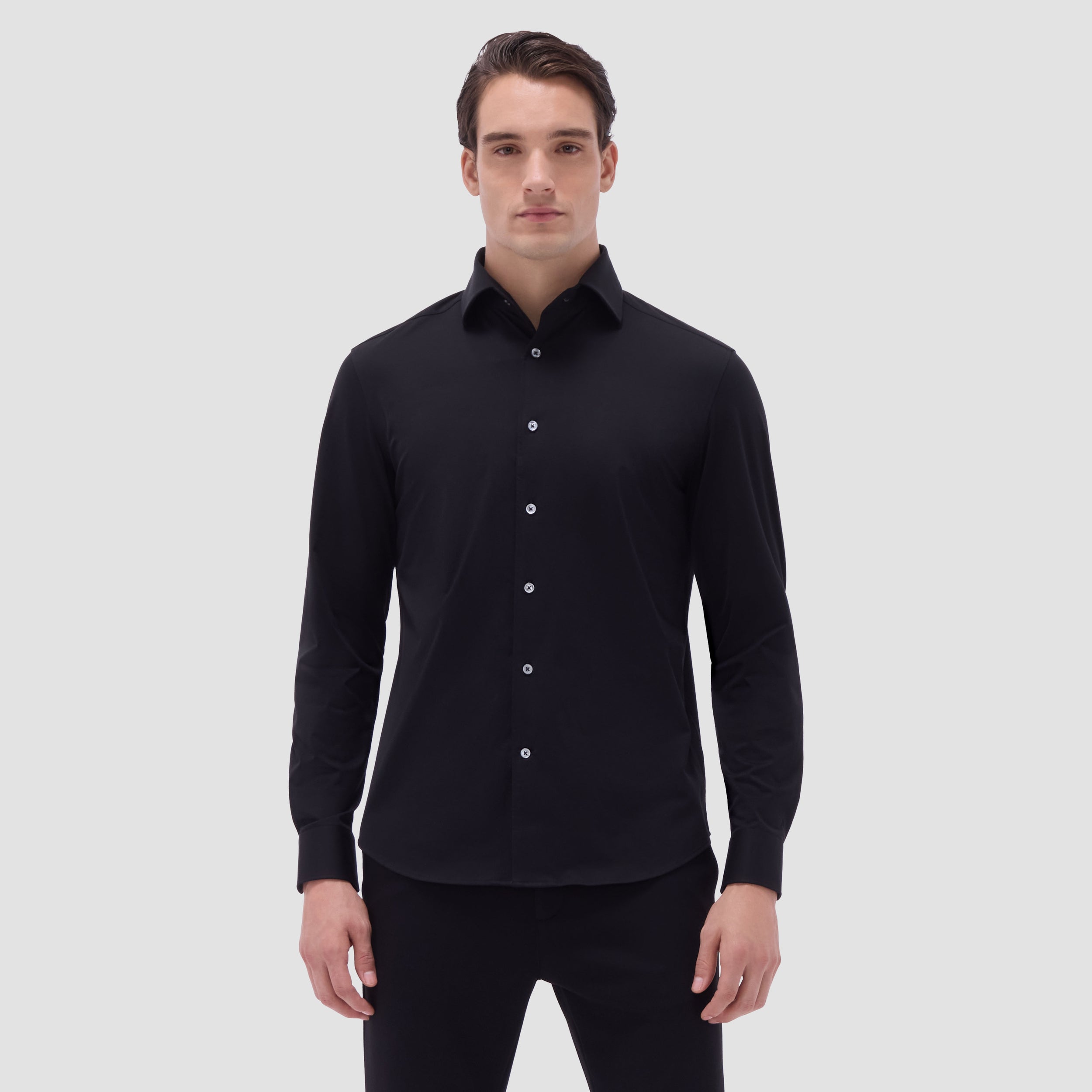 The Devon solid OoohCotton shirt features a one-piece spread collar, adjustable and convertible notched cuffs, mother-of-pearl buttons, and a curved hem perfect for wearing tucked or untucked. OoohCotton is a performance, double-mercerized, wrinkle-resistant, breathable, and easy-care cotton blend with 8-way stretch, quick-dry, and thermal comfort properties.