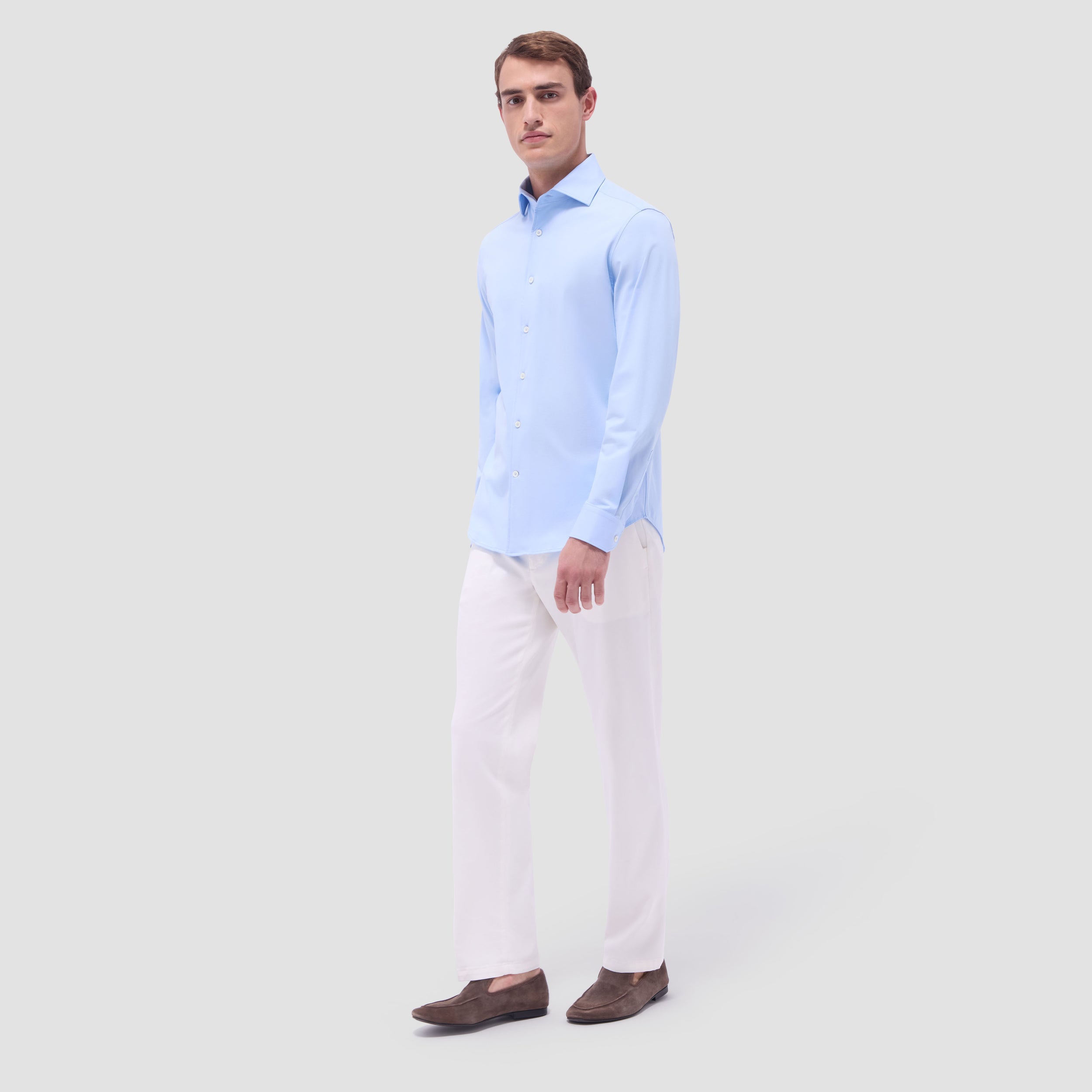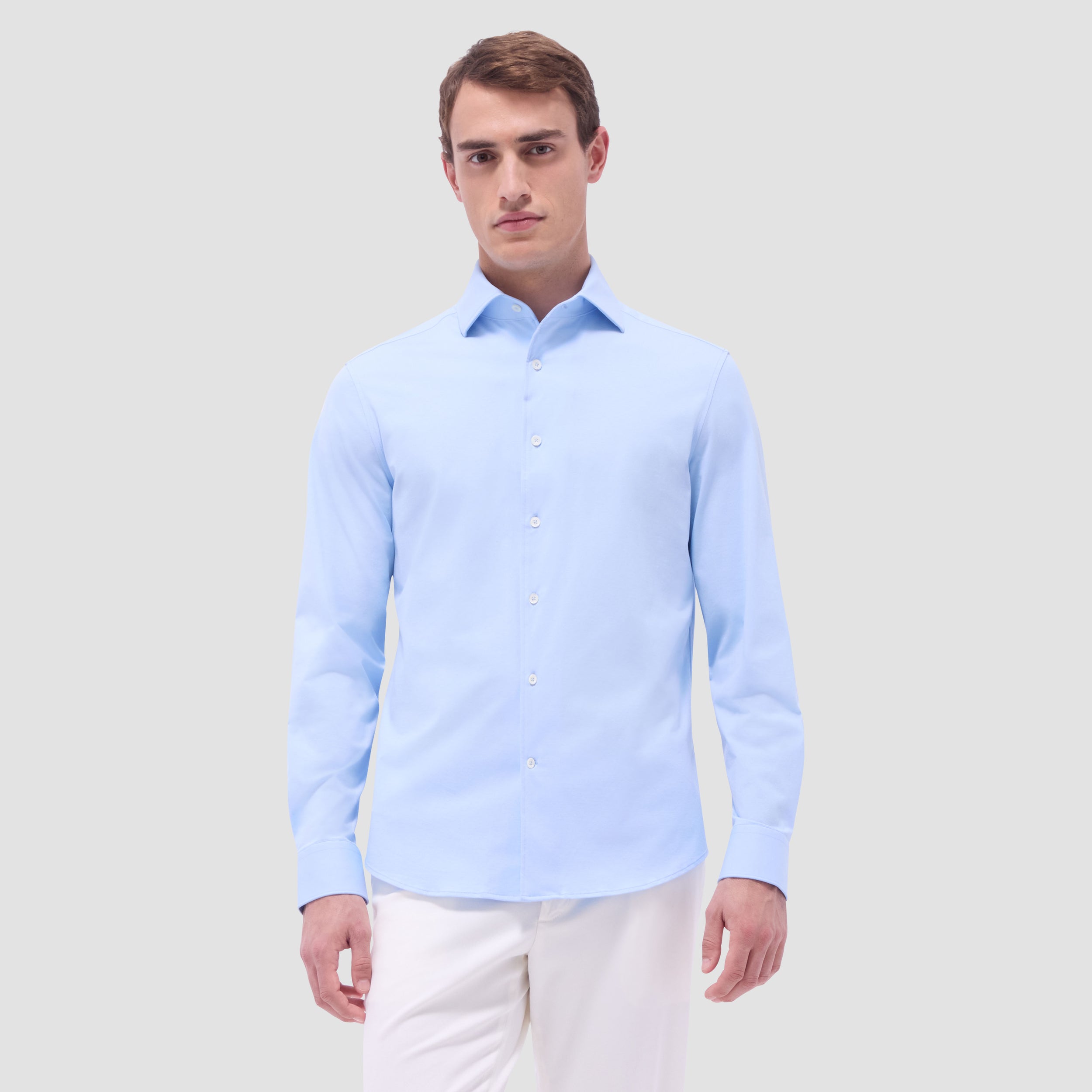 The Devon solid OoohCotton shirt features a one-piece spread collar, adjustable and convertible notched cuffs, mother-of-pearl buttons, and a curved hem perfect for wearing tucked or untucked. OoohCotton is a performance, double-mercerized, wrinkle-resistant, breathable, and easy-care cotton blend with 8-way stretch, quick-dry, and thermal comfort properties.