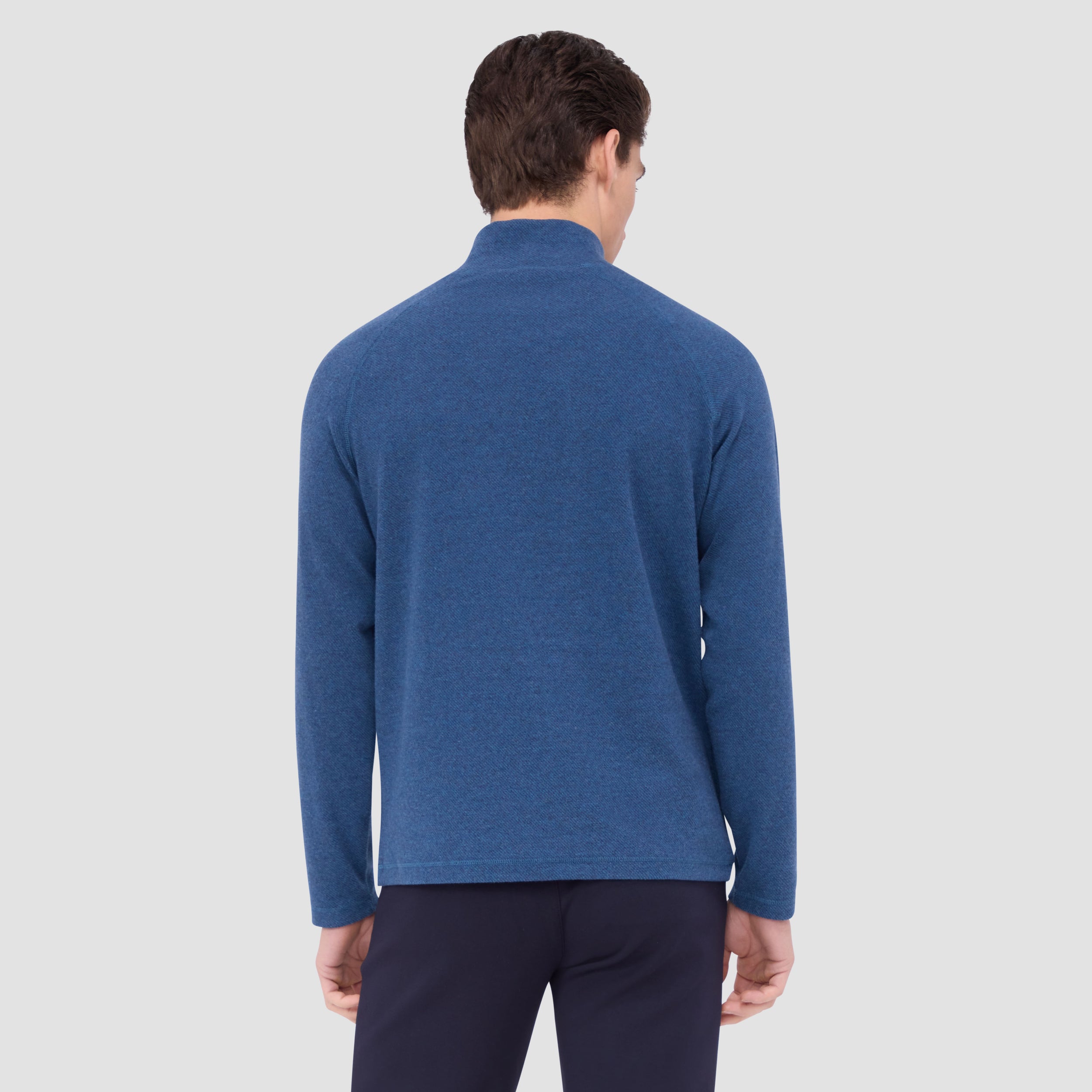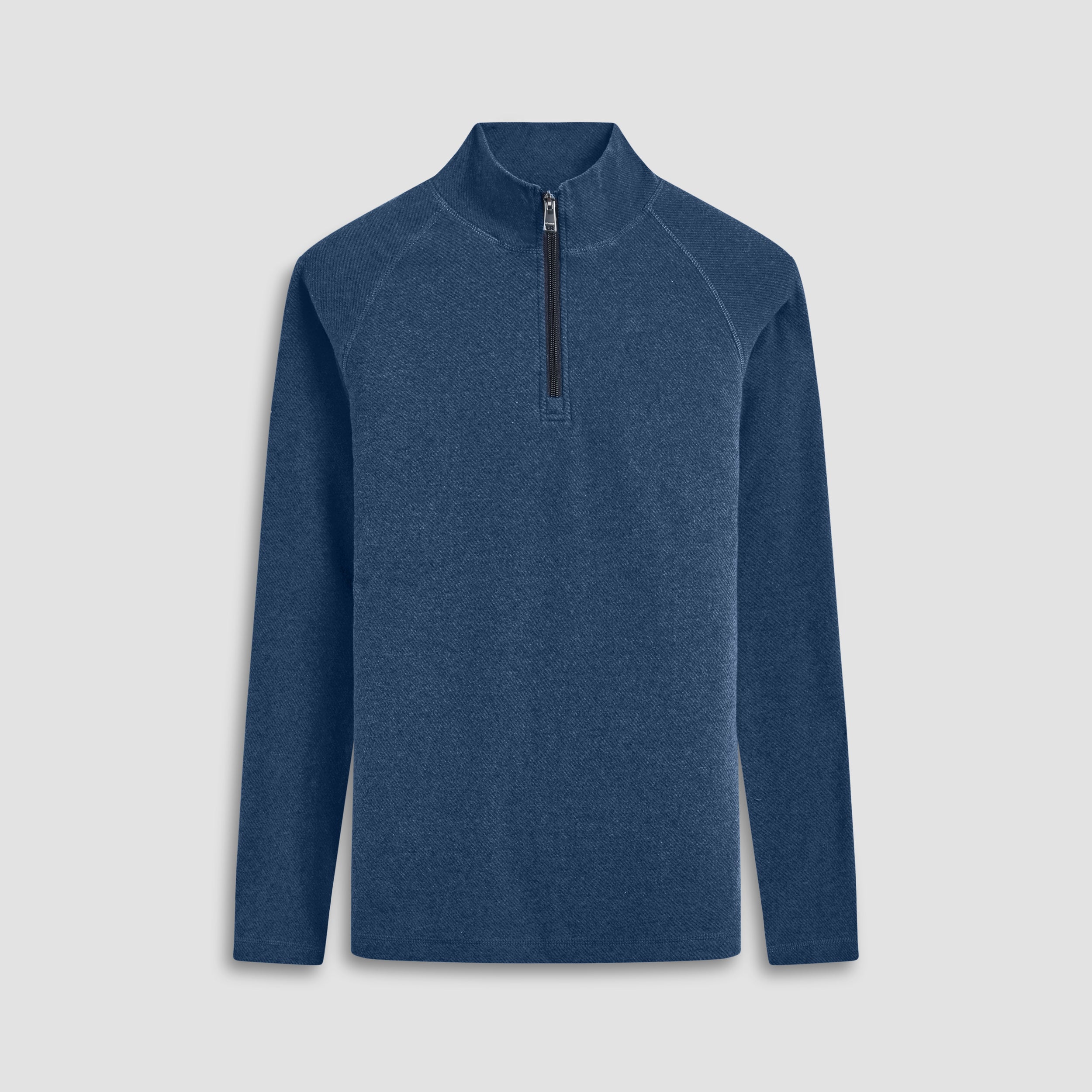 Crafted from a comfort stretch cotton blend, this elegant quarter-zip mock neck pullover is a timeless must-have piece. It features a subtle and classic diagonal pinstripe pattern, raglan sleeves, and overlock stitching detail. Ideal for layering or wearing on its own.