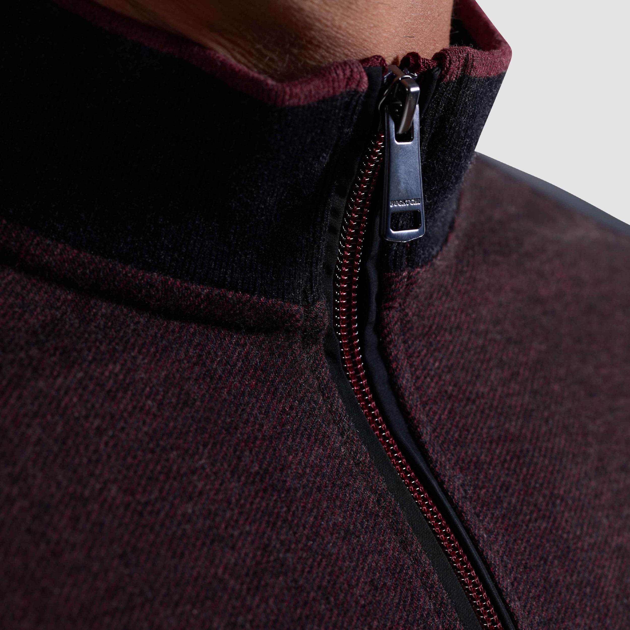Crafted from an ultra-soft, resilient blend that combines natural and synthetic fibers with stretch in a micro diagonal stripe melange, this quarter zip offers exceptional comfort, flexibility, and warmth. The mock collar, cuffs, and hem are finished with elasticized melange rib featuring a subtle contrast tipping detail. The shoulders and zipper placket are accented with sleek nylon trim for a modern, structured look.