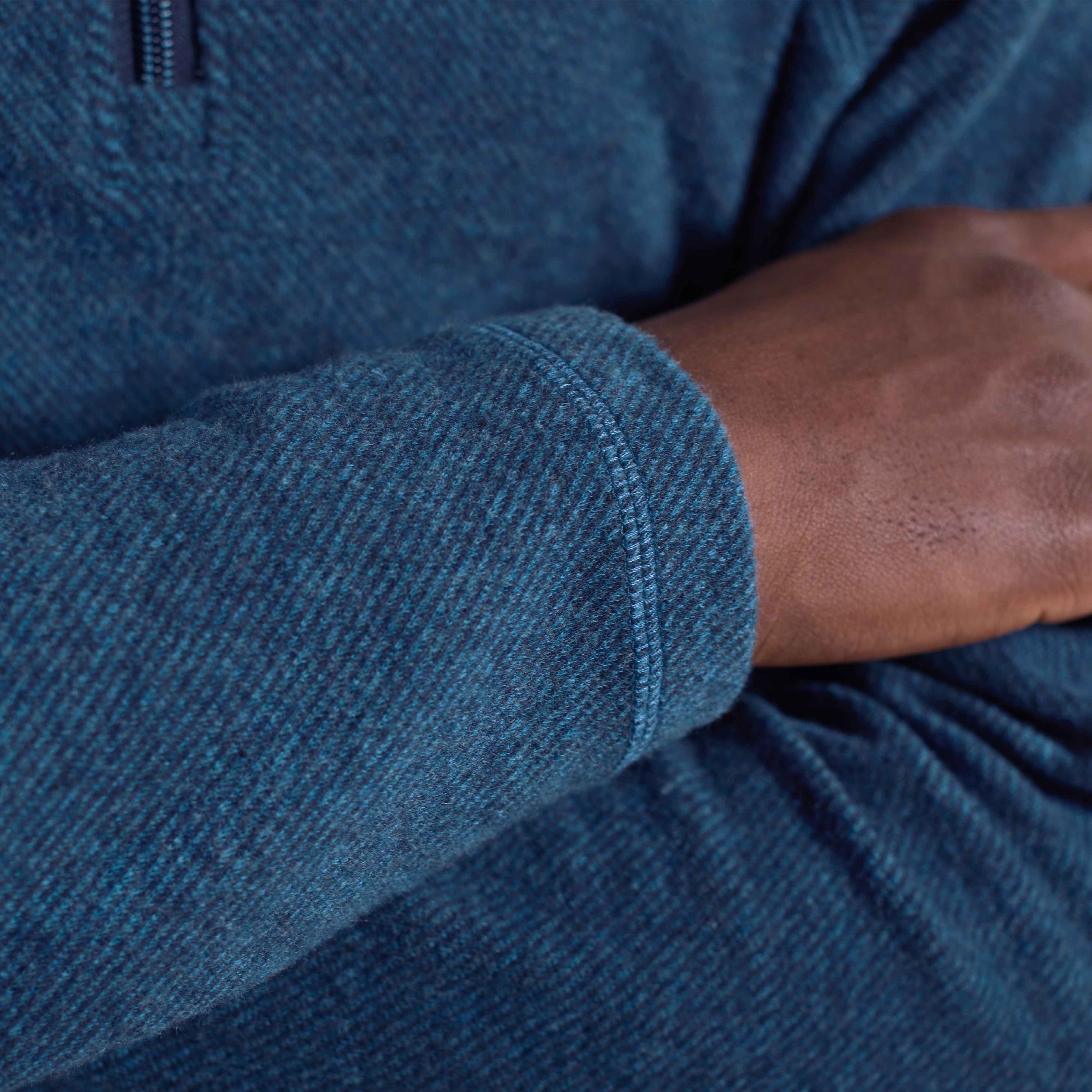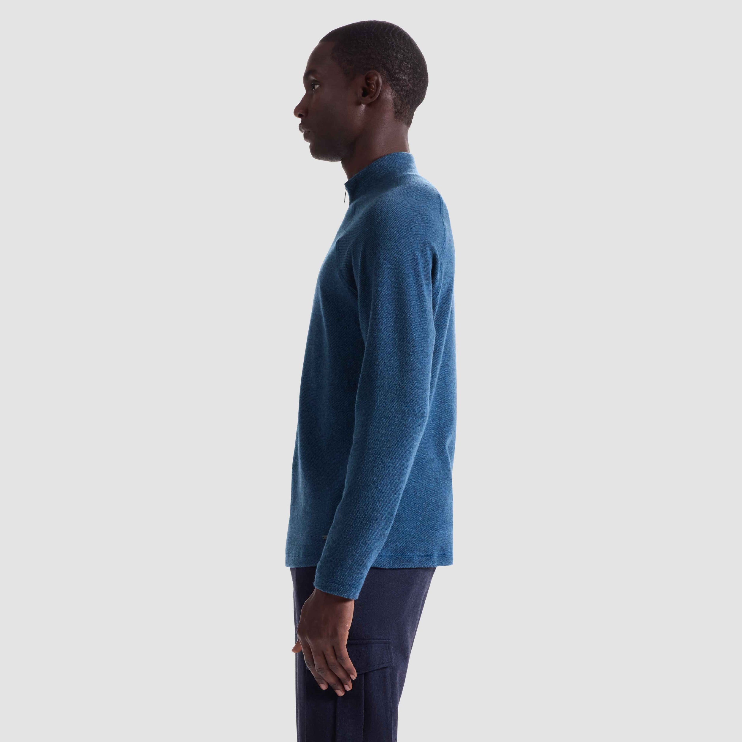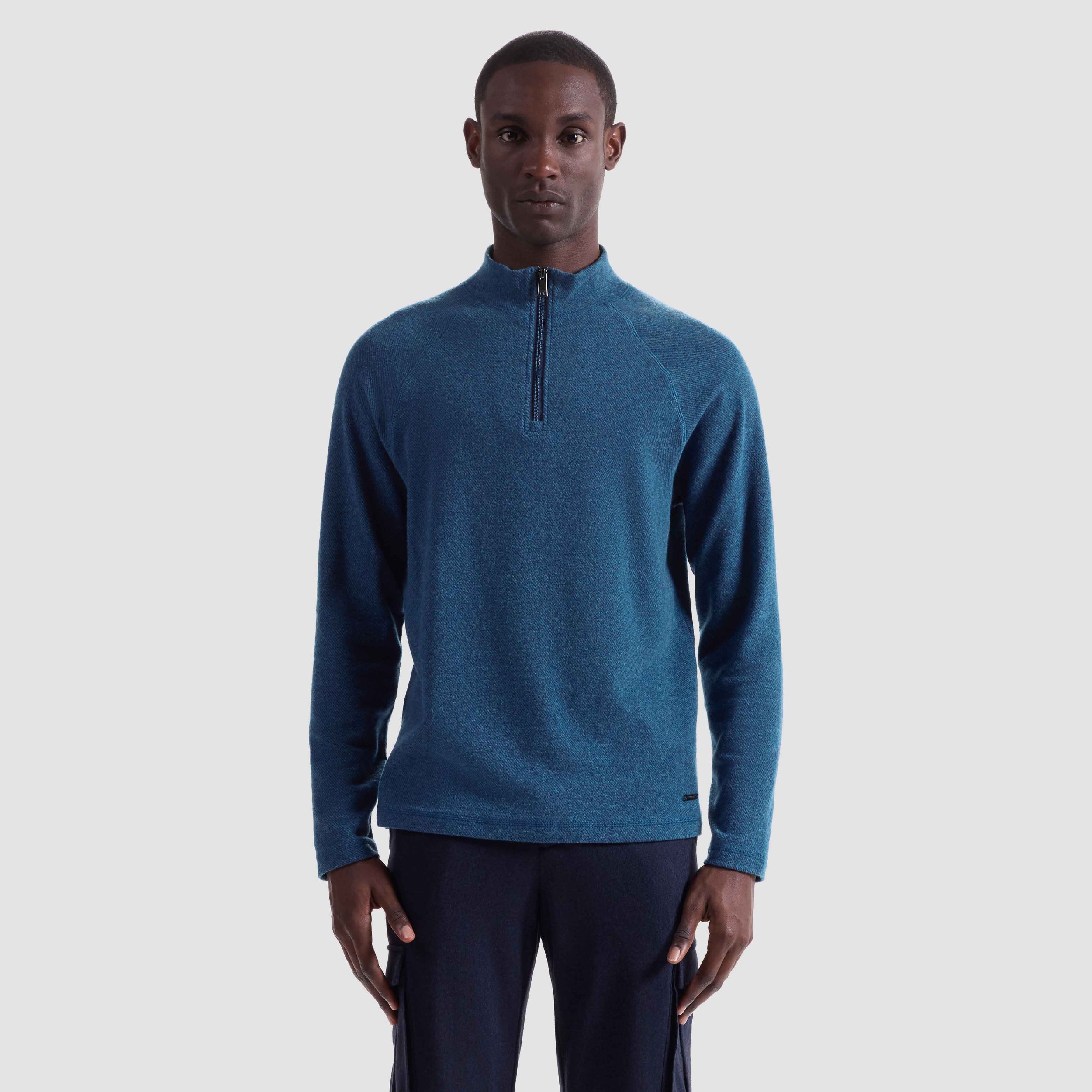 Crafted from ultra-soft Comfort Stretch fabric, this quarter zip features raglan sleeves and a distinct diagonal pattern for a refined, textured look. Tonal overlock stitching enhances the design throughout, adding subtle structure and visual interest. Finished with a mock neck, straight hem, and straight cuffs for a clean, contemporary silhouette.