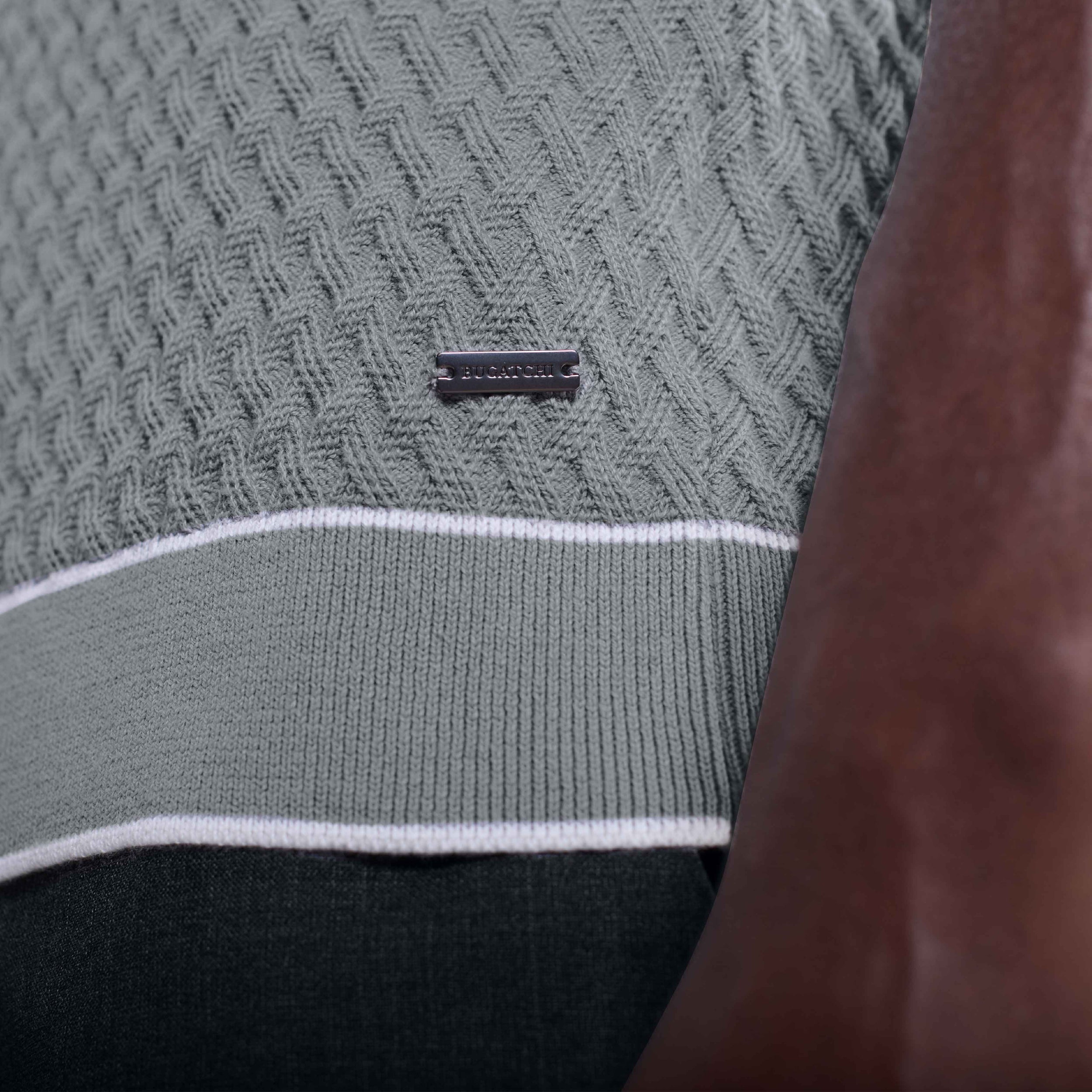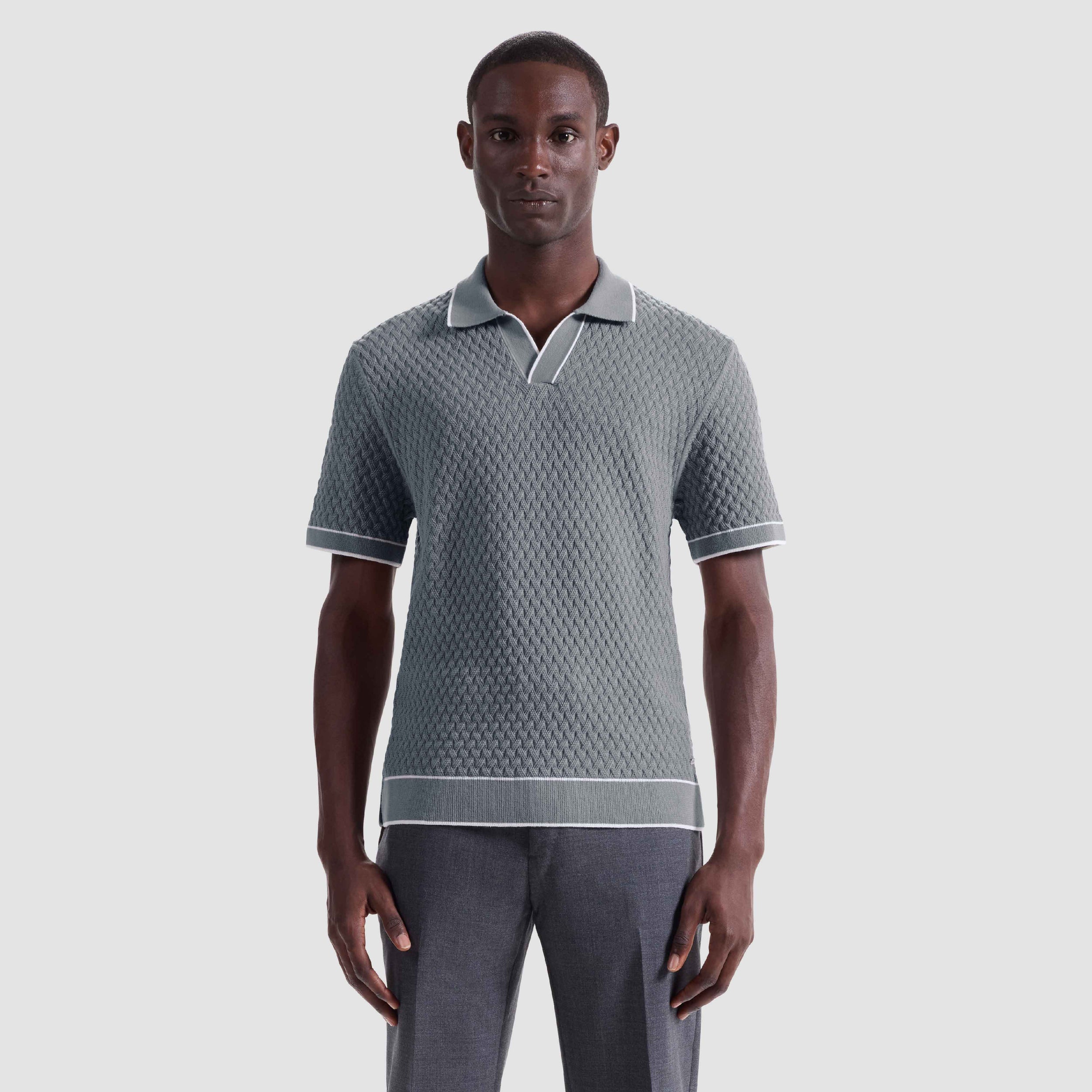 Crafted from a refined cotton blend, this short sleeve polo features a diamond cable stitch pattern that adds sophisticated texture and an open Johnny collar. The collar, cuffs, and hem are accented with contrast tipping for a polished finish. A versatile style for elevated weekend wear or casual outings.