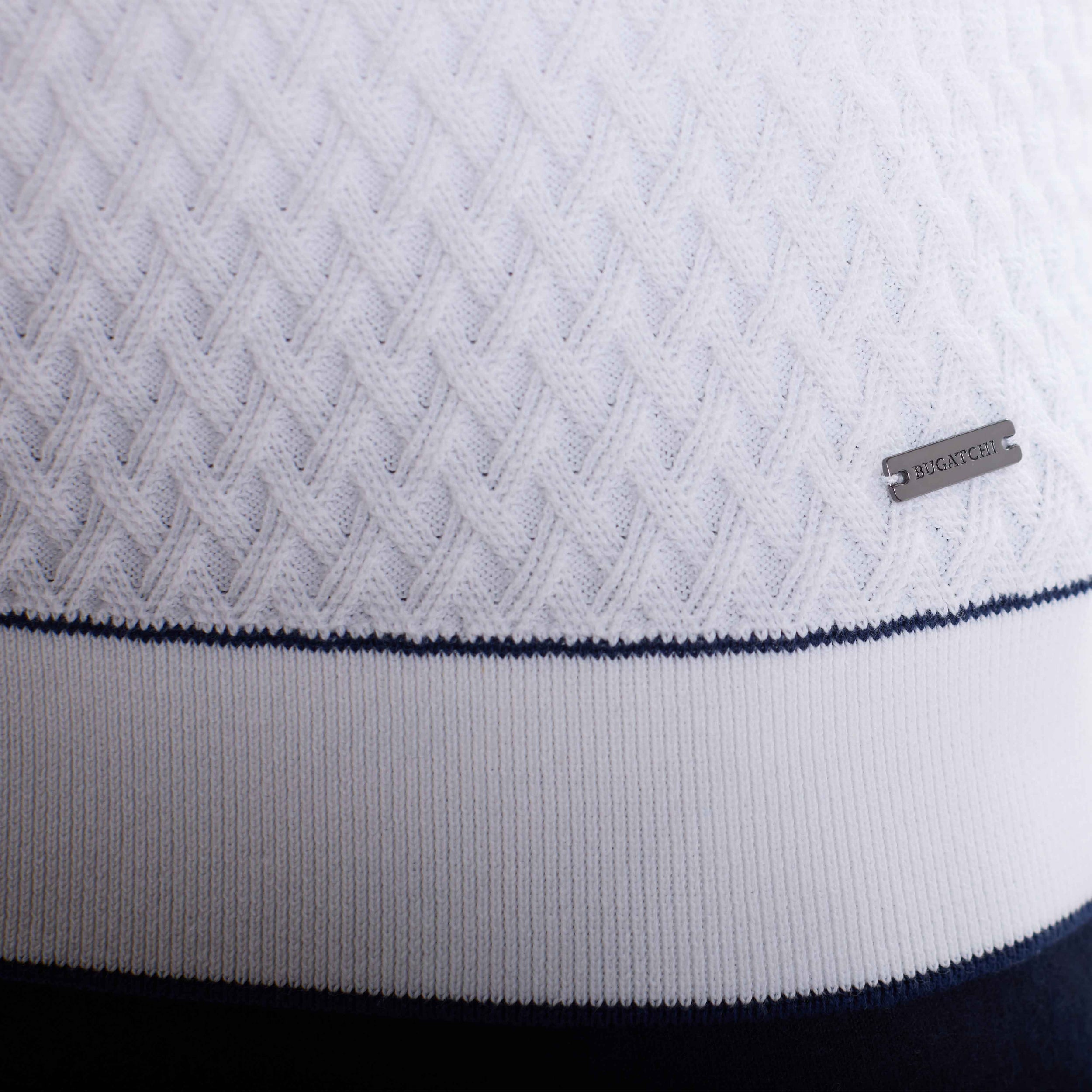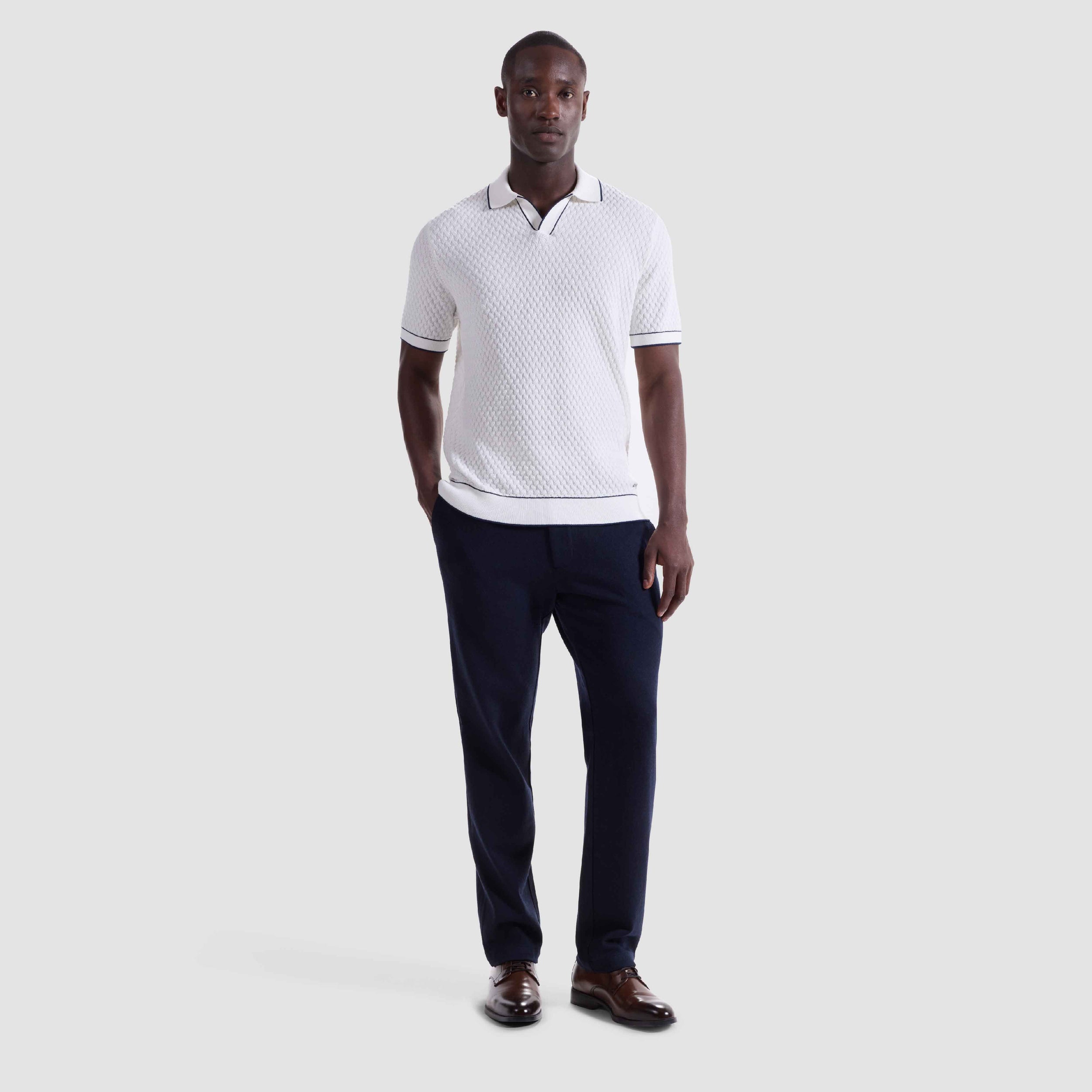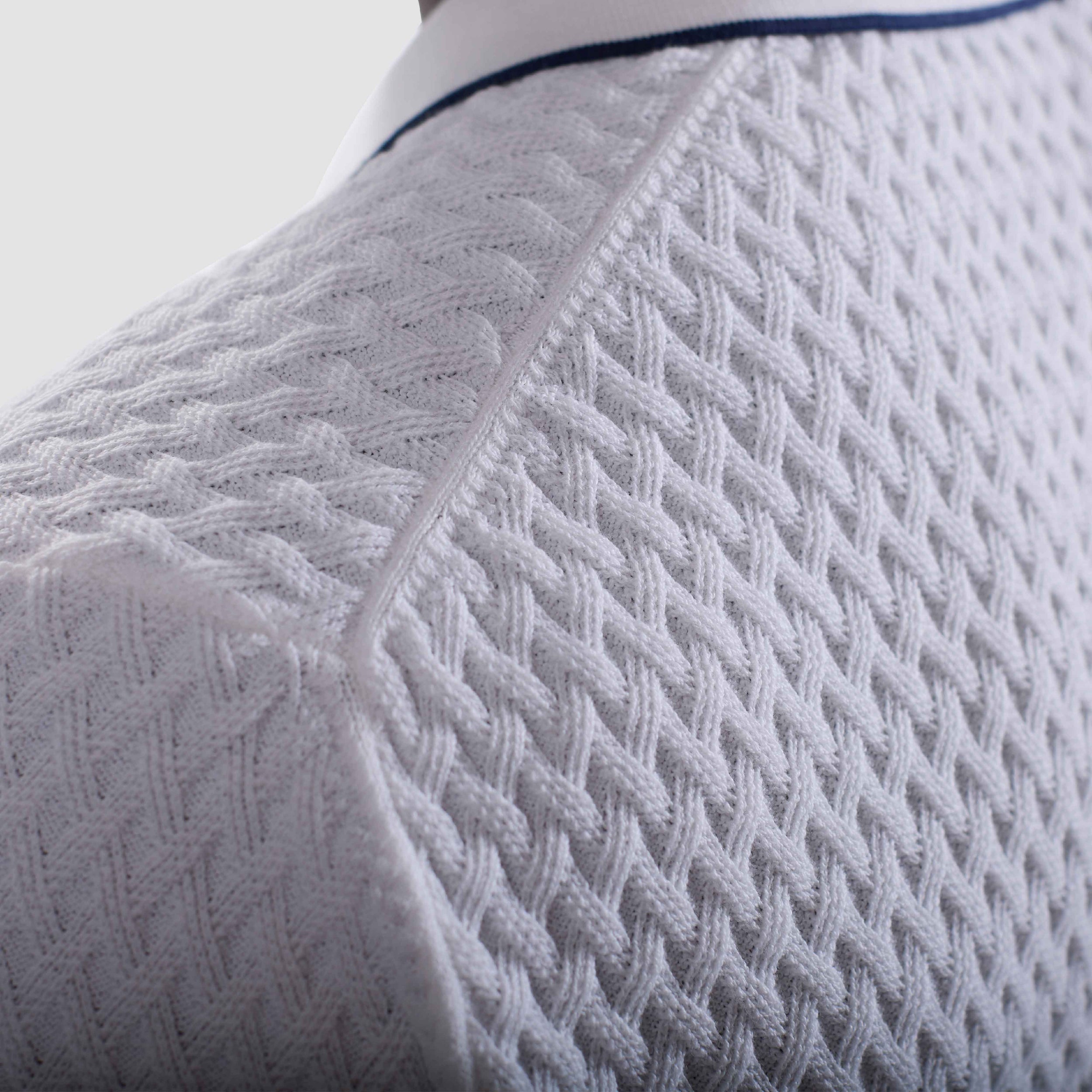 Crafted from a refined cotton blend, this short sleeve polo features a diamond cable stitch pattern that adds sophisticated texture and an open Johnny collar. The collar, cuffs, and hem are accented with contrast tipping for a polished finish. A versatile style for elevated weekend wear or casual outings.