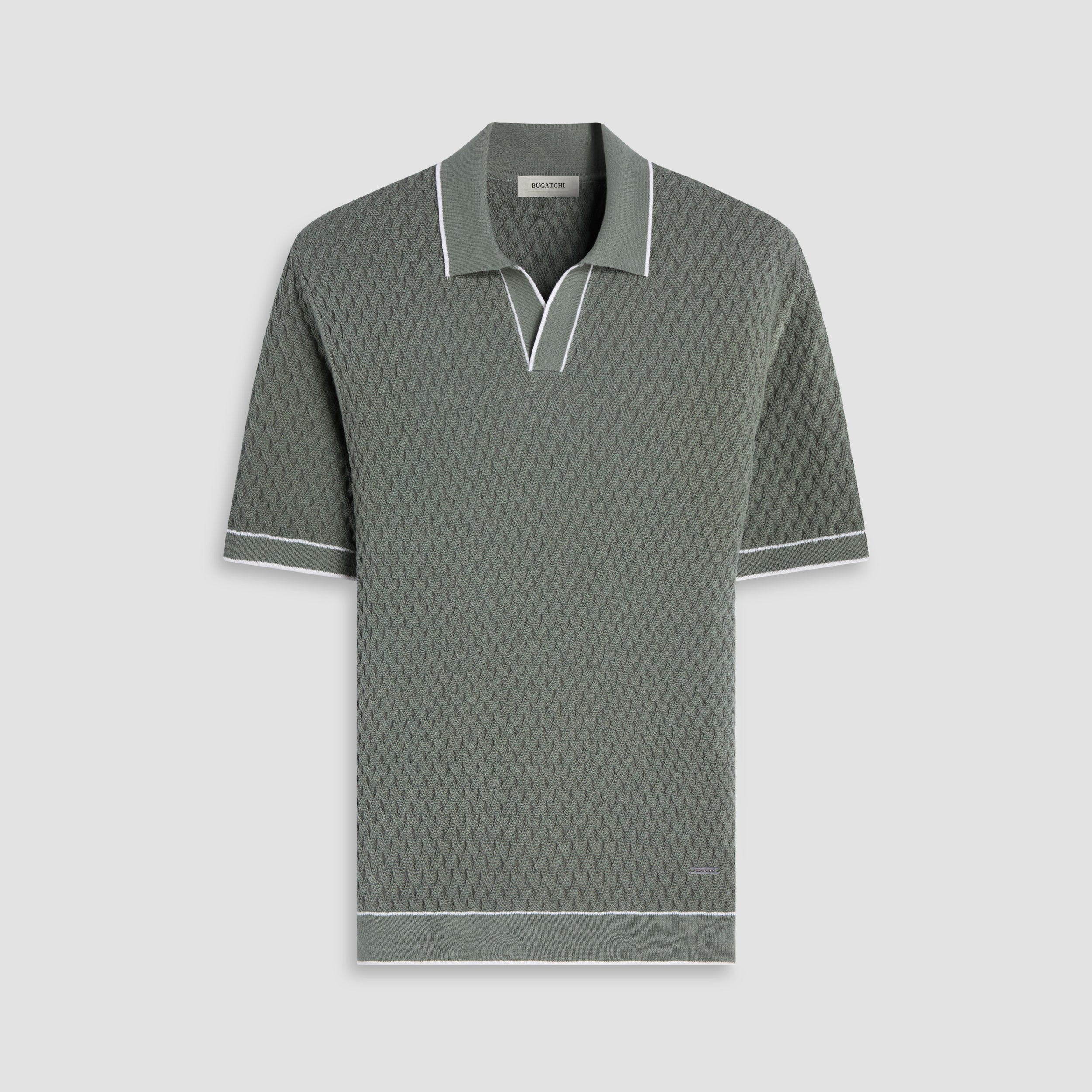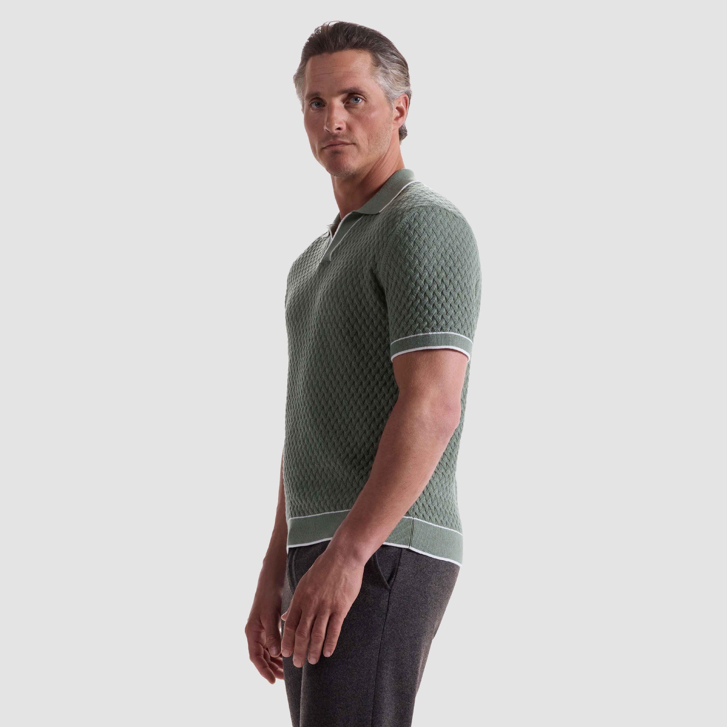 Crafted from a refined cotton blend, this short sleeve polo features a diamond cable stitch pattern that adds sophisticated texture and an open Johnny collar. The collar, cuffs, and hem are accented with contrast tipping for a polished finish. A versatile style for elevated weekend wear or casual outings.