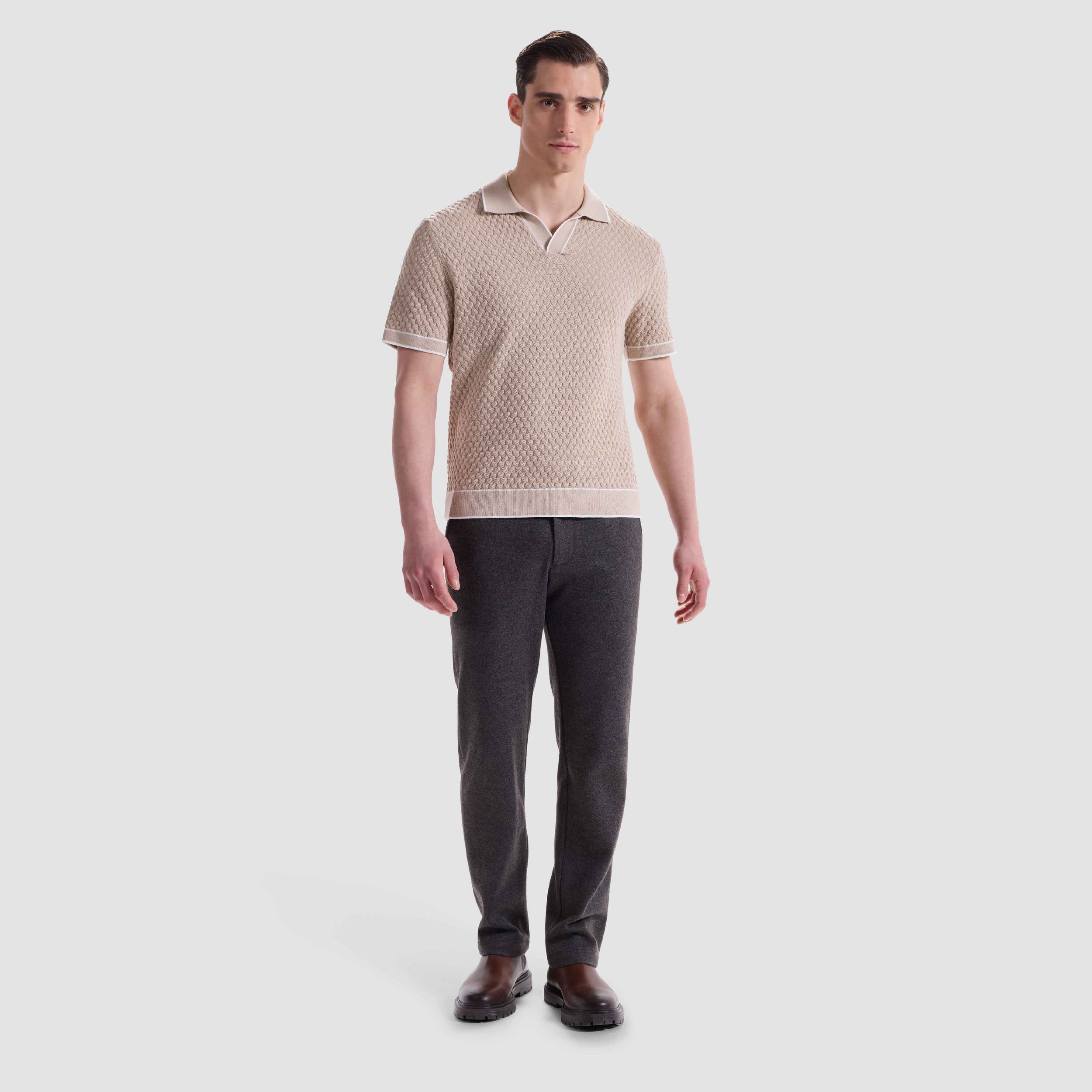 Crafted from a refined cotton blend, this short sleeve polo features a diamond cable stitch pattern that adds sophisticated texture and an open Johnny collar. The collar, cuffs, and hem are accented with contrast tipping for a polished finish. A versatile style for elevated weekend wear or casual outings.