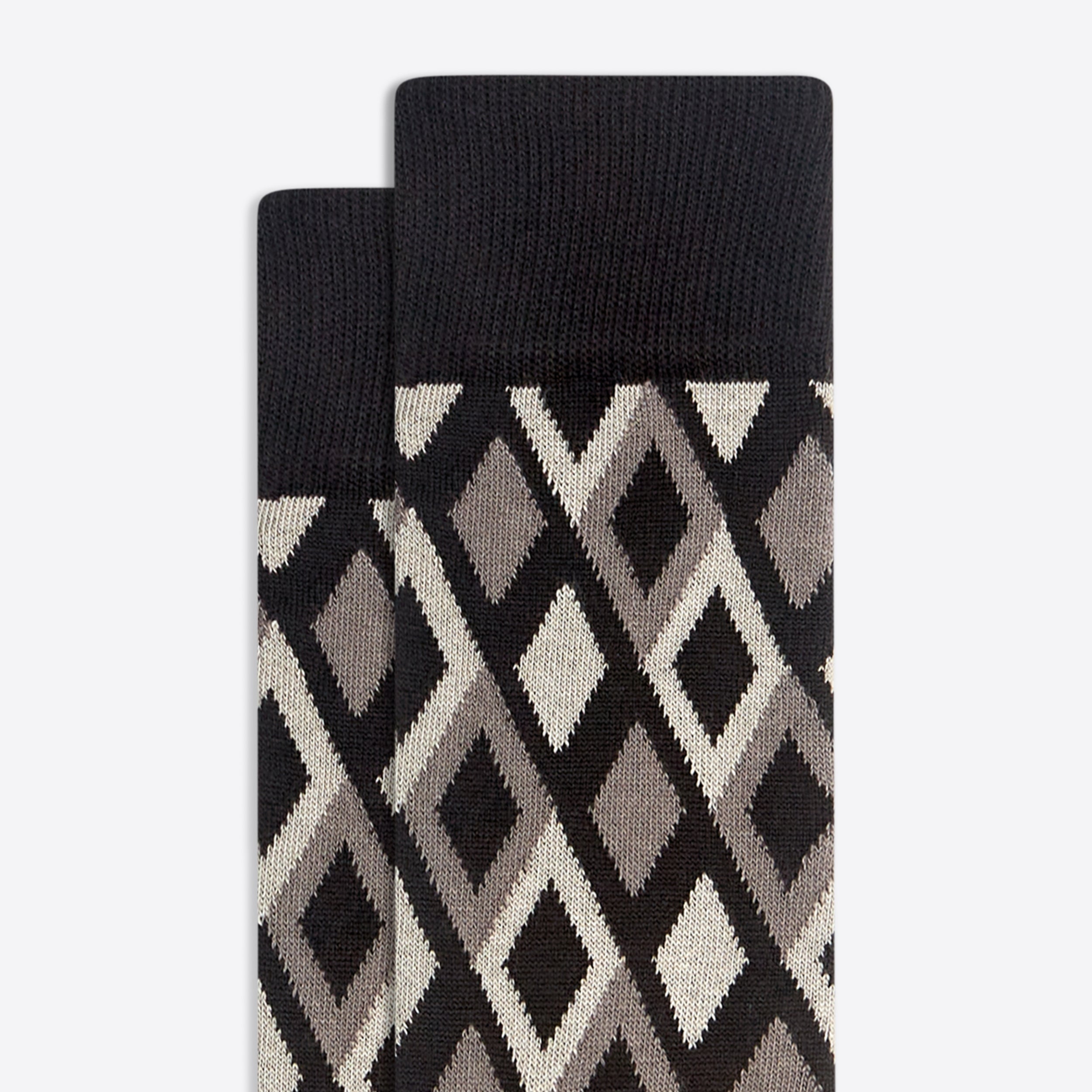 Diamond check mid-calf socks in fine cotton and cashmere blend with rib knit cuff band, hand linked toe and reinforced heel seams. Made in Italy.