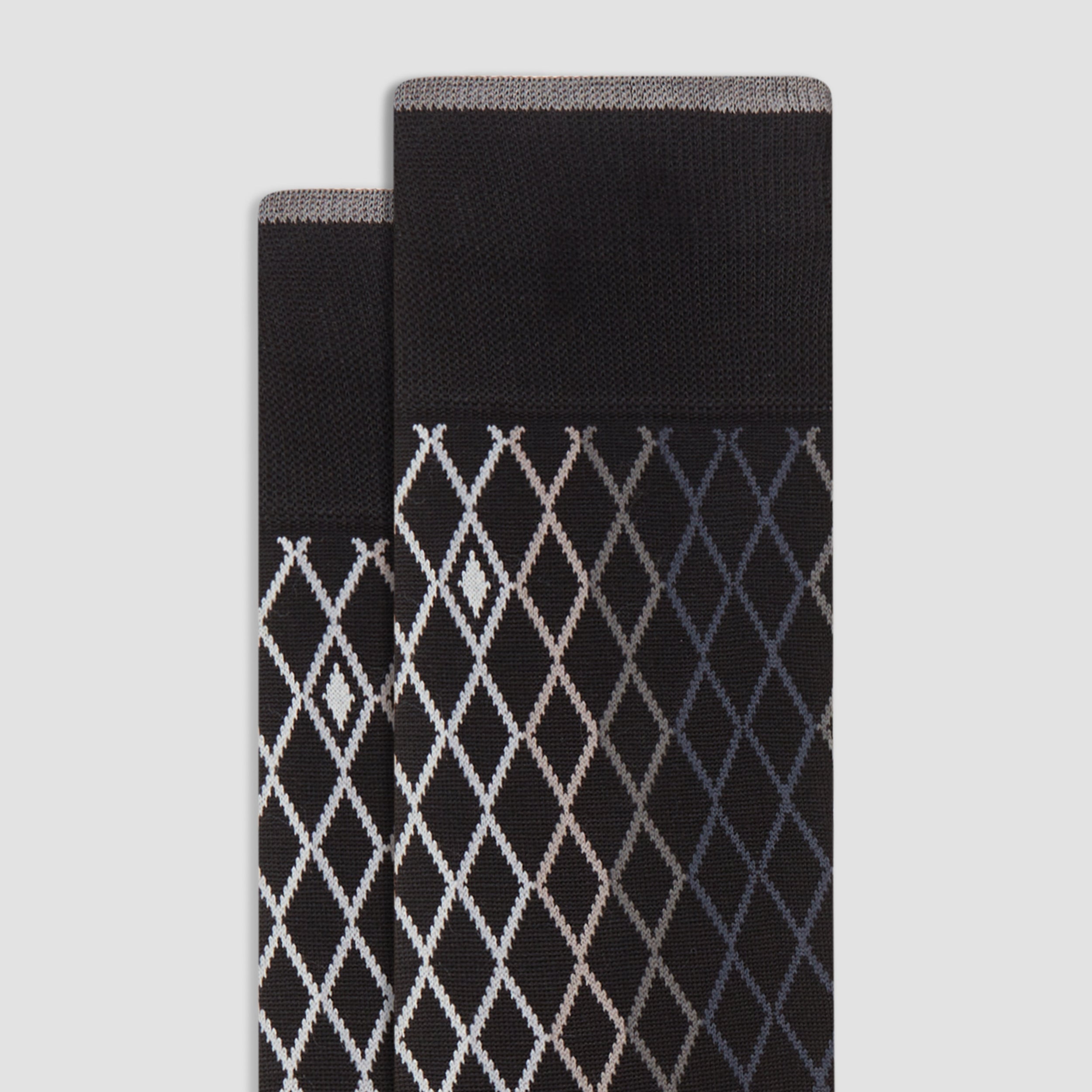 Diamond check mid-calf socks in fine gauge mercerized cotton blend with rib knit cuff band, hand linked toe and reinforced heel seams. Made in Italy.