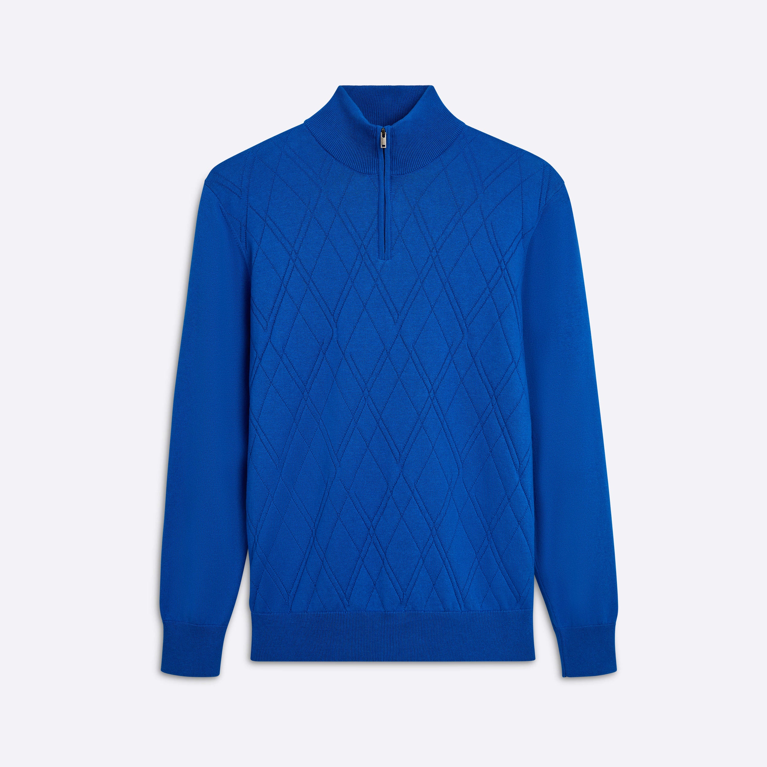 Diamond Check long sleeve quarter zip mock neck sweater in 100% cotton with solid sleeves and back and rib knit collar, cuffs and waistband. Made in Italy. Made in Italy.