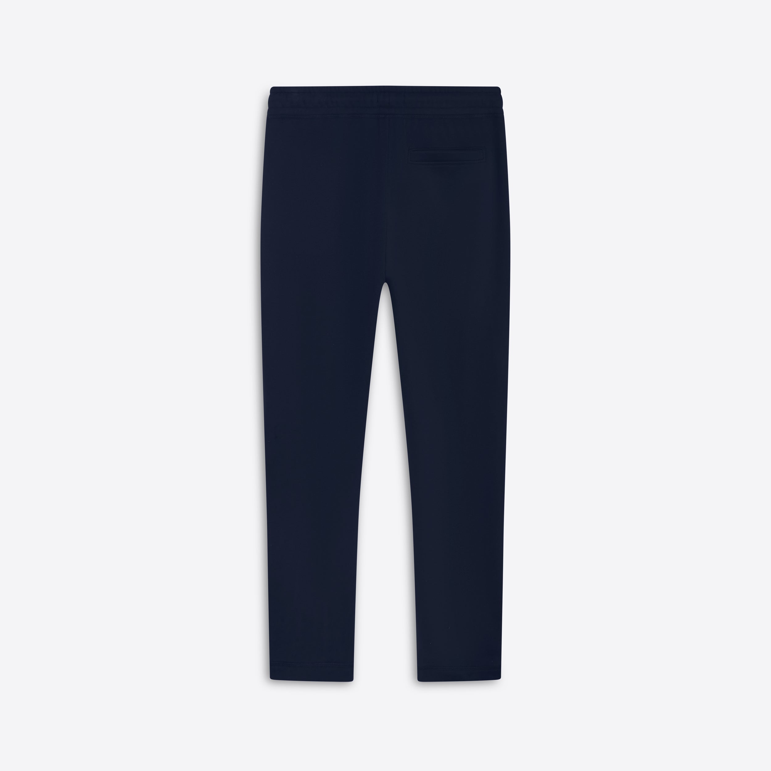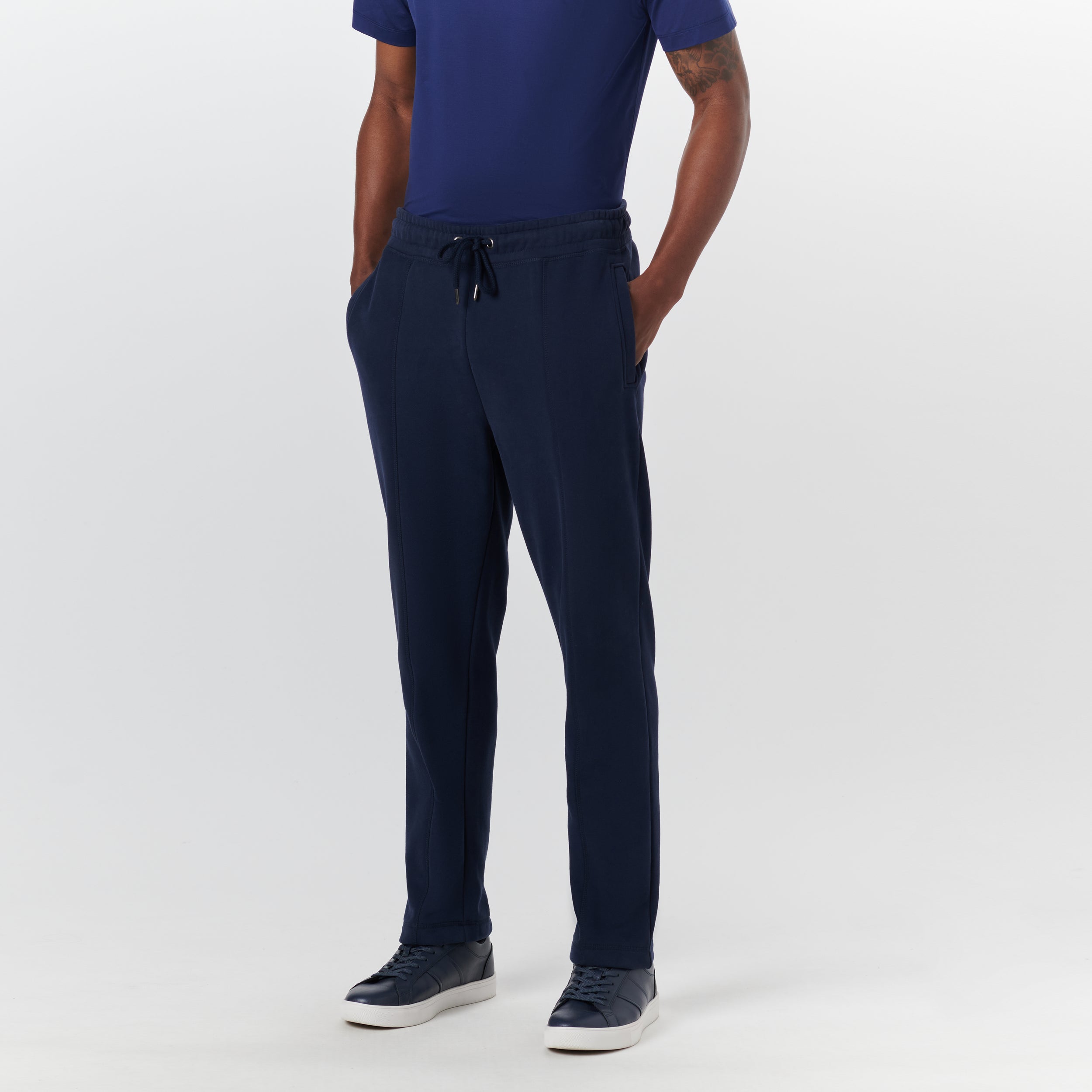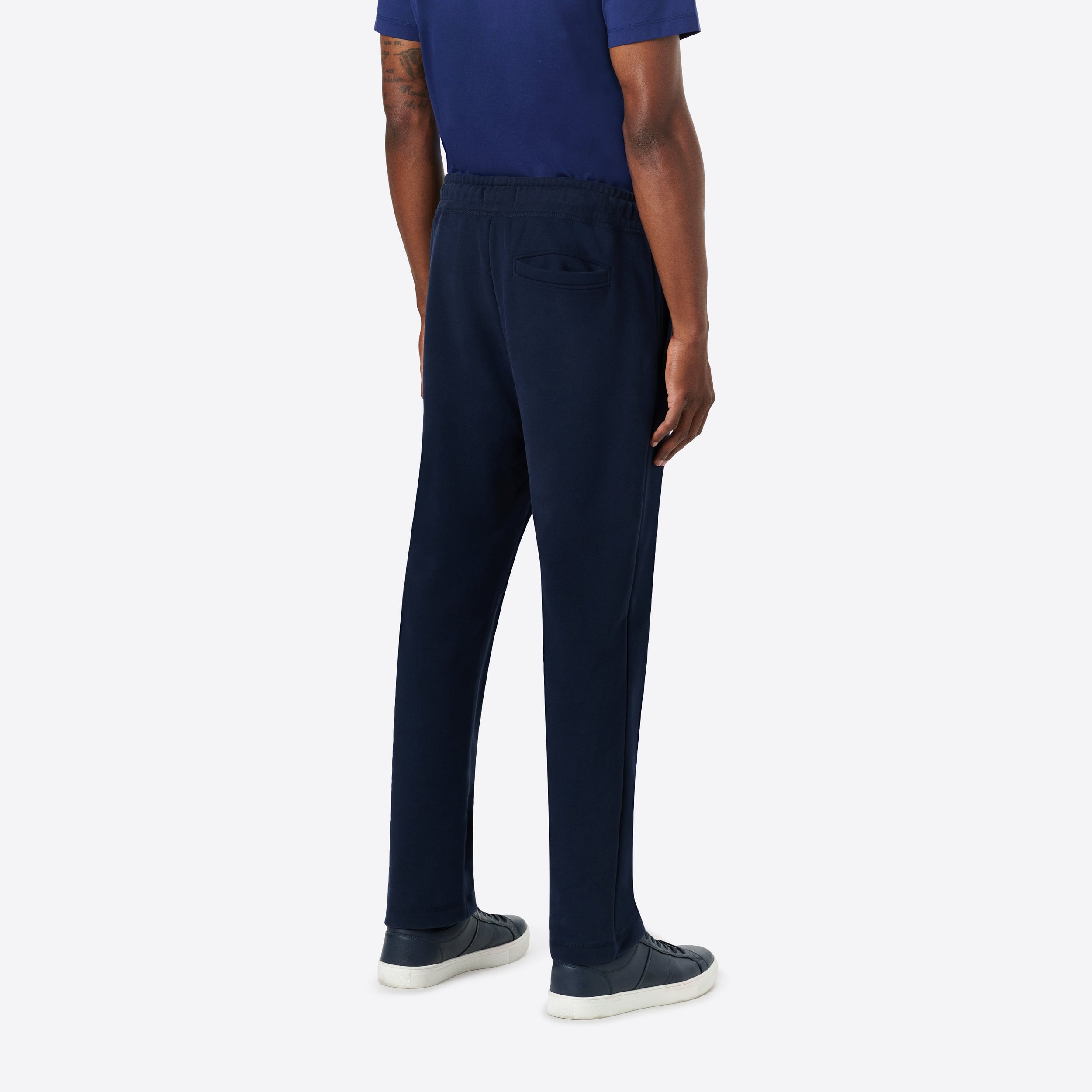 Jogger style lounging pants in 100% organic cotton with open cuffs, elasticized waistband, drawstring, and front and pockets. Made in Portugal.