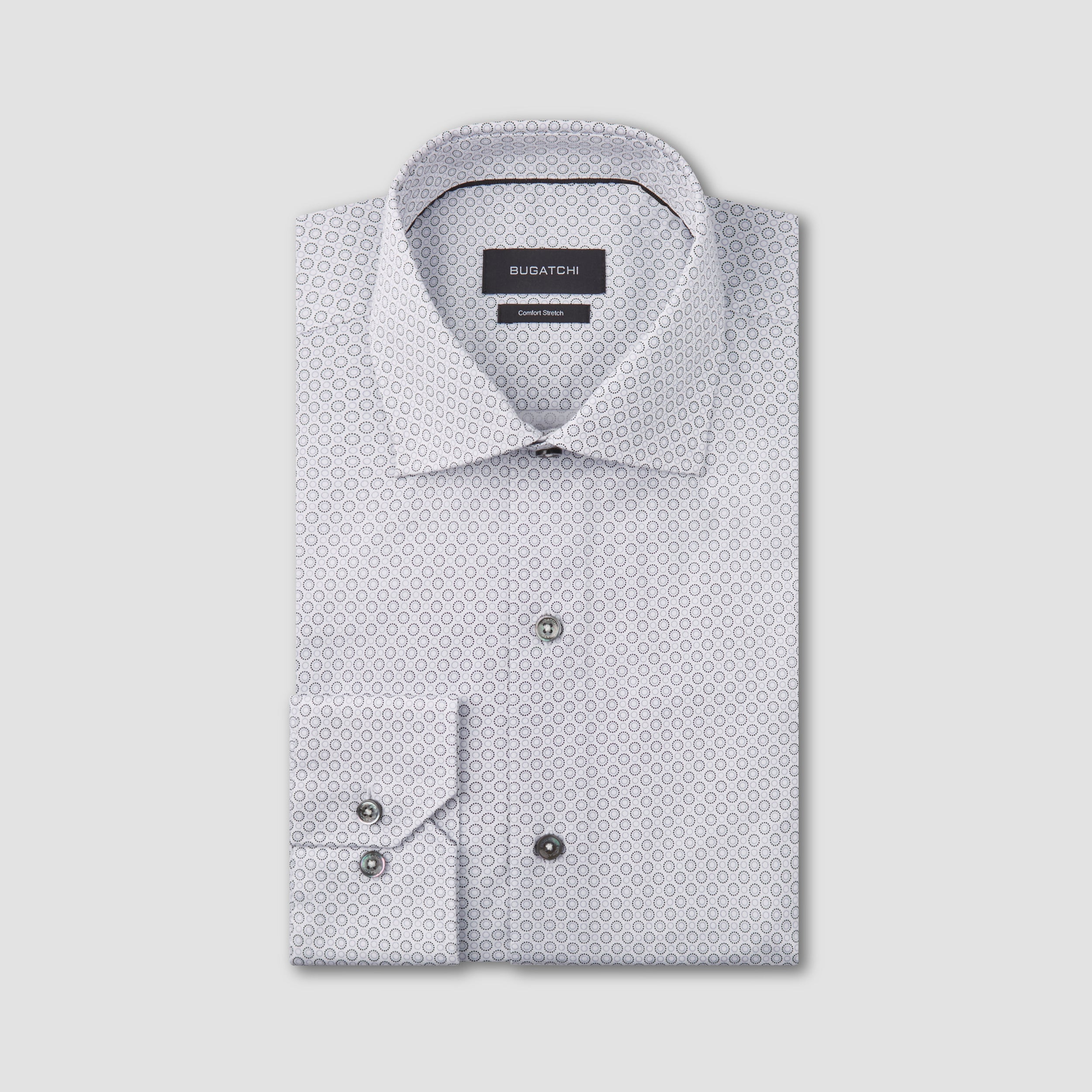 Ethan geometric print long-sleeved dress shirt in comfort stretch cotton with spread collar, French placket, adjustable notched cuffs, genuine shell buttons and a curved hemline.