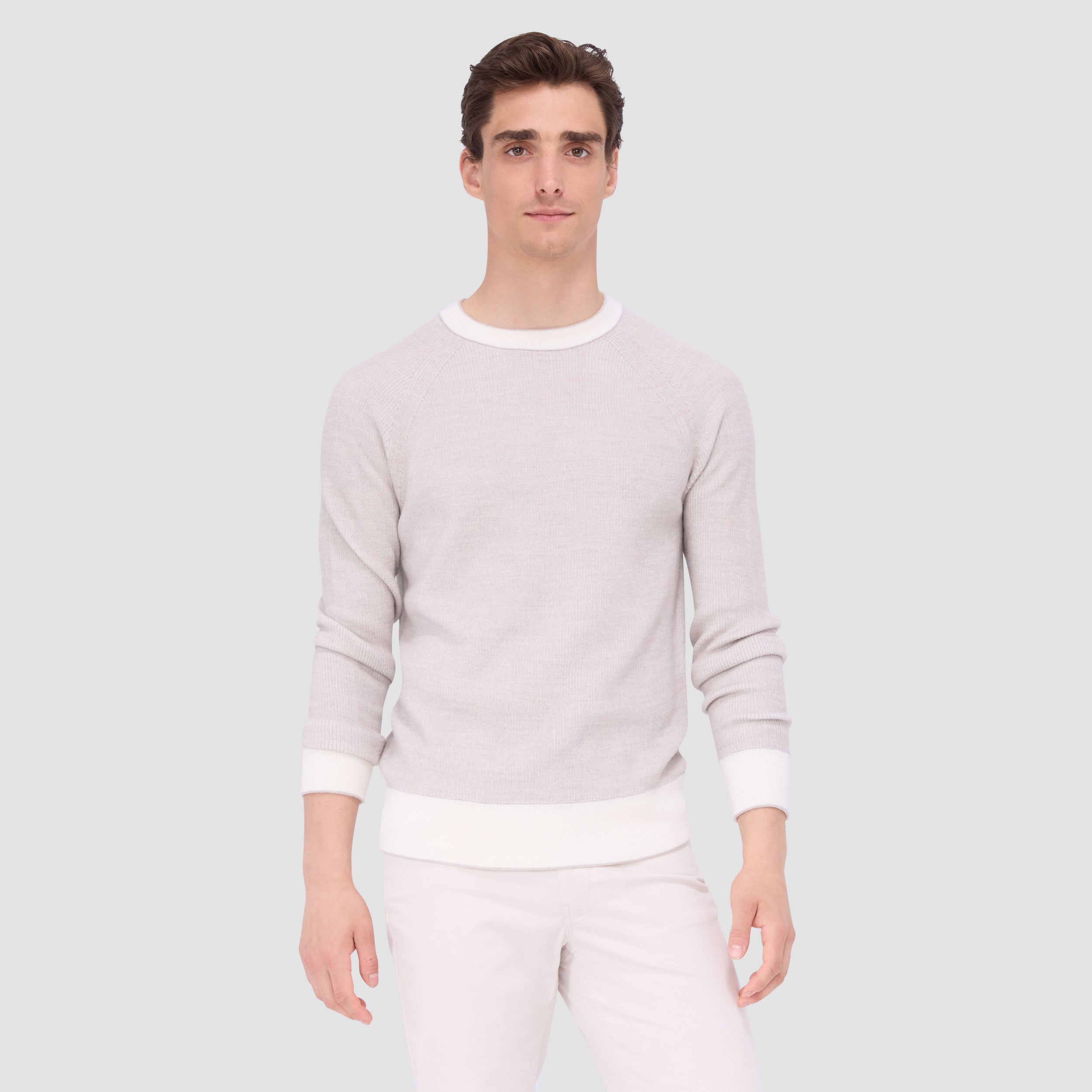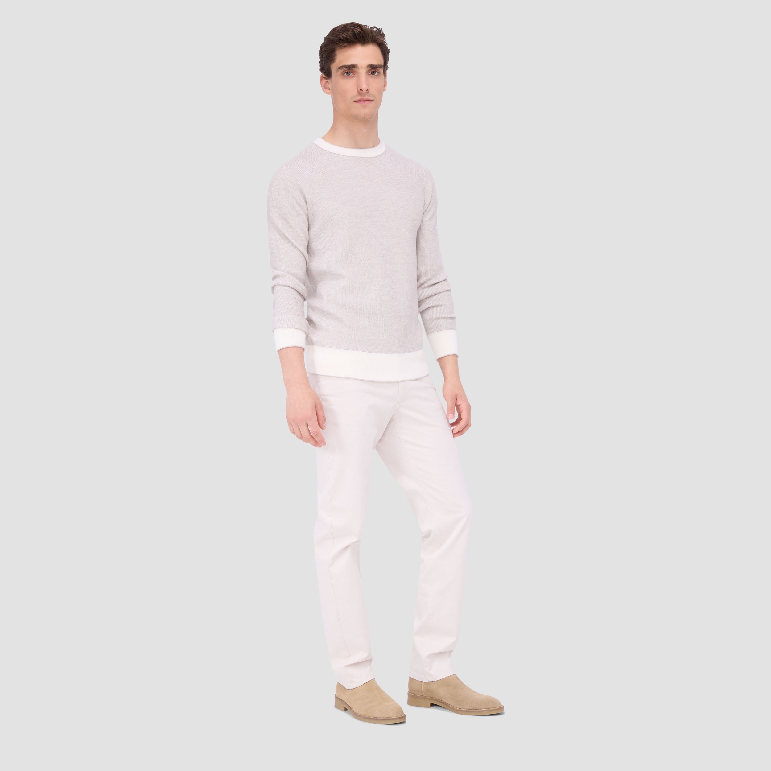 Indulge in luxury, unparalleled softness and warmth with our premium crew neck sweater in extra fine Merino wool and silk. The fisherman rib jacquard stitch adds depth and texture while contrasting neckline, cuffs, and hem with subtle double tipping detail give a refined modern twist to this classic silhouette. Versatile and timeless, perfect for any occasion, dressed up or casual.