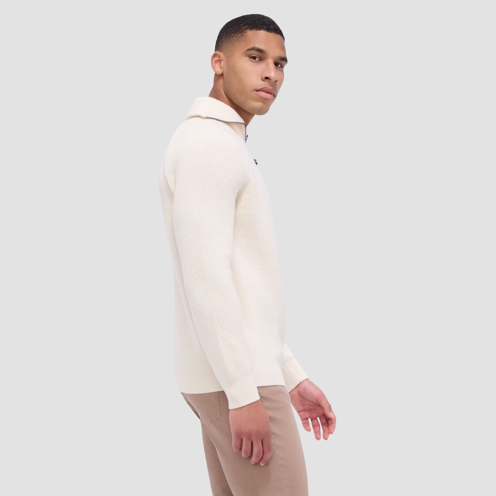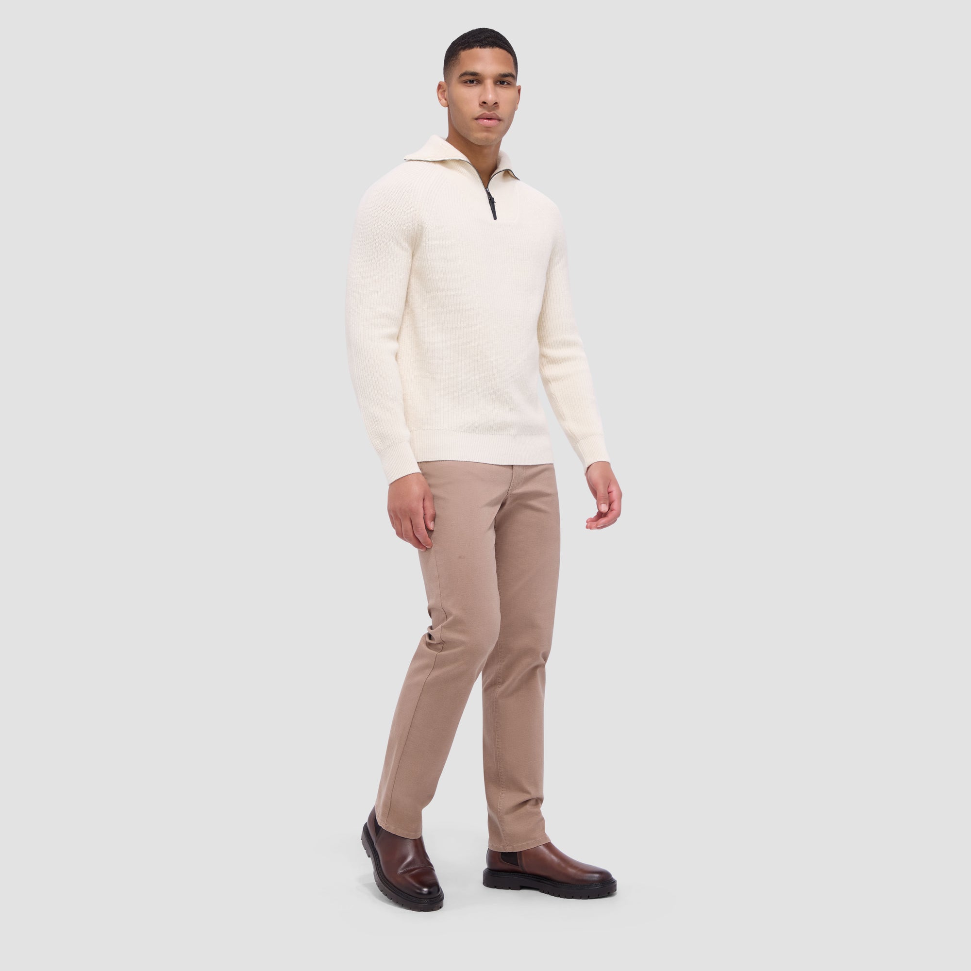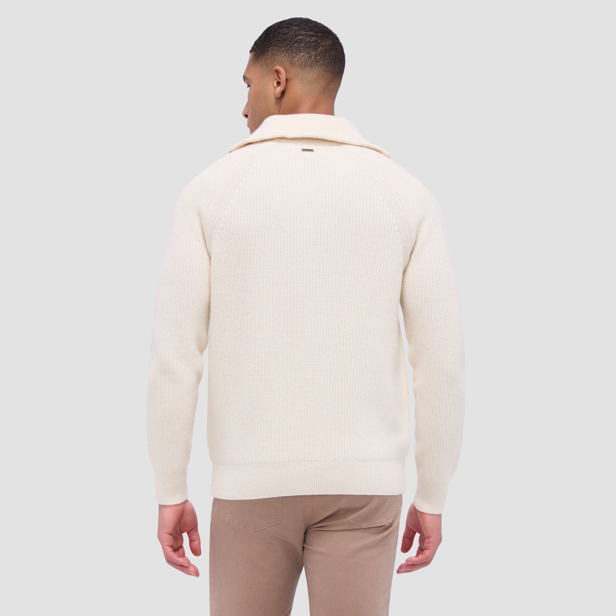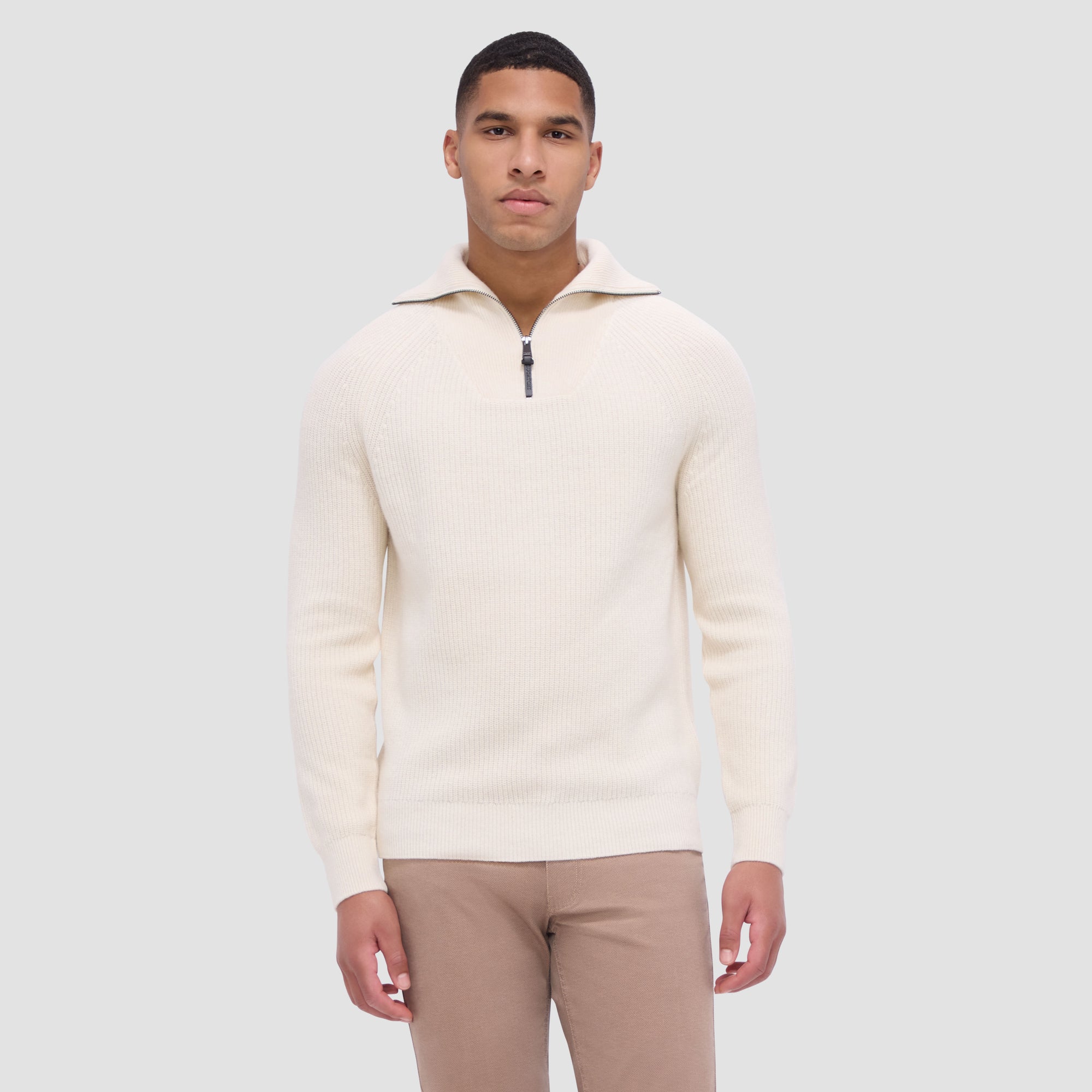 Experience the luxury of our Fisherman rib-stitch quarter-zip sweater, blending wool and cotton for natural warmth and softness. Its distinctive rib stitch adds texture, while the convertible mock collar offers versatility. Rib-knit collar, cuffs and hem ensure comfort and ease of movement making it ideal for layering or wearing solo.
