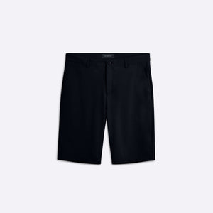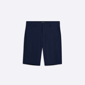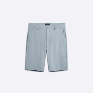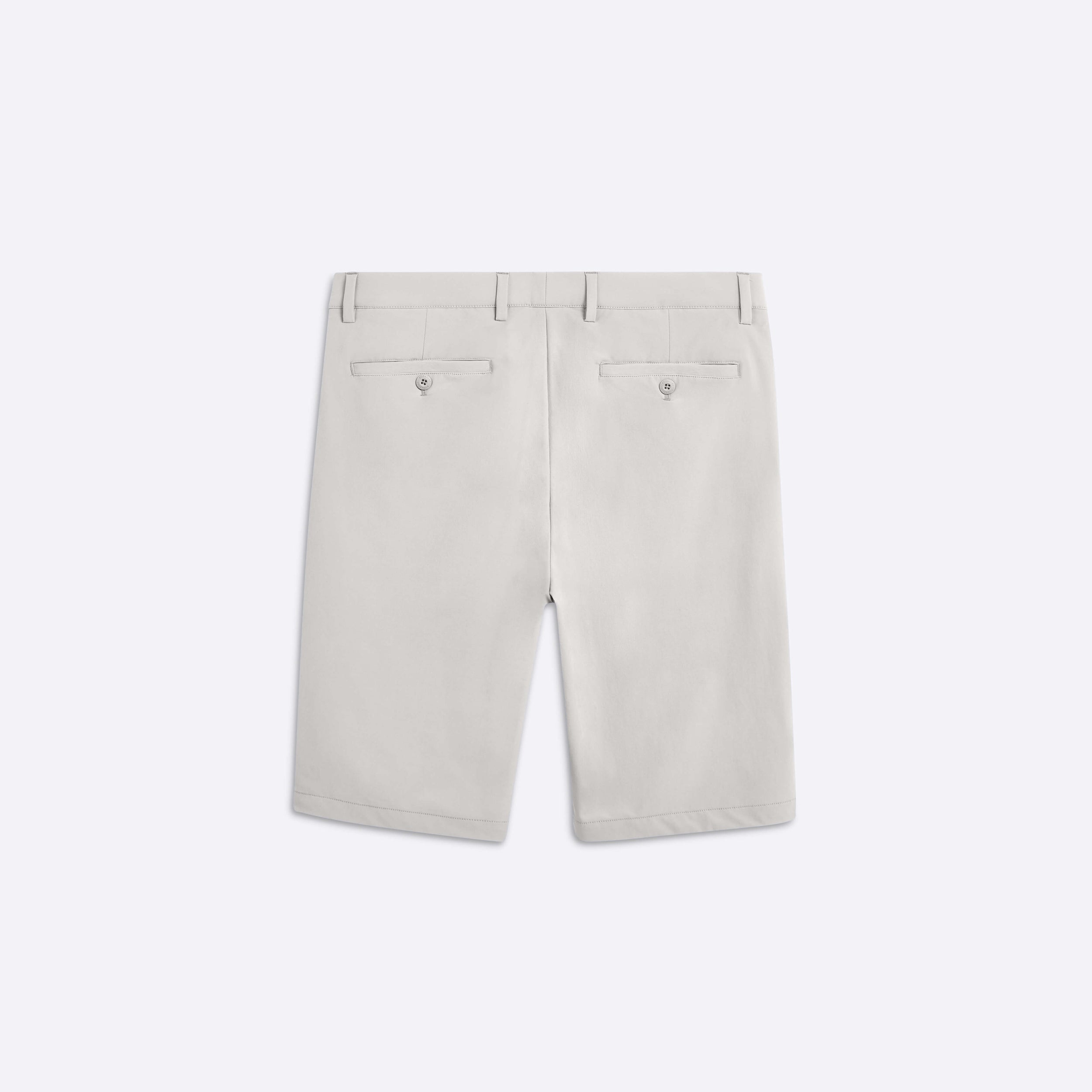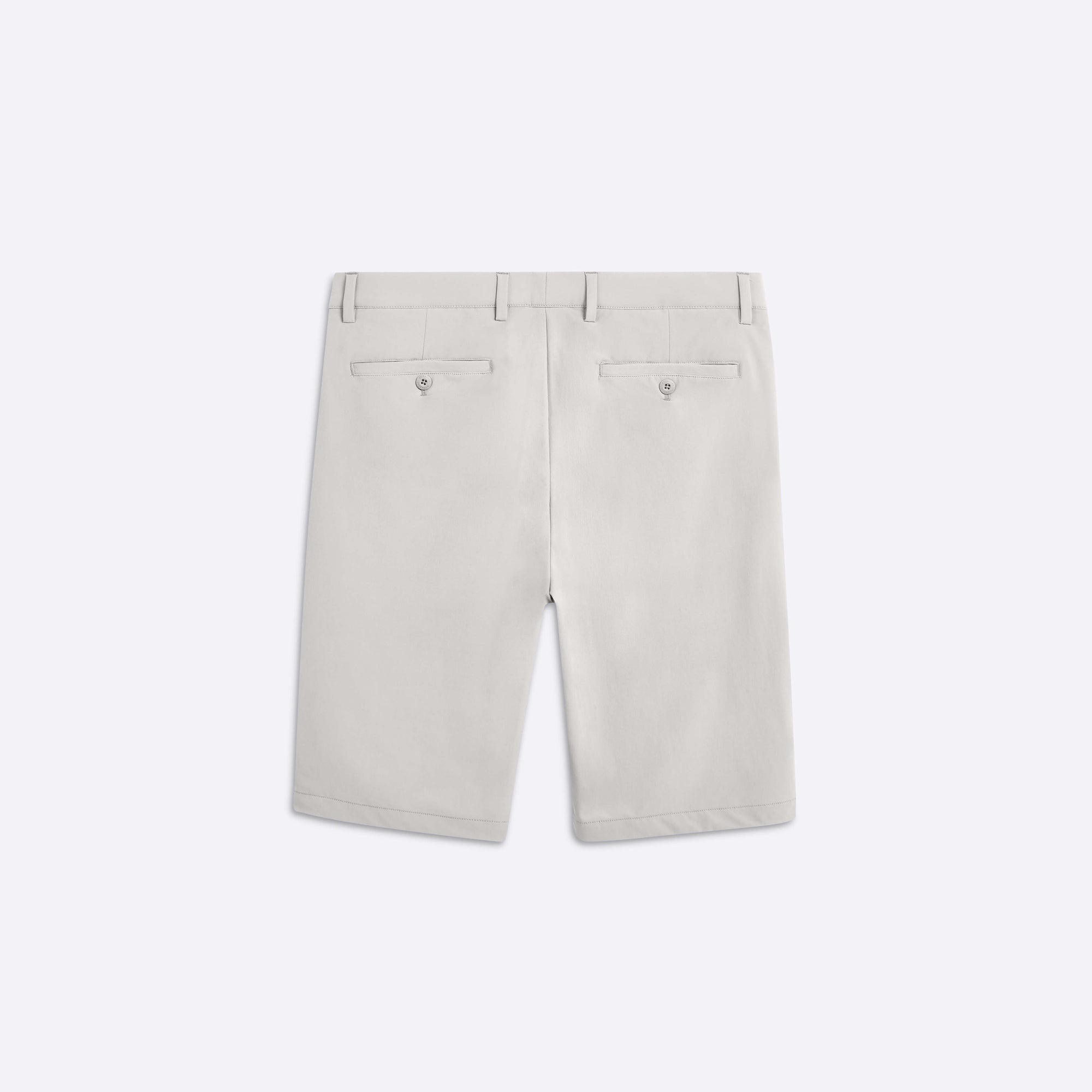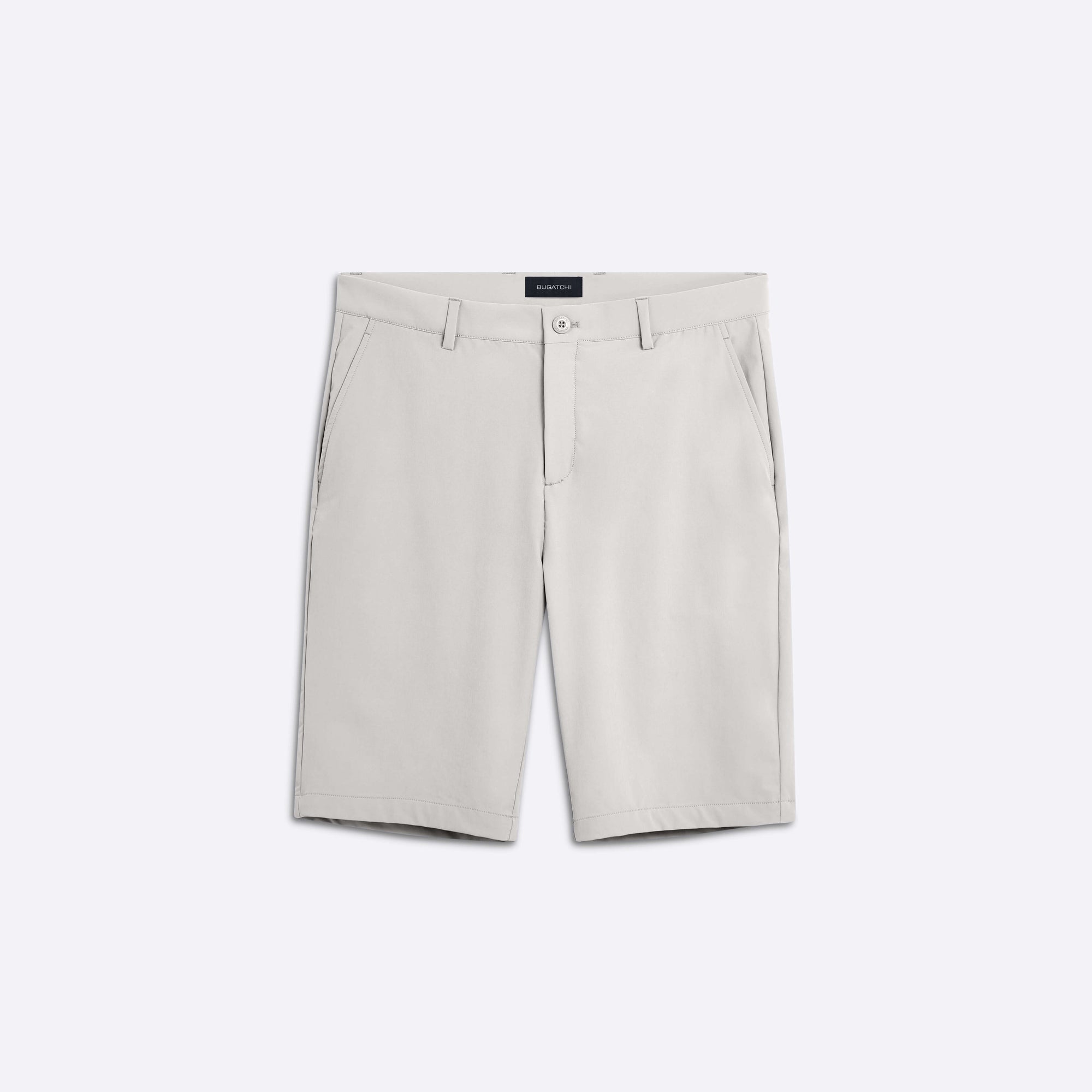 Slim, straight leg, flat front Bermuda shorts in performance nylon fabric with stretch for fit and comfort features zipper and button closure.