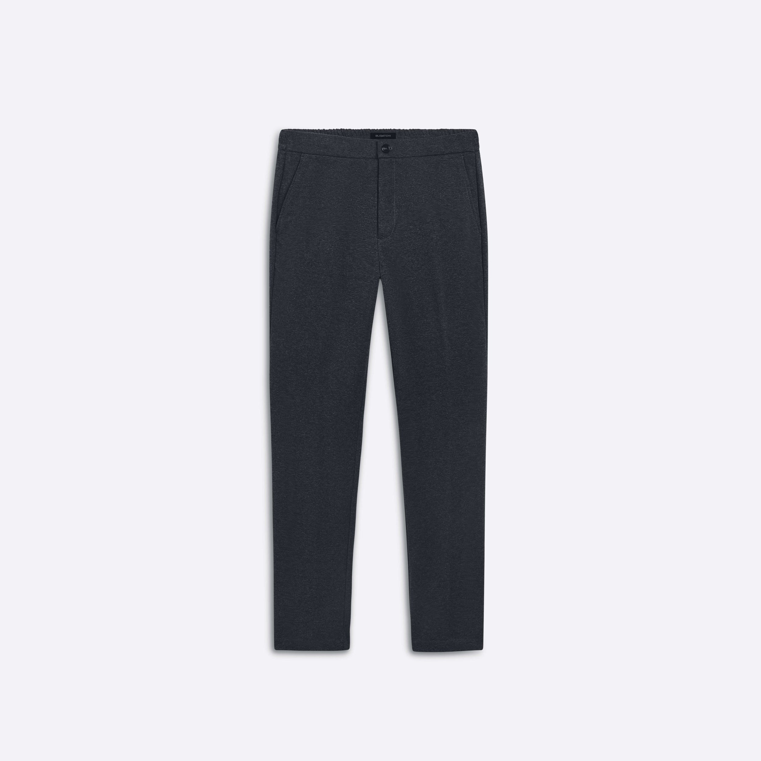 Slim, straight leg, flat front casual pant in knitted stretch cotton blend with elasticized back and zipper and button front closure.