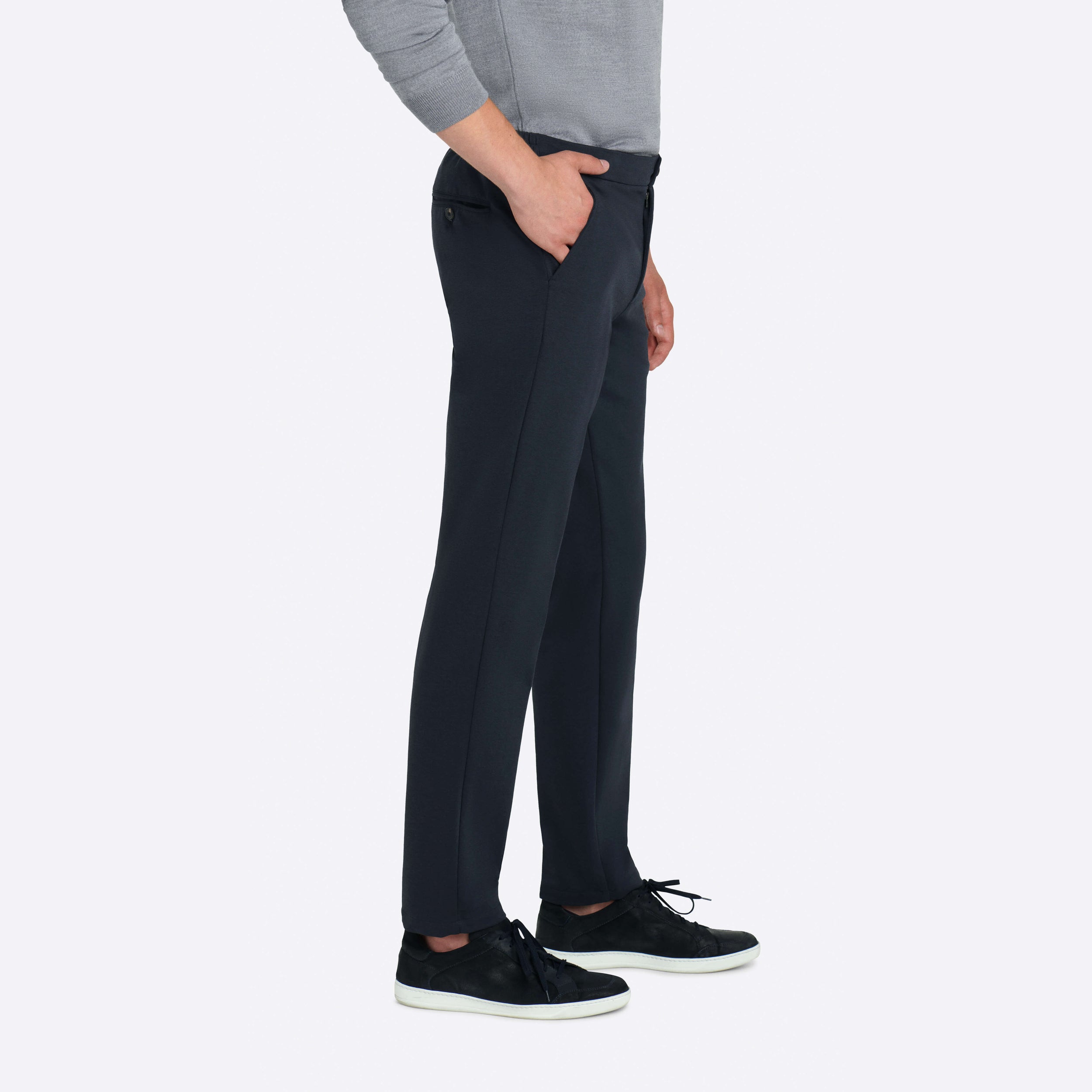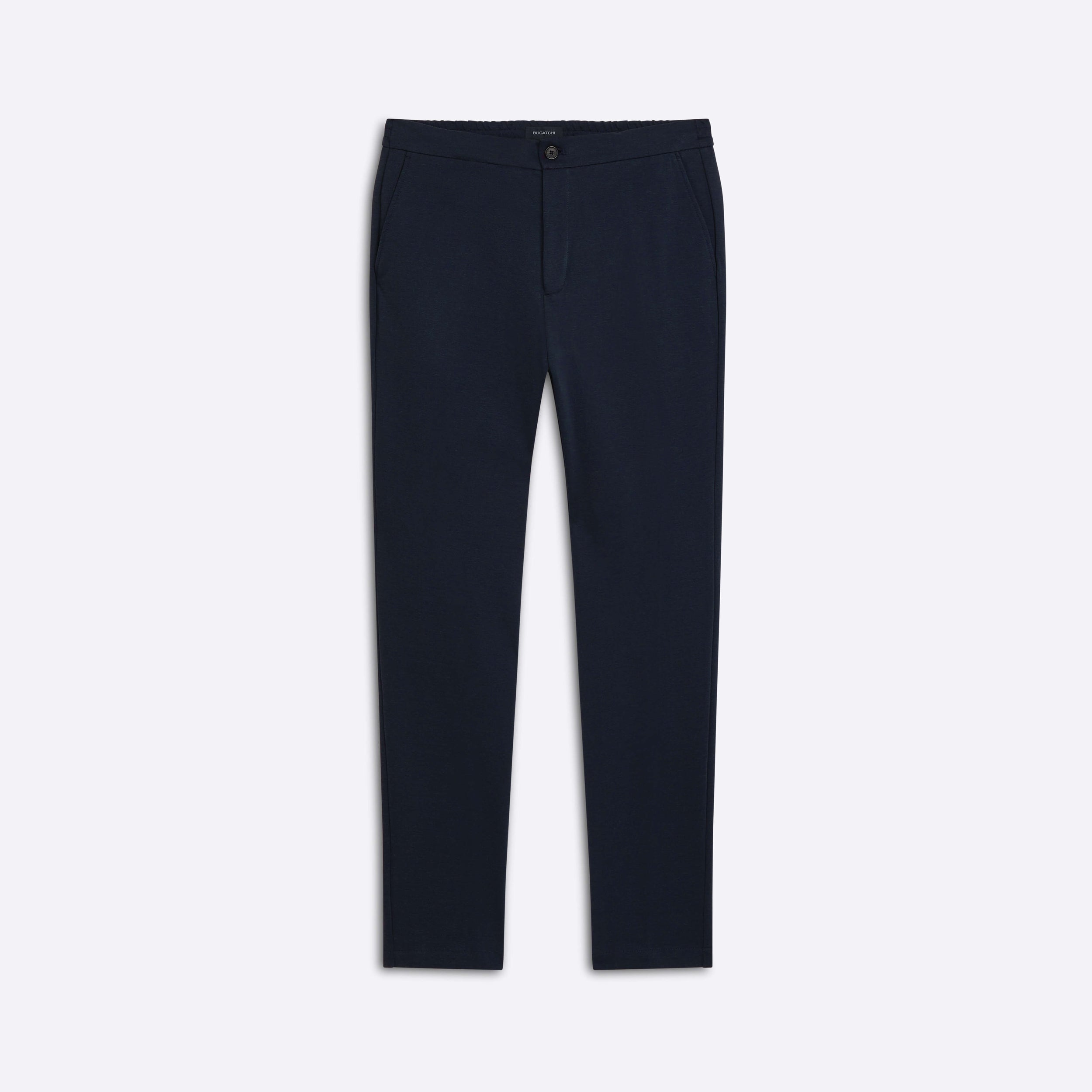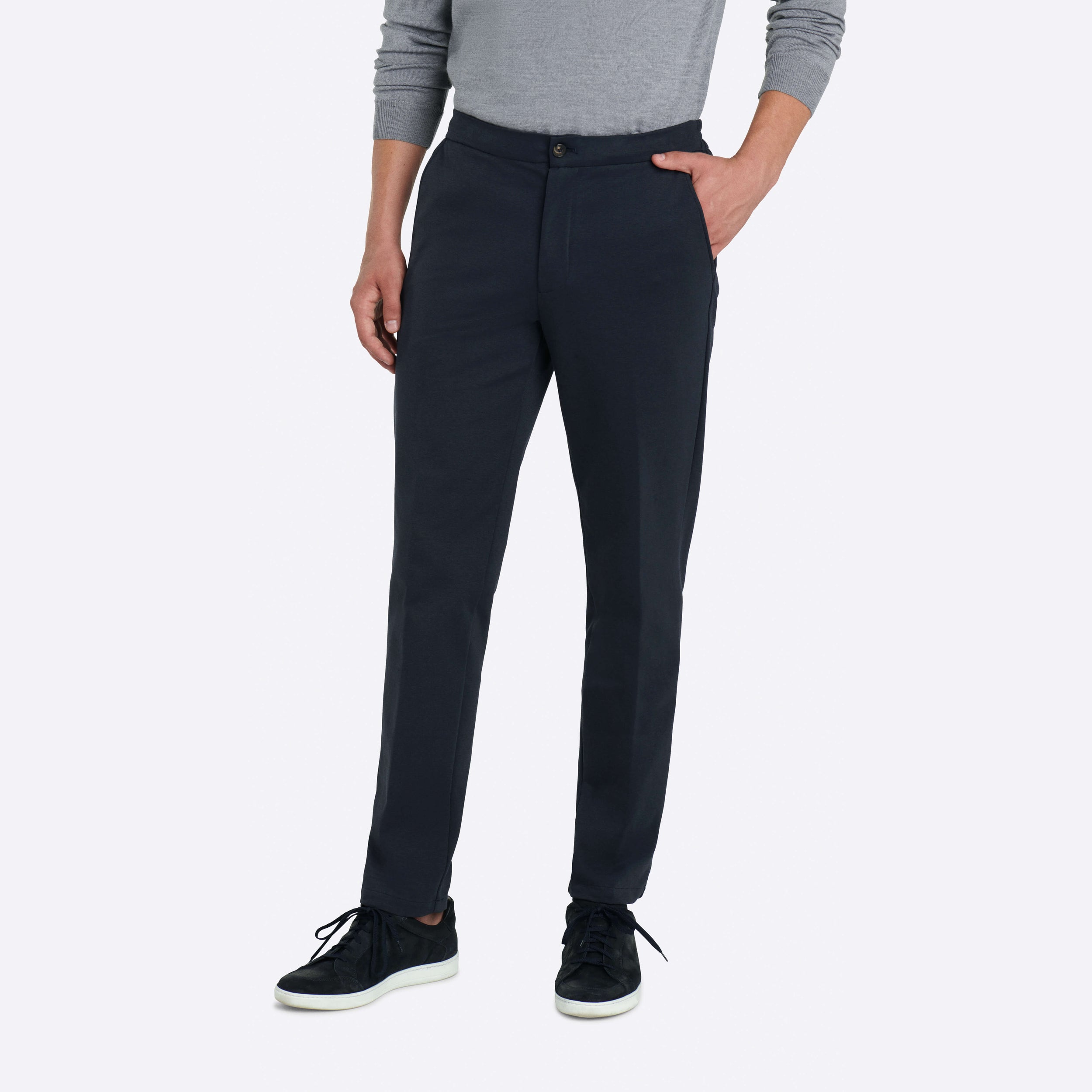 Slim, straight leg, flat front casual pant in knitted stretch cotton blend with elasticized back and zipper and button front closure.