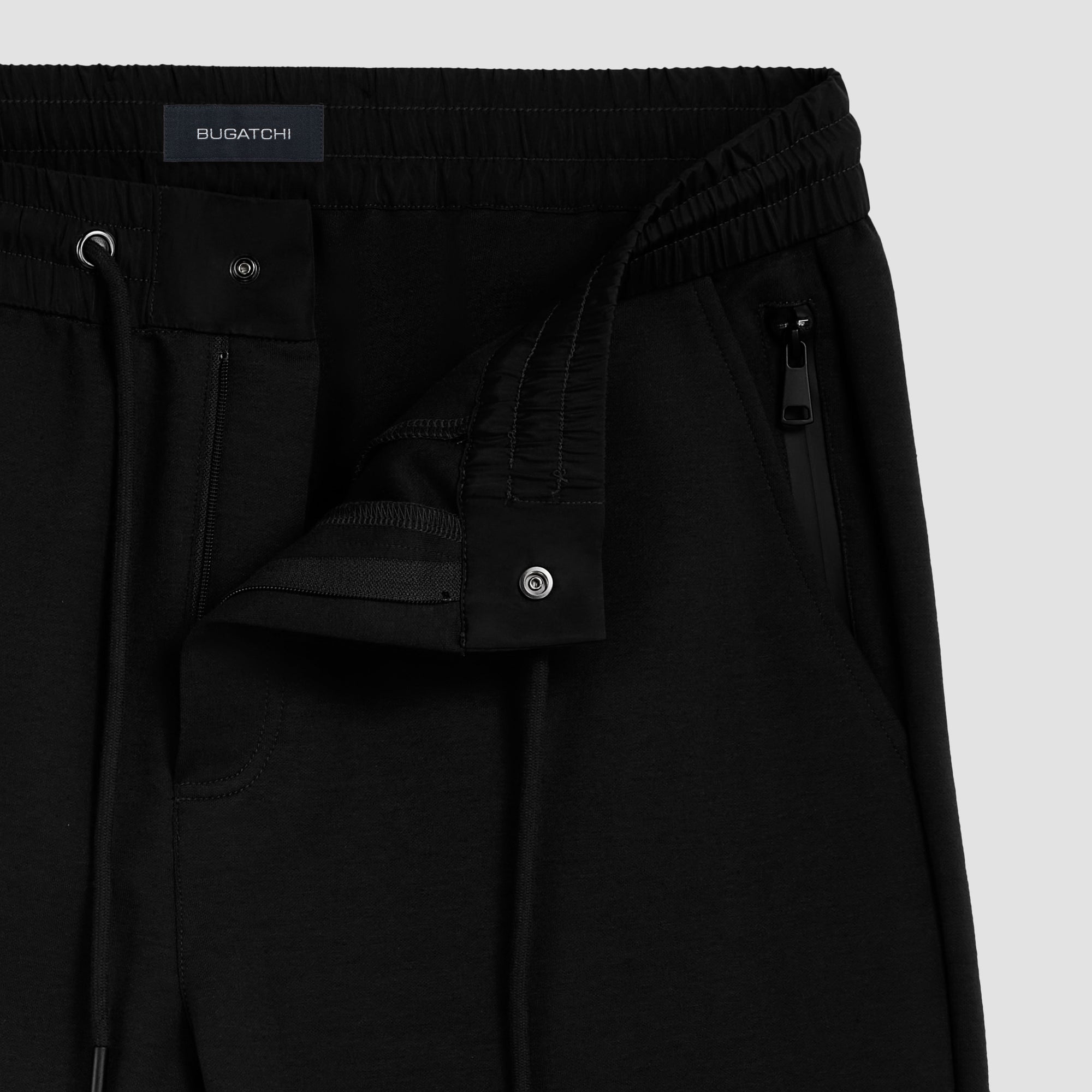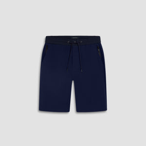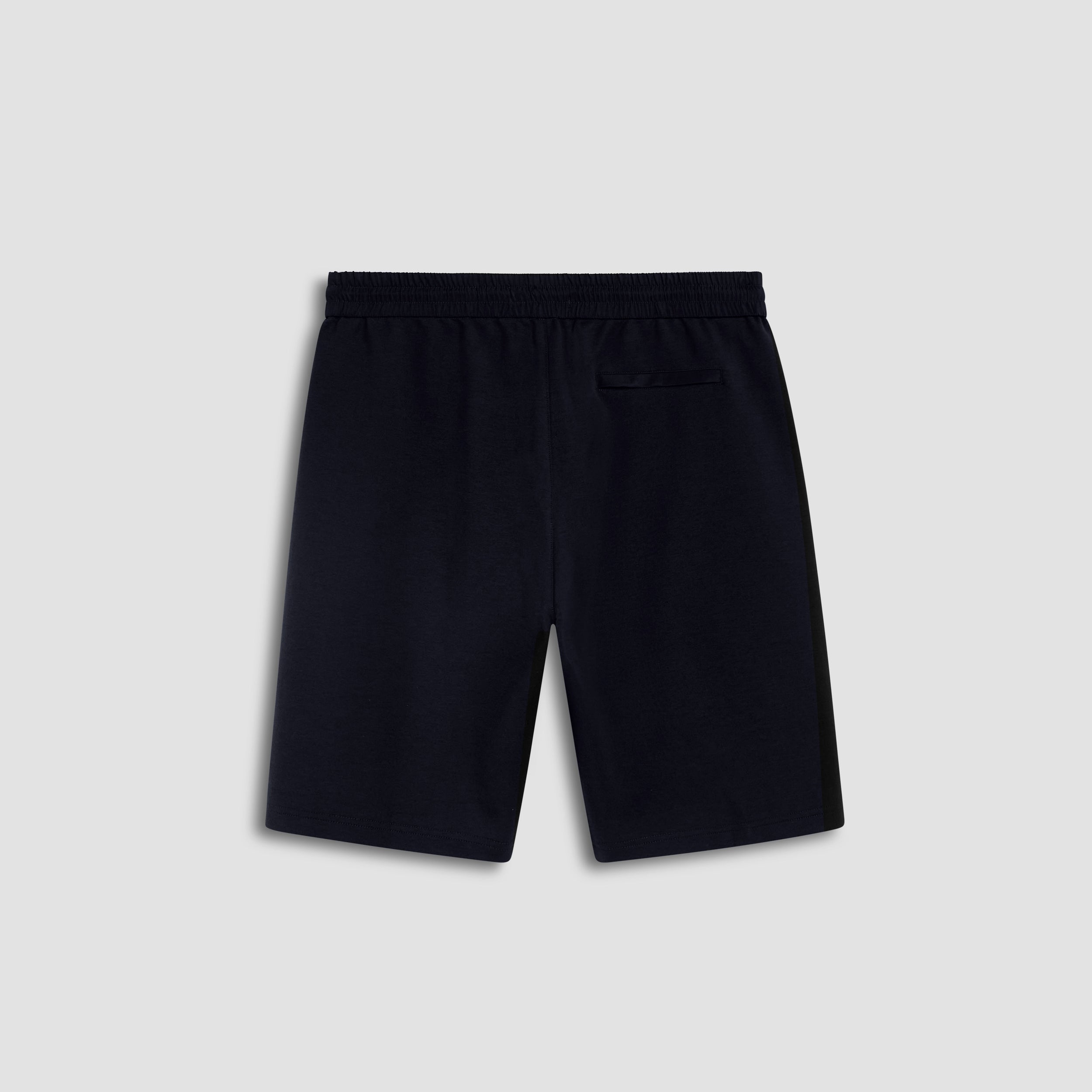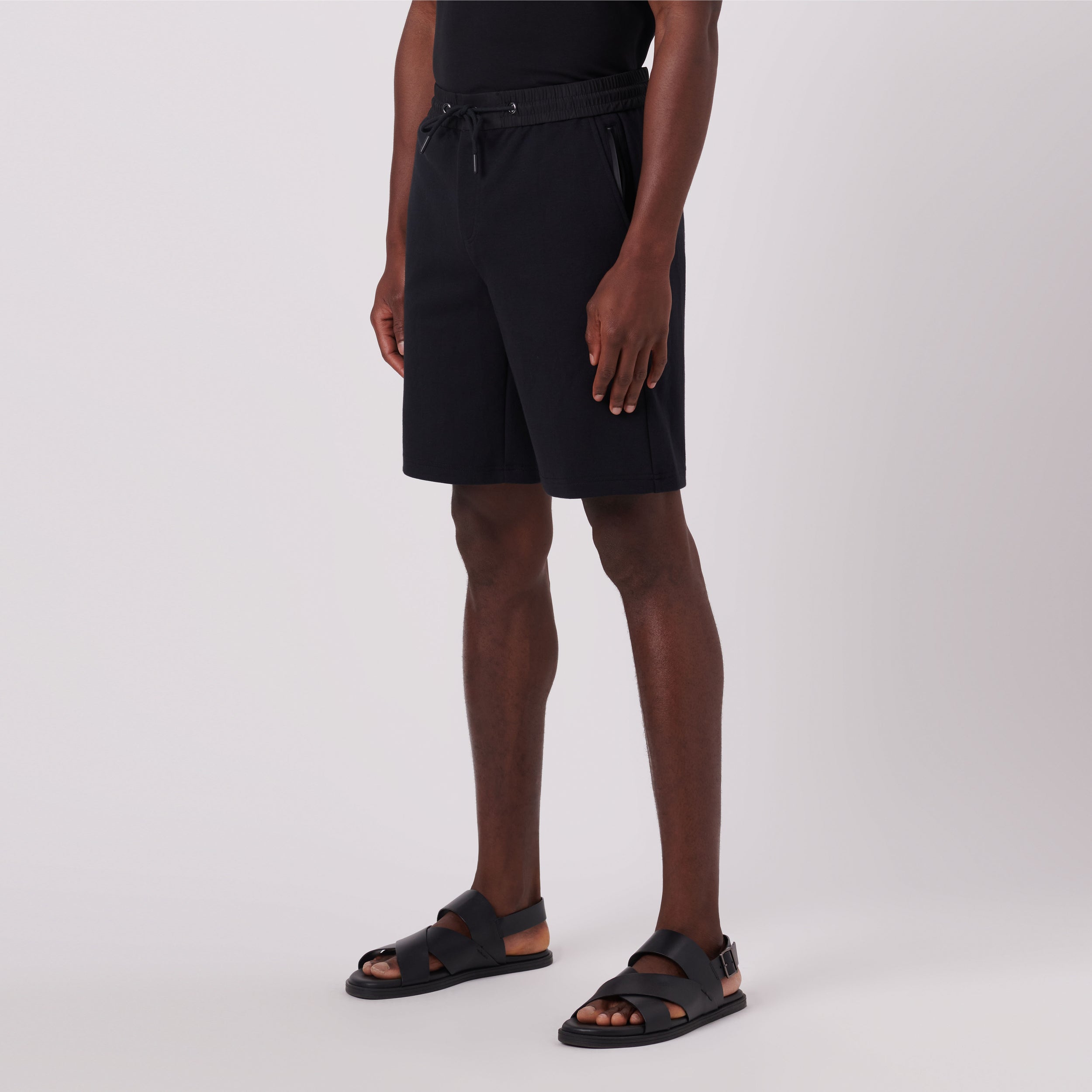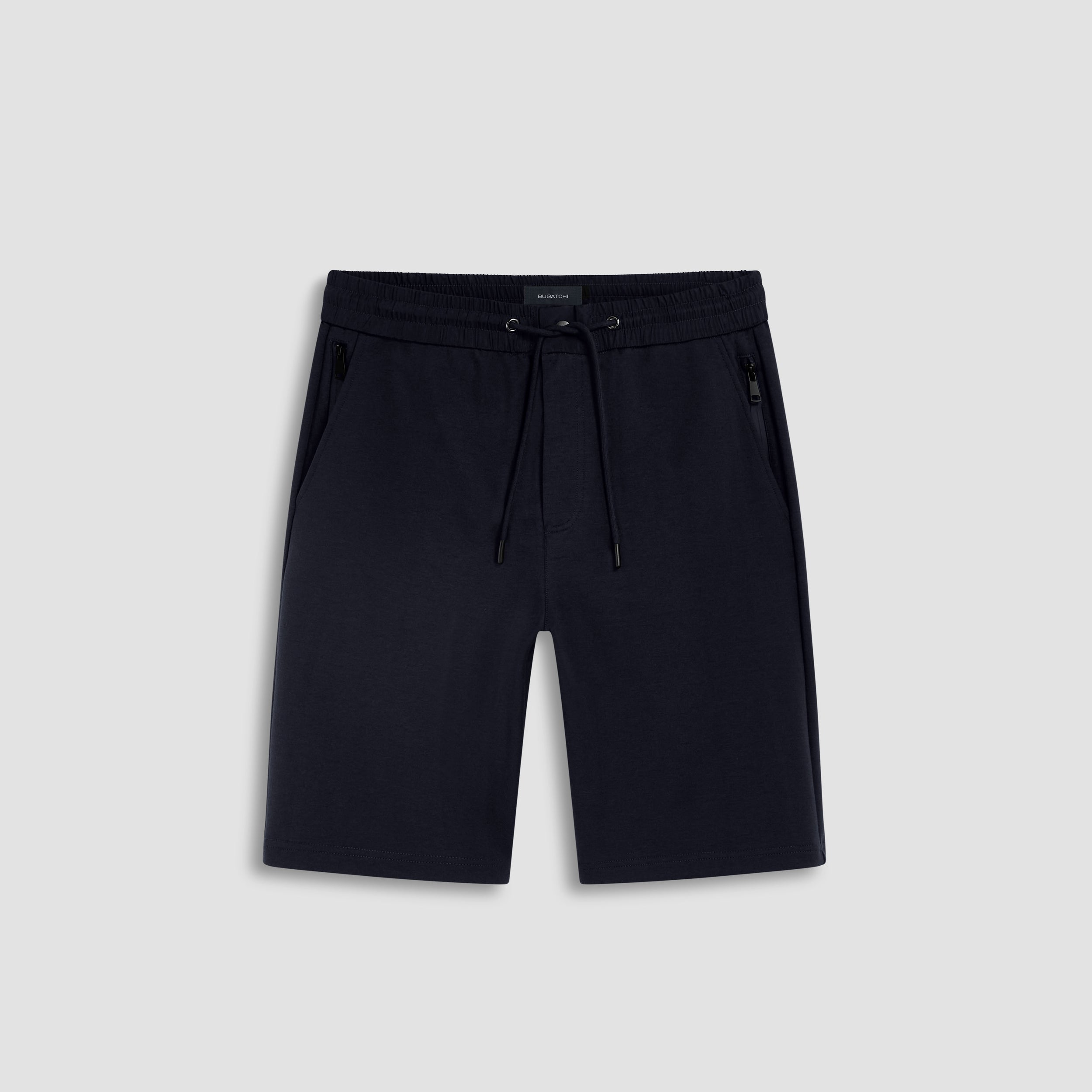 Flat Front knit Bermuda shorts in cotton blend with, zipper and snap fly closure, side zipper pockets and nylon trimmed back pocket, elasticized nylon waistband and drawstring.