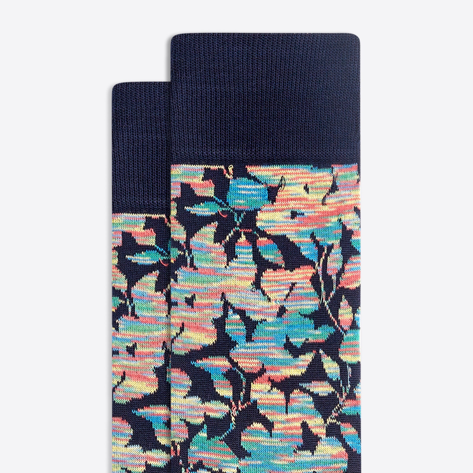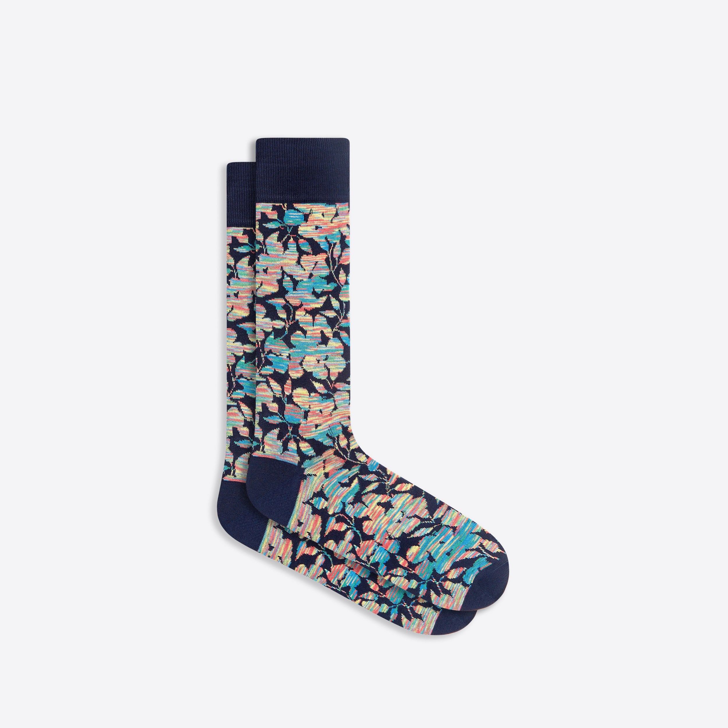 Floral mid-calf socks in fine gauge mercerized cotton blend with rib knit cuff band, hand linked toe and reinforced heel seams. Made in Italy.