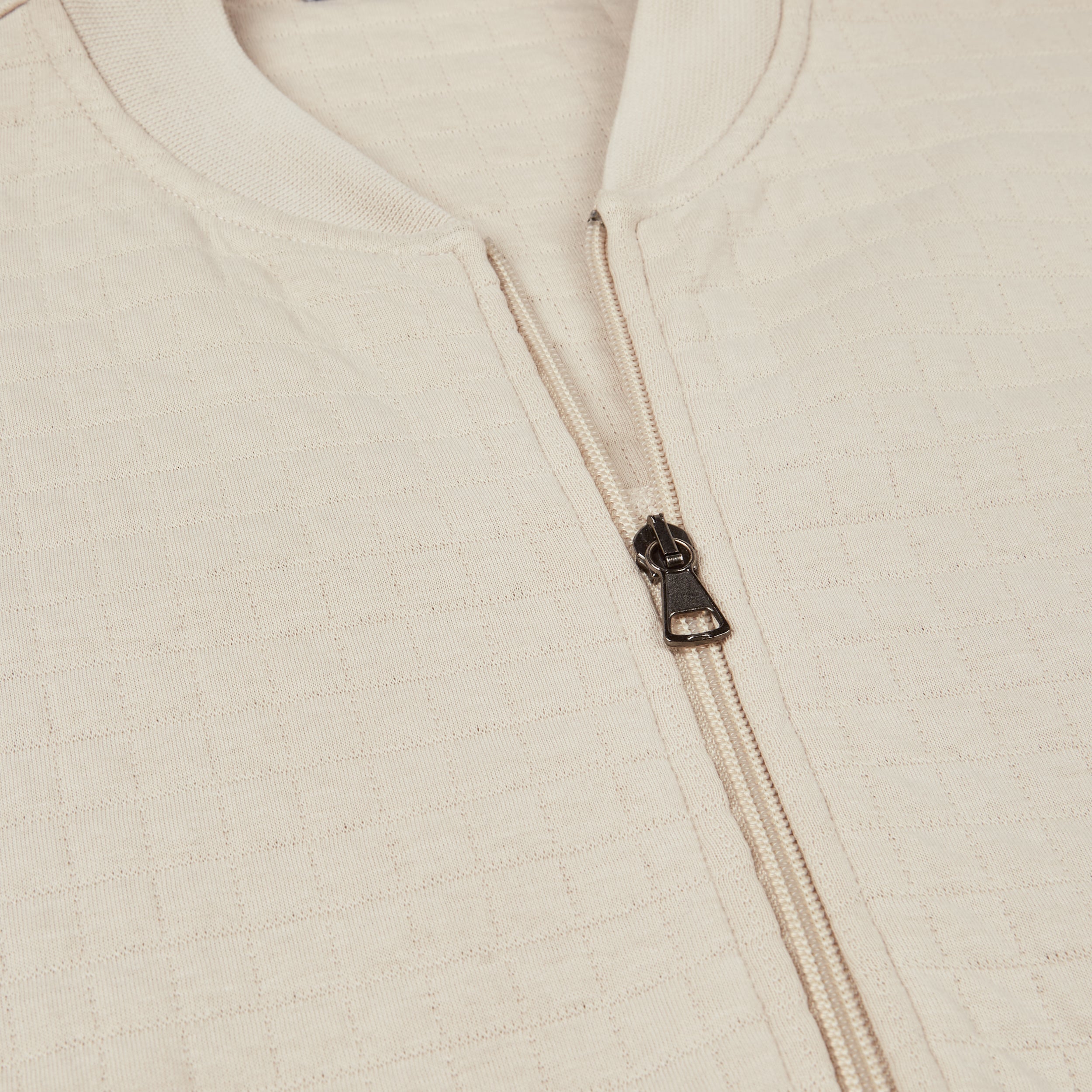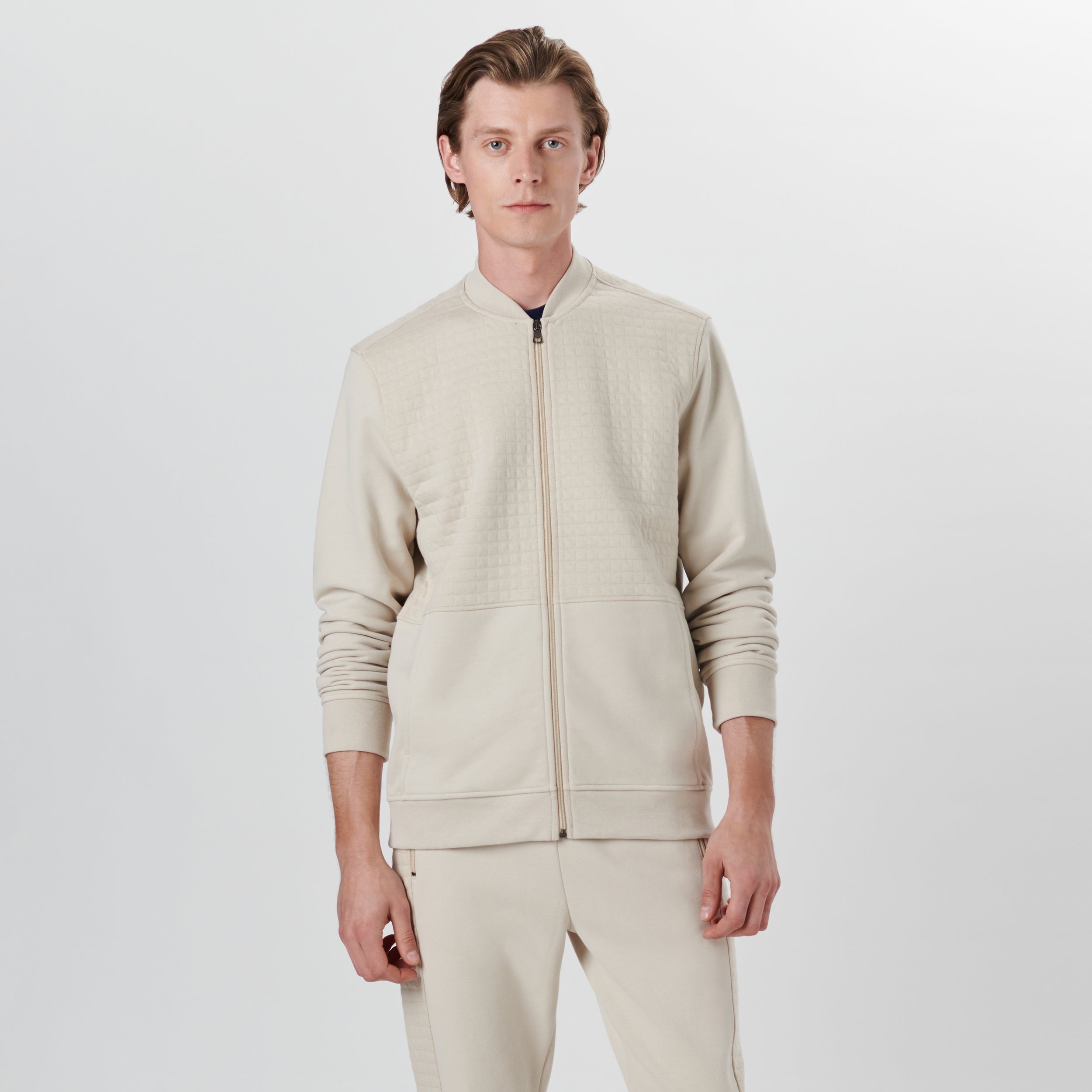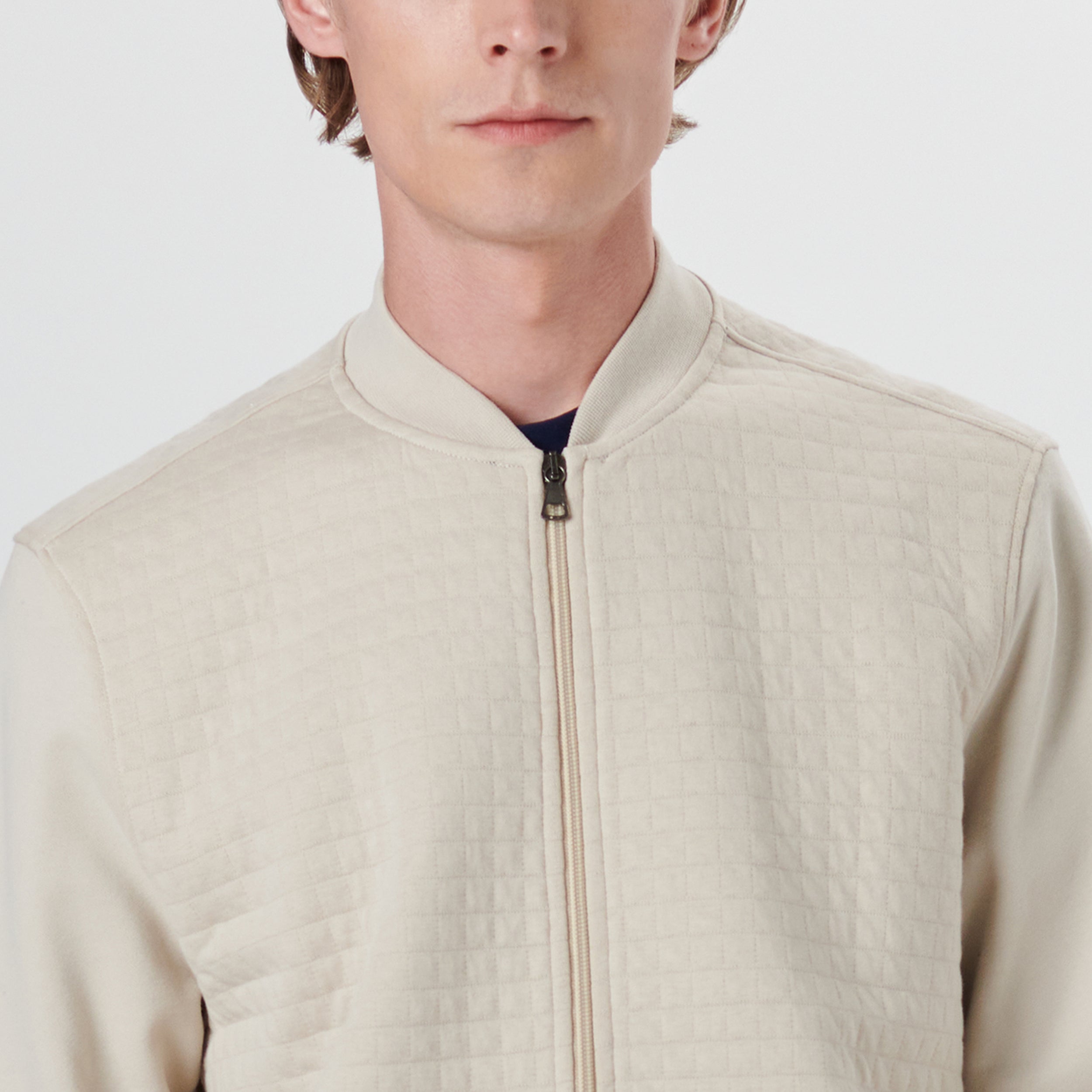 Long sleeve full zip jacket in 100% organic cotton waffle knit with two-way zipper closure, baseball collar, kangaroo pockets, and ribbed cuffs and waistband. Made in Portugal.