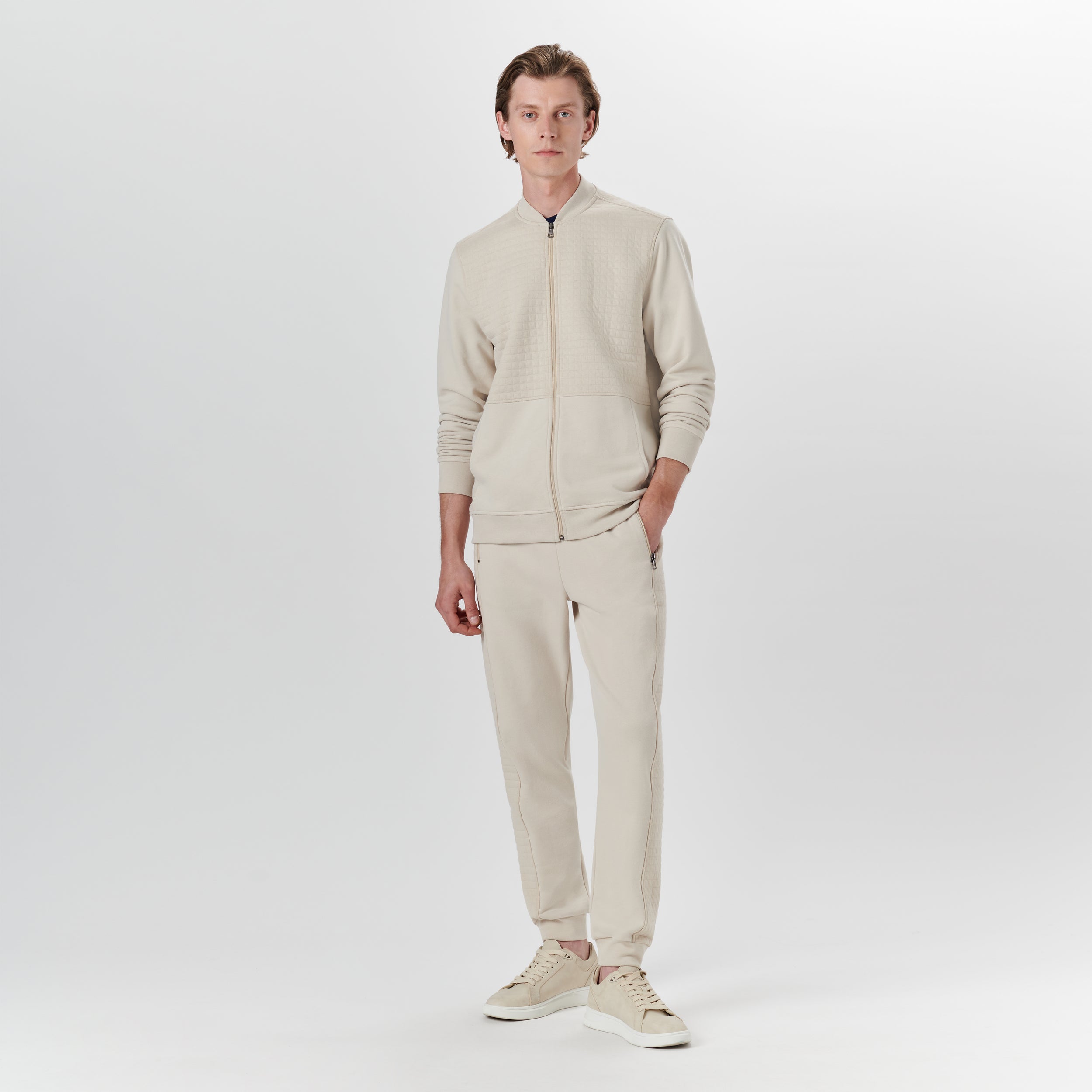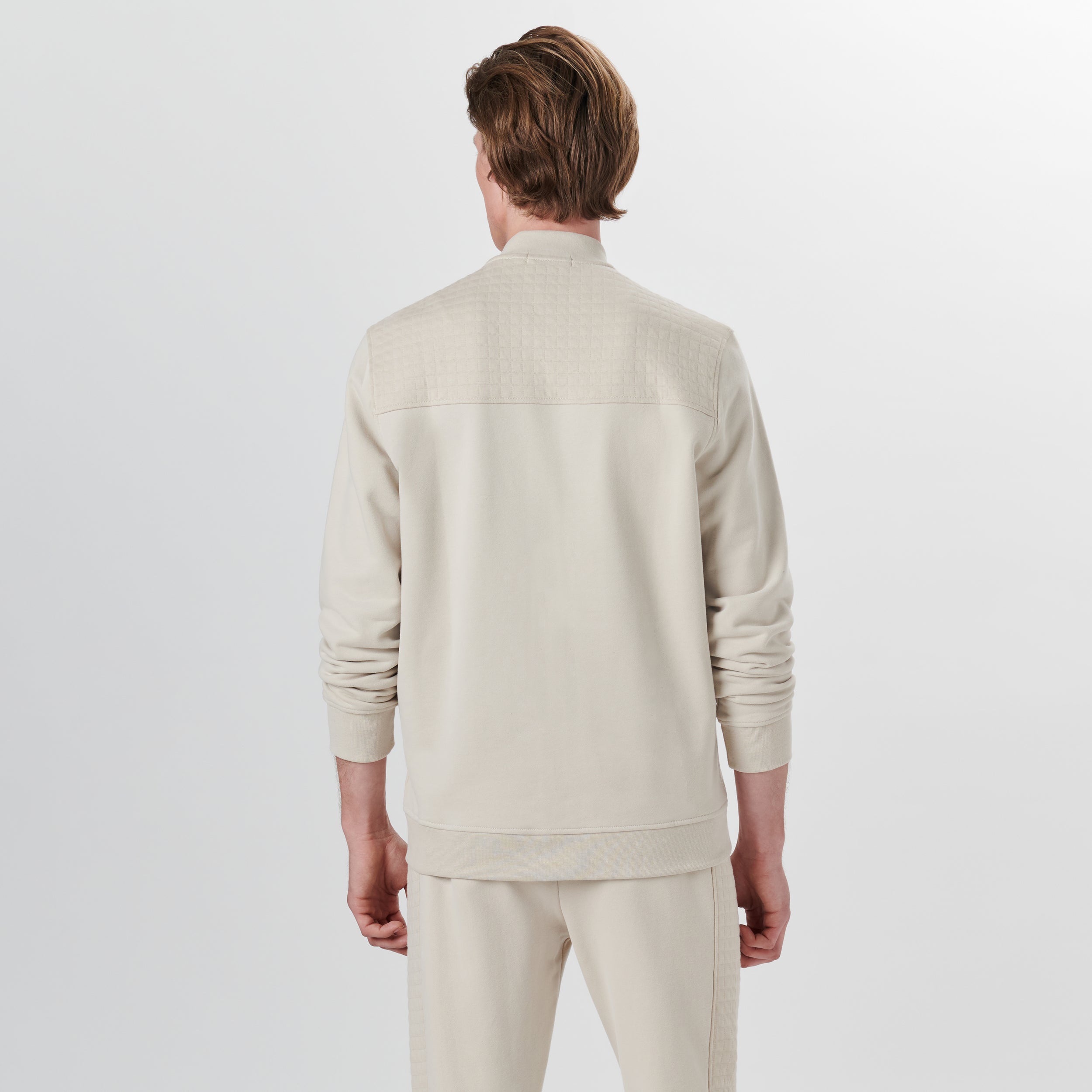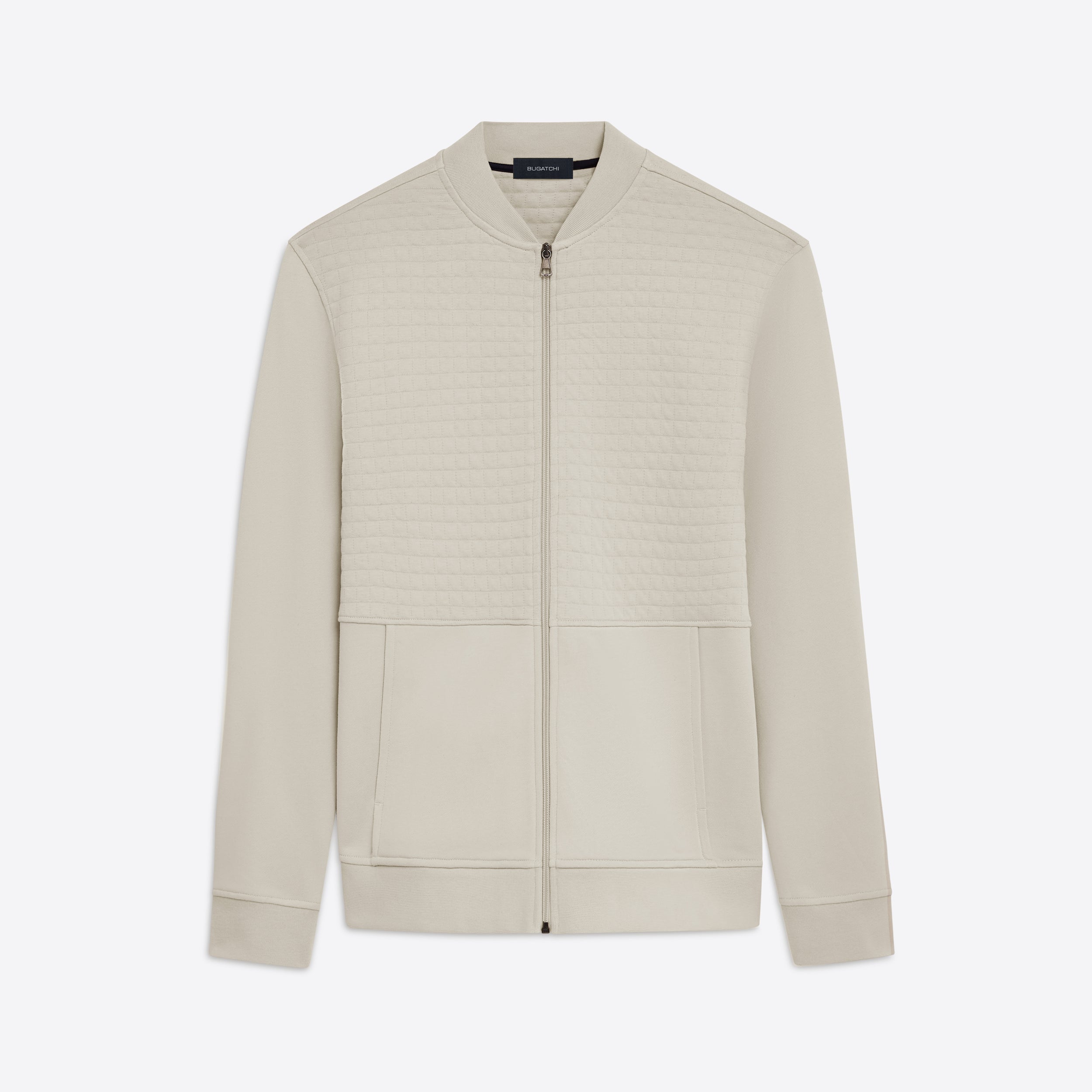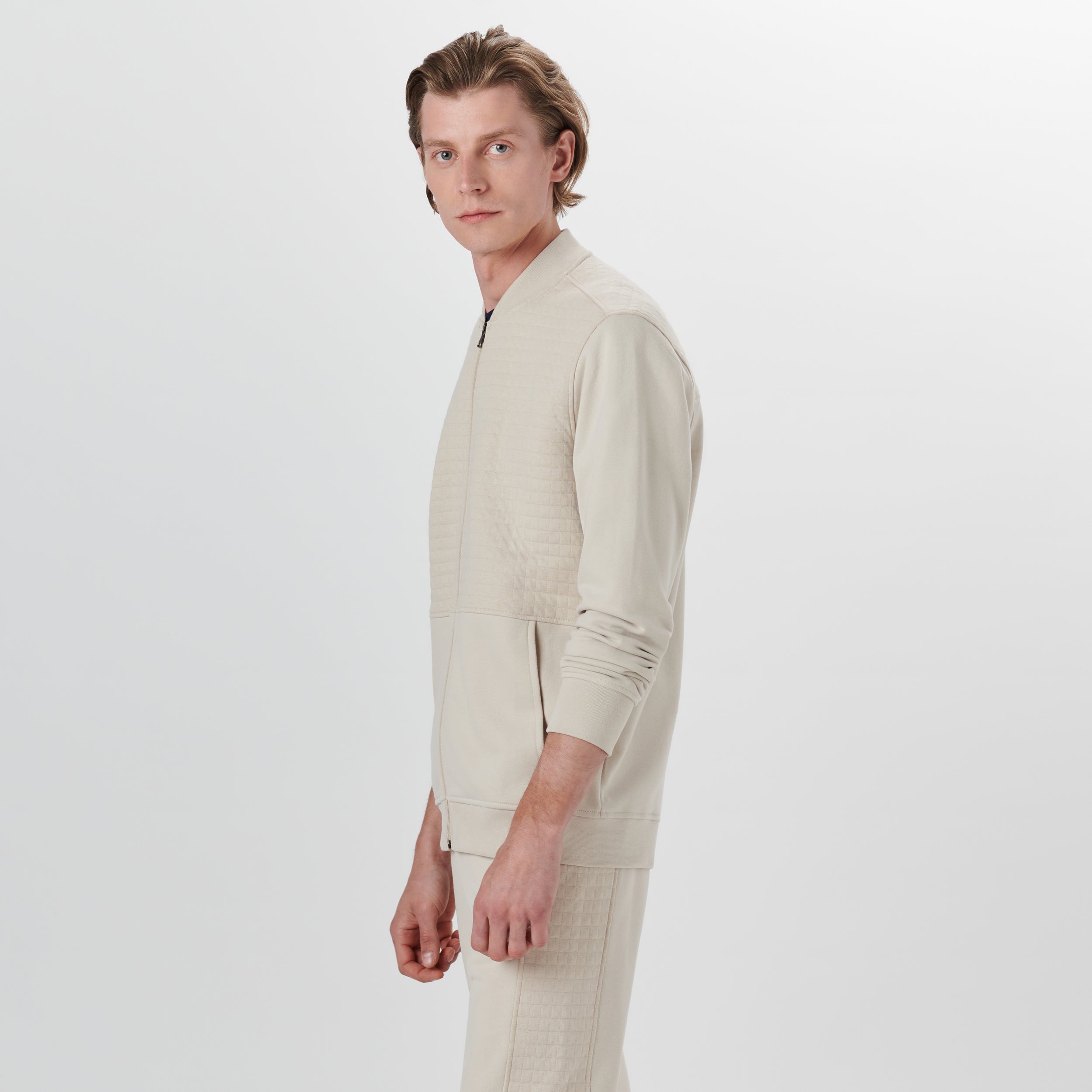 Long sleeve full zip jacket in 100% organic cotton waffle knit with two-way zipper closure, baseball collar, kangaroo pockets, and ribbed cuffs and waistband. Made in Portugal.