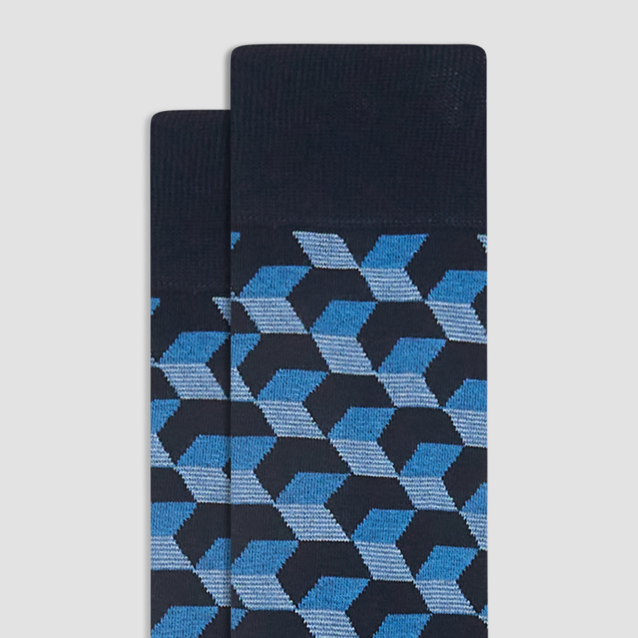 Geometric illusion mid-calf socks in fine gauge mercerized cotton blend with rib knit cuff band, hand linked toe and reinforced heel seams. Made in Italy.