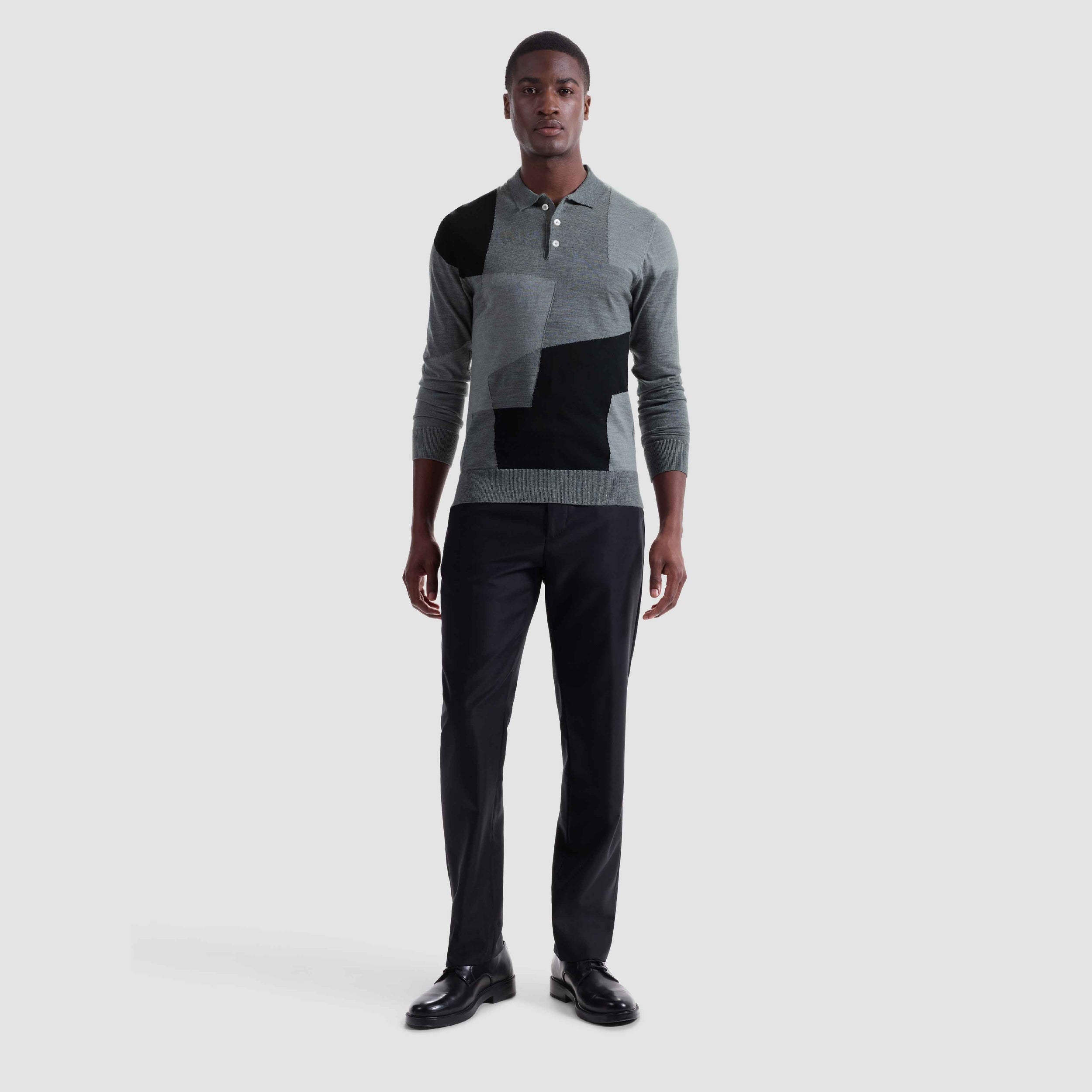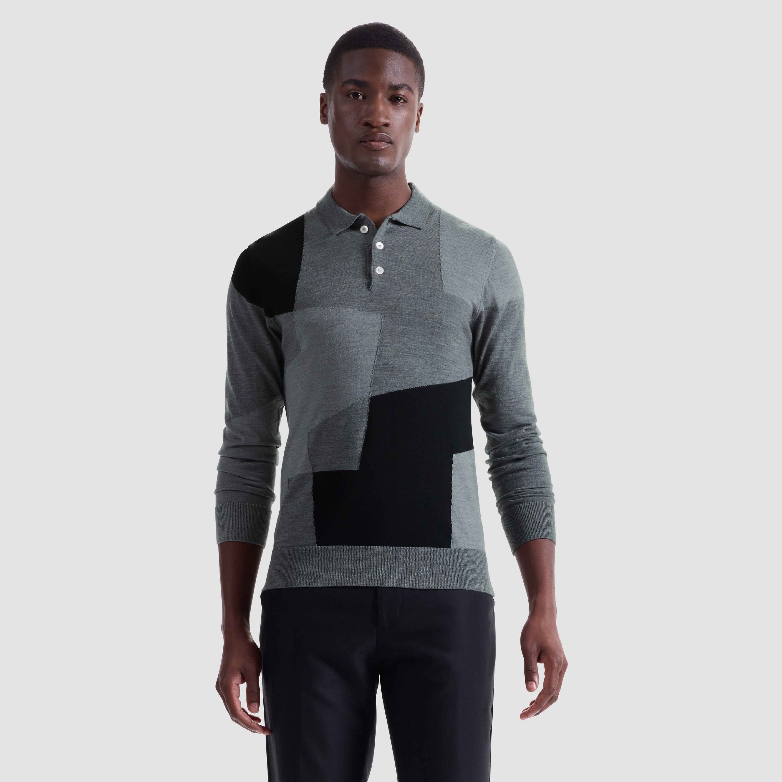 Crafted in Italy from 100% extrafine merino wool, this long-sleeve polo showcases a striking geometric intarsia pattern on the front, contrasted by a melange knit back. Finished with a solid ribbed polo collar, cuffs, and hem, and a three-button placket, it blends bold design with refined comfort.
